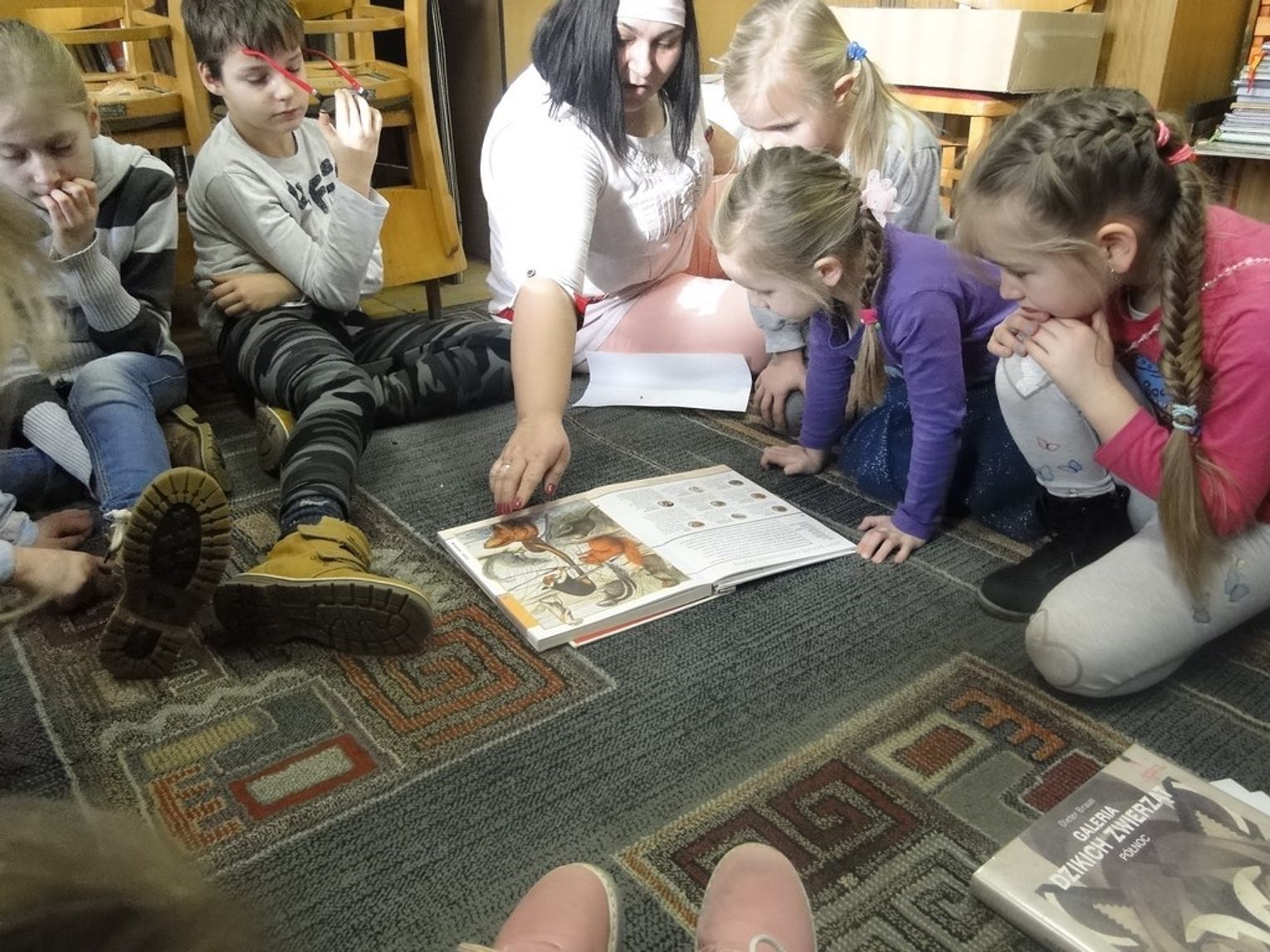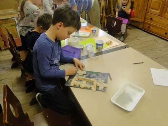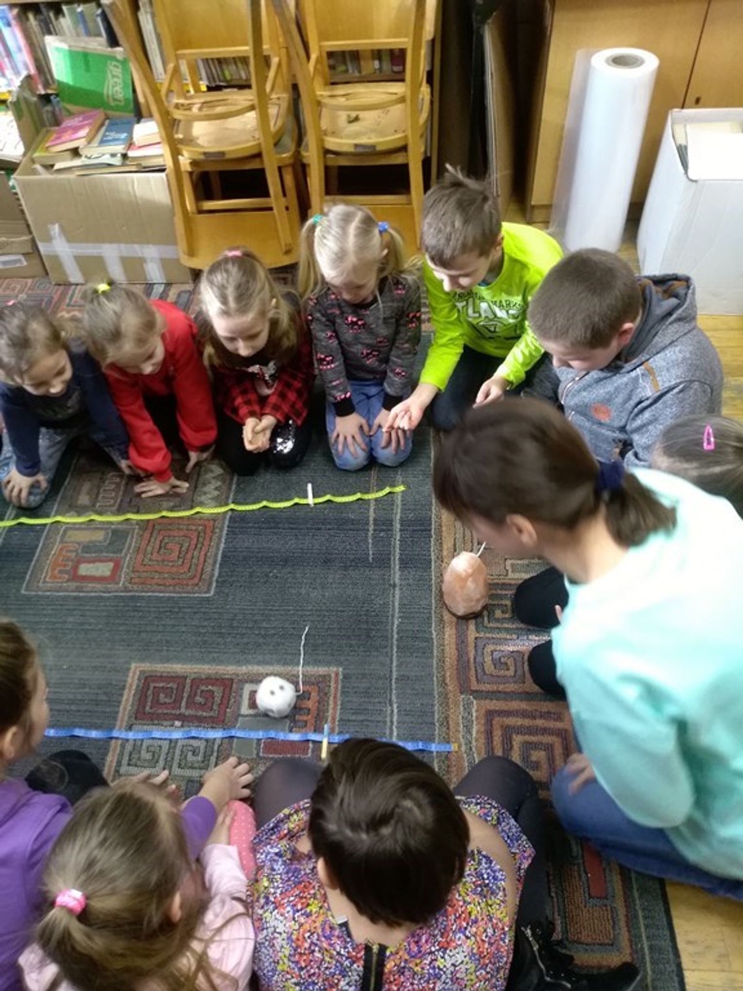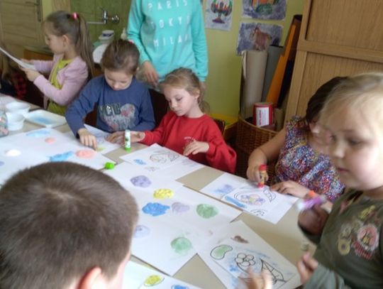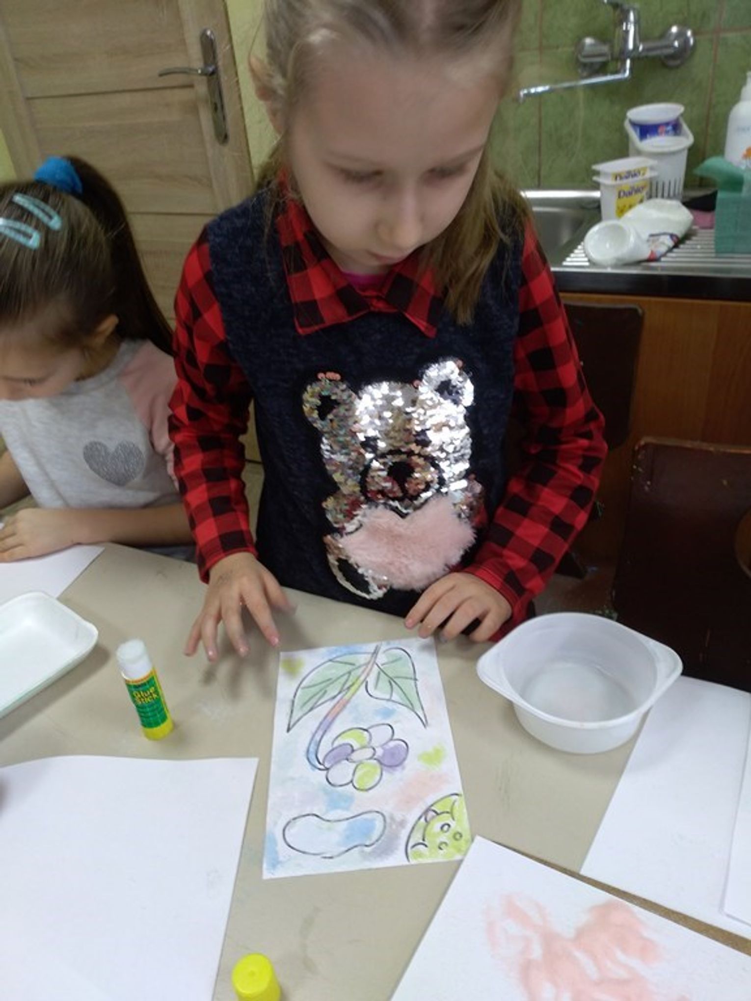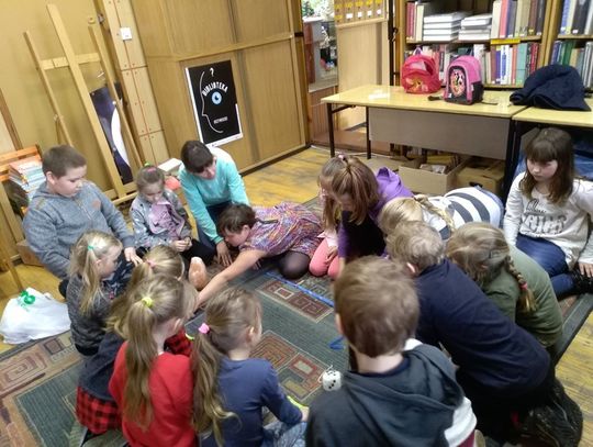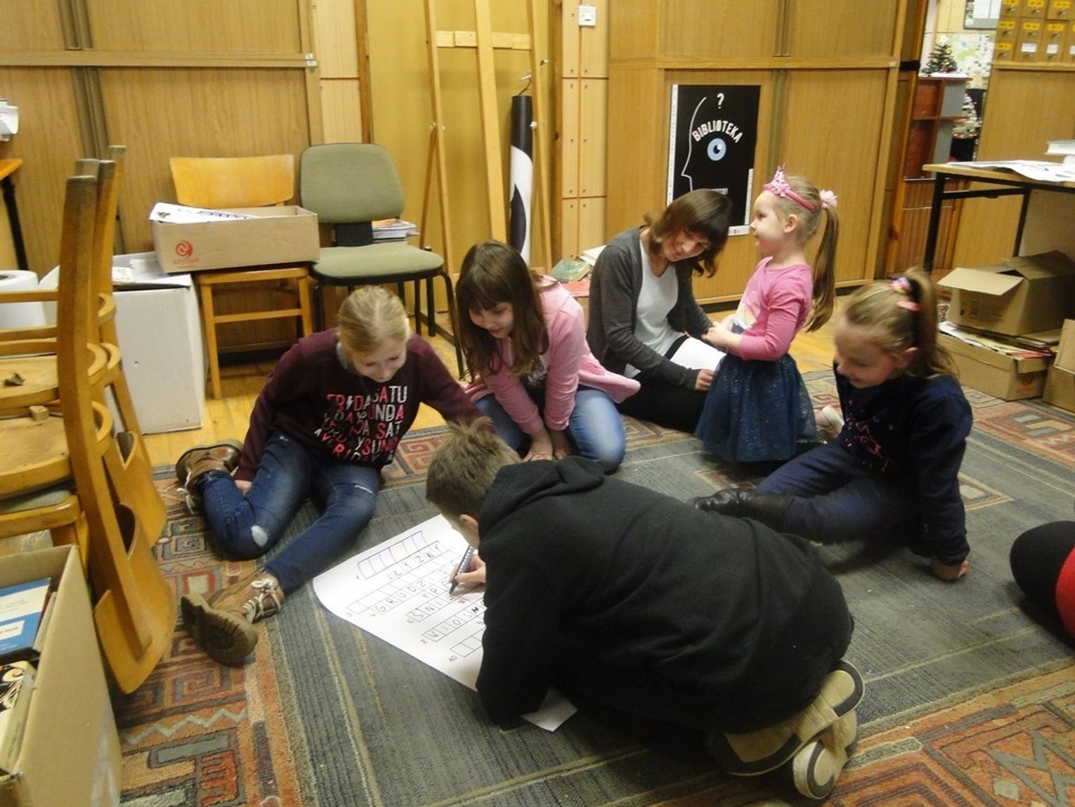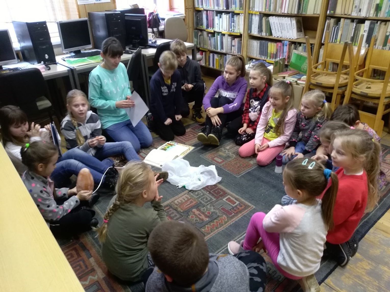 Codzienne literacko – plastyczno – muzyczne spotkania rozpoczynały się w bibliotece, gdzie dzieci zapoznawały się z tematem dnia, m.in.: „Wędrówki, podróże, wycieczki z zimowym misiem”, „Zatrzymujemy zimę na kamykach” - tajemnice prehistorii, „Czarujemy zimowy pejzaż” - spotkanie integracyjne z mieszkańcami Domu Pomocy Społecznej w Moryniu, „Igliczki-śnieżyczki” - rozpoznawanie różnych gatunków drzew iglastych, „Dzielimy się szczęściem” - tematem zajęć był dziadek i babcia, „Zima solą malowana” - legenda o Wieliczce, „Spotkanie z rudą wiewiórką” - portret wiewiórki z szyszką, „Bąbelkowe czary-mary” - wykonanie pracy plastycznej przy pomocy folii bąbelkowej czy wreszcie „Jaskinia lodowa” - spotkanie z p. Urszulą Kaczmarek – pasjonatką skamielin, kamieni i skał oraz zaprojektowanie własnej jaskini przy wykorzystaniu różnych technik.