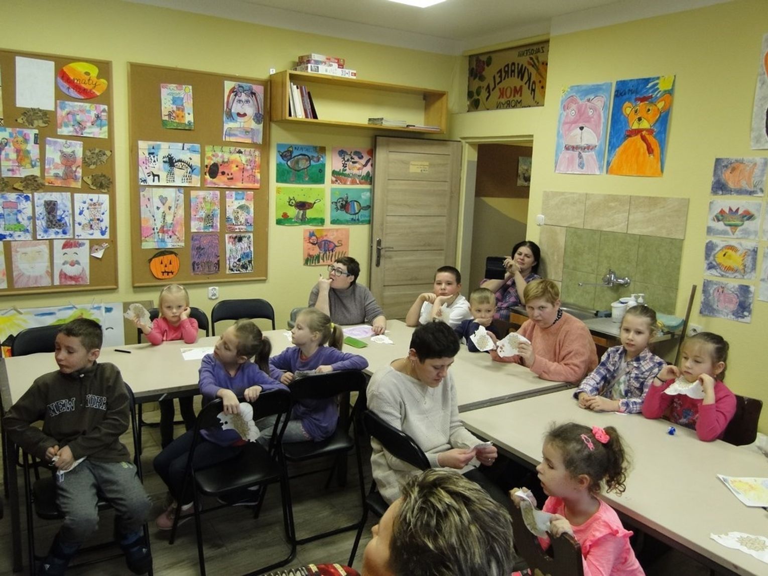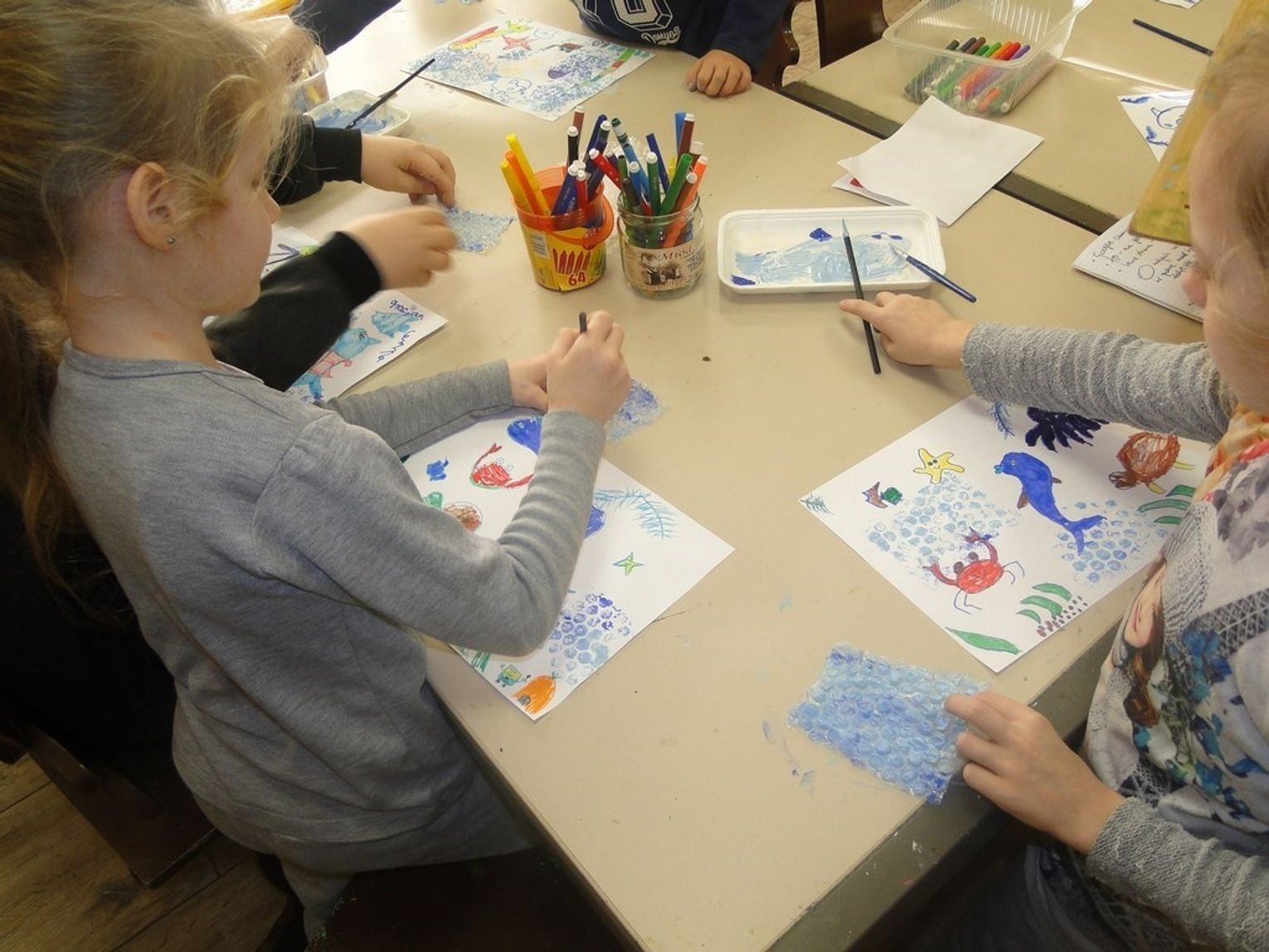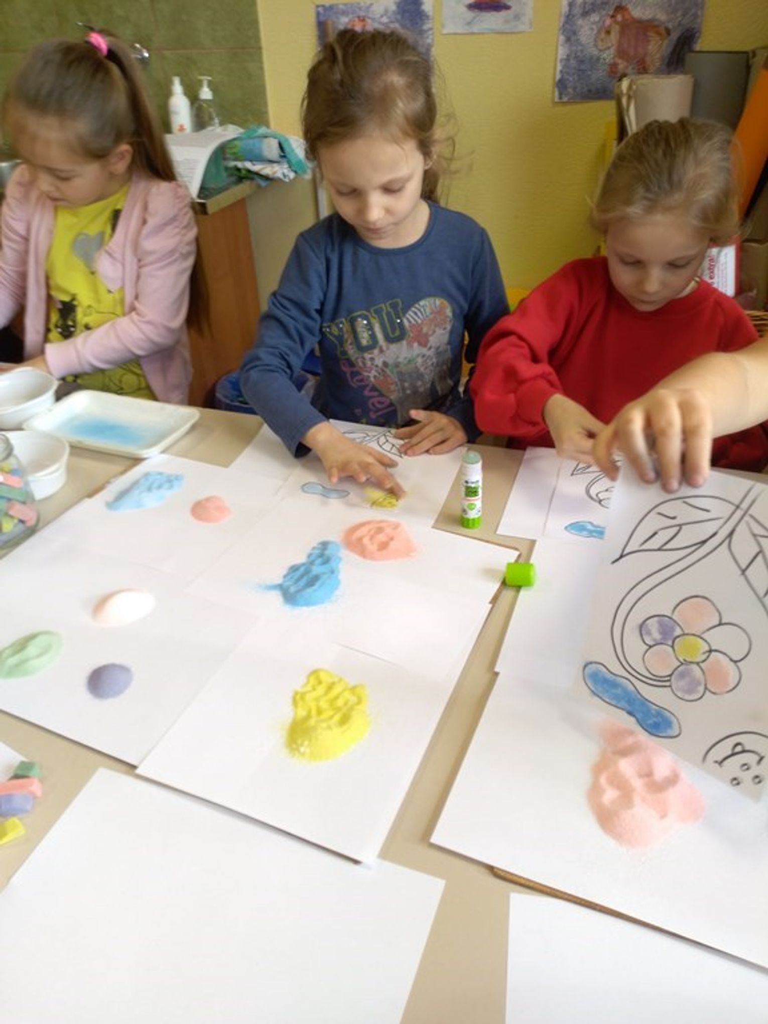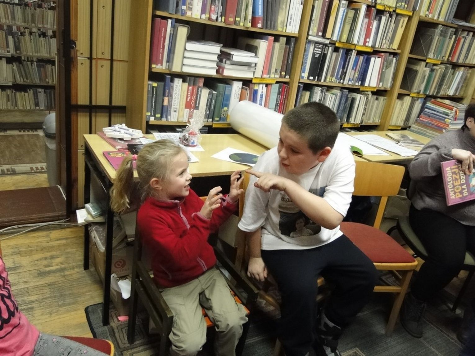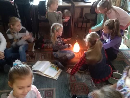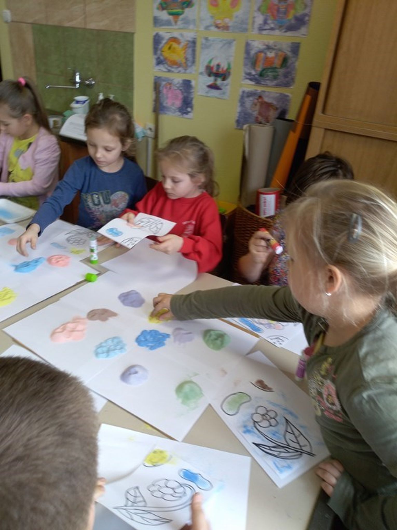 Codzienne literacko – plastyczno – muzyczne spotkania rozpoczynały się w bibliotece, gdzie dzieci zapoznawały się z tematem dnia, m.in.: „Wędrówki, podróże, wycieczki z zimowym misiem”, „Zatrzymujemy zimę na kamykach” - tajemnice prehistorii, „Czarujemy zimowy pejzaż” - spotkanie integracyjne z mieszkańcami Domu Pomocy Społecznej w Moryniu, „Igliczki-śnieżyczki” - rozpoznawanie różnych gatunków drzew iglastych, „Dzielimy się szczęściem” - tematem zajęć był dziadek i babcia, „Zima solą malowana” - legenda o Wieliczce, „Spotkanie z rudą wiewiórką” - portret wiewiórki z szyszką, „Bąbelkowe czary-mary” - wykonanie pracy plastycznej przy pomocy folii bąbelkowej czy wreszcie „Jaskinia lodowa” - spotkanie z p. Urszulą Kaczmarek – pasjonatką skamielin, kamieni i skał oraz zaprojektowanie własnej jaskini przy wykorzystaniu różnych technik.