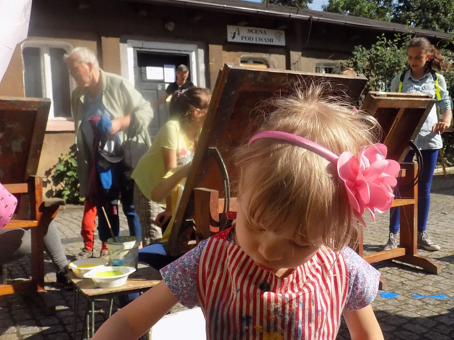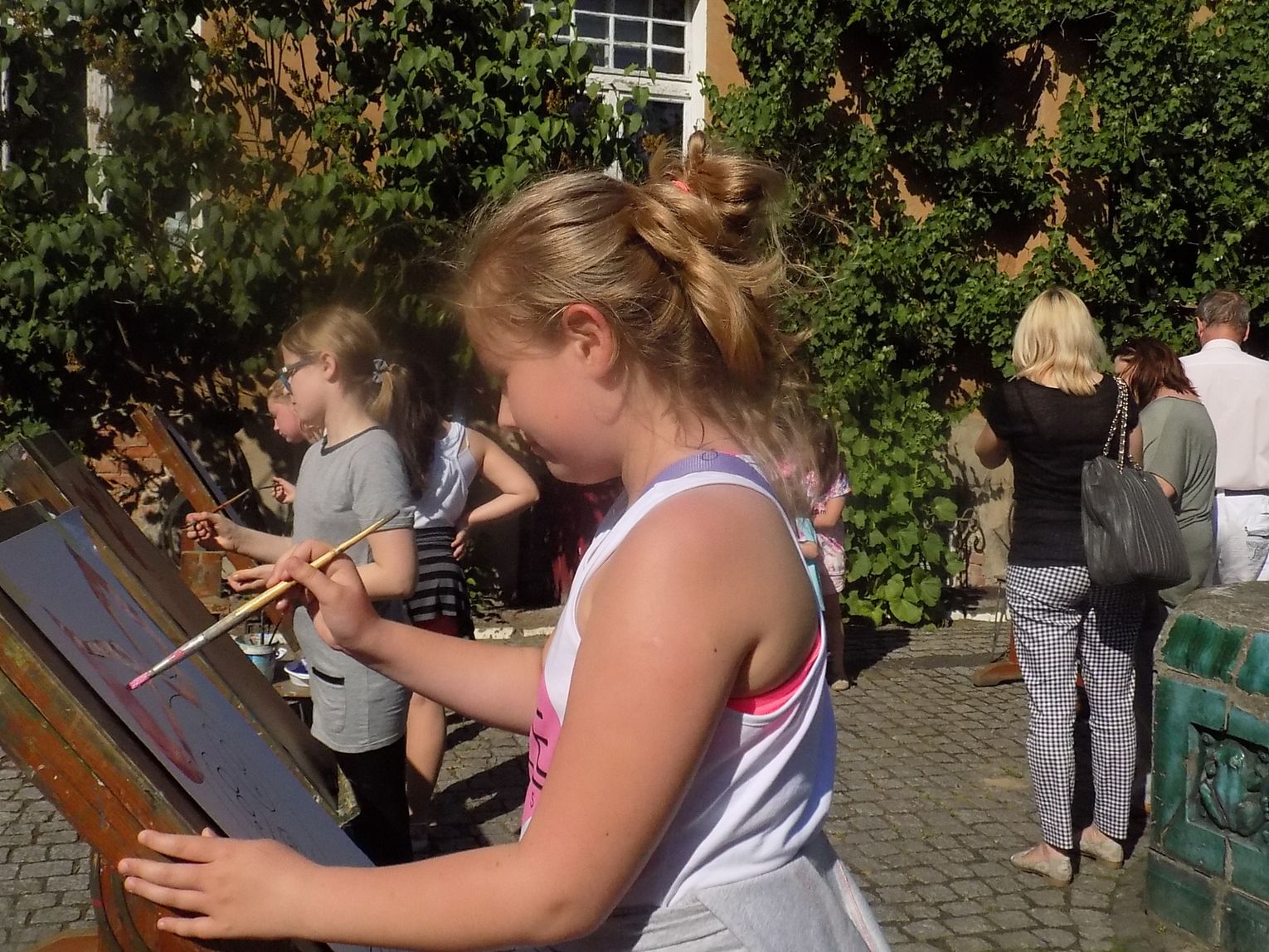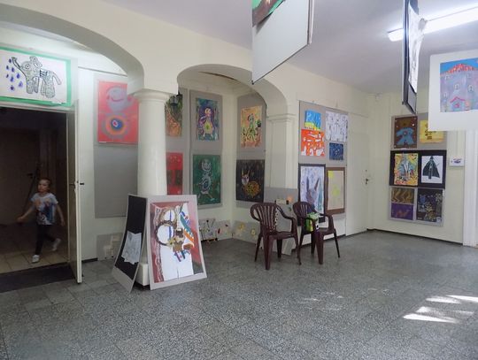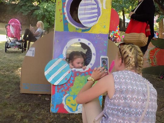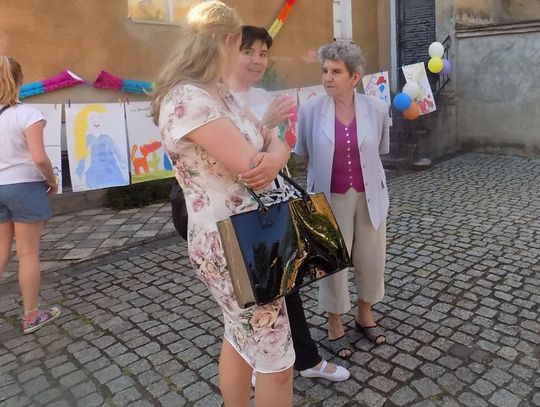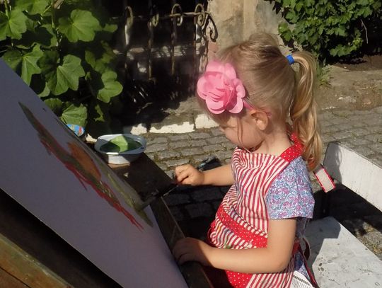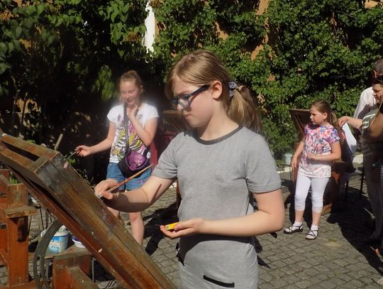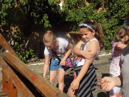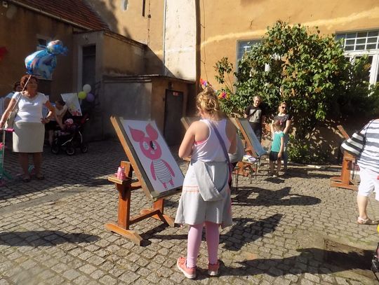Na dziedzińcu przy fontannie rozstawiono sztalugi aby można było malować farbami. Zainteresowanie bardzo duże i to nie tylko wśród dzieci.