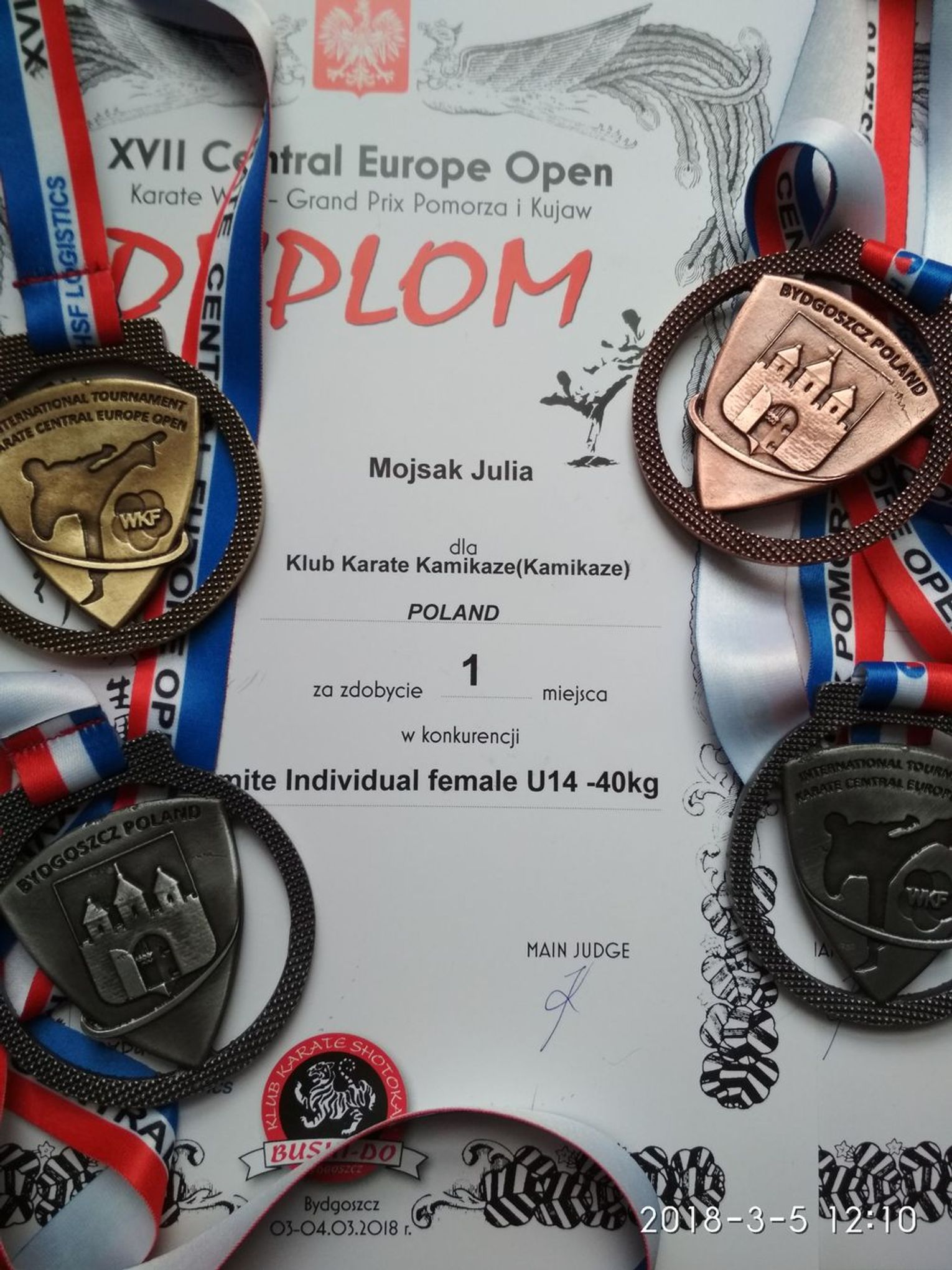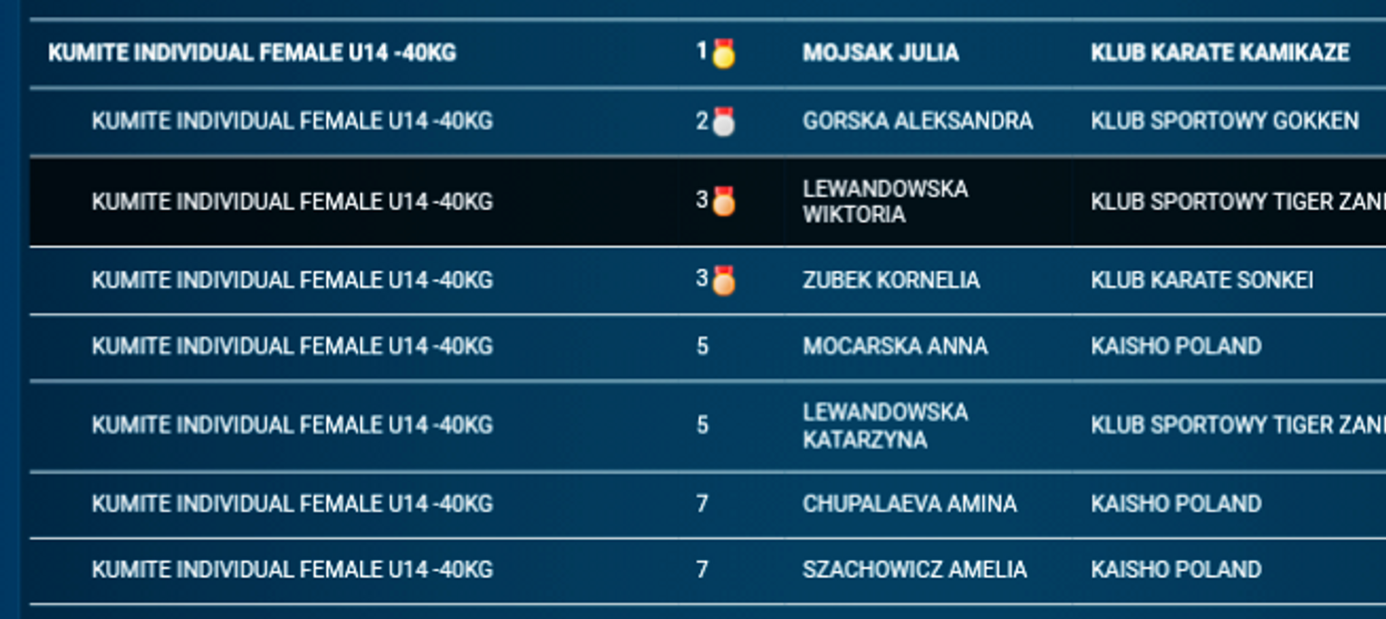 Julia Mojsak zwyciężyła konkurencję kumite (walka) w kategorii U14 – 40 kg zwyciężając kolejno zawodniczki: Amelię Szachniewicz z klubu Kaisho Białystok, Katarzynę Lewandowską z KS Tiger Zaniemyśl, Kornelię Zubek z Sonkei Gdańsk, a w finale Aleksandrę Górką z KS Gokken Chwarszczyno.