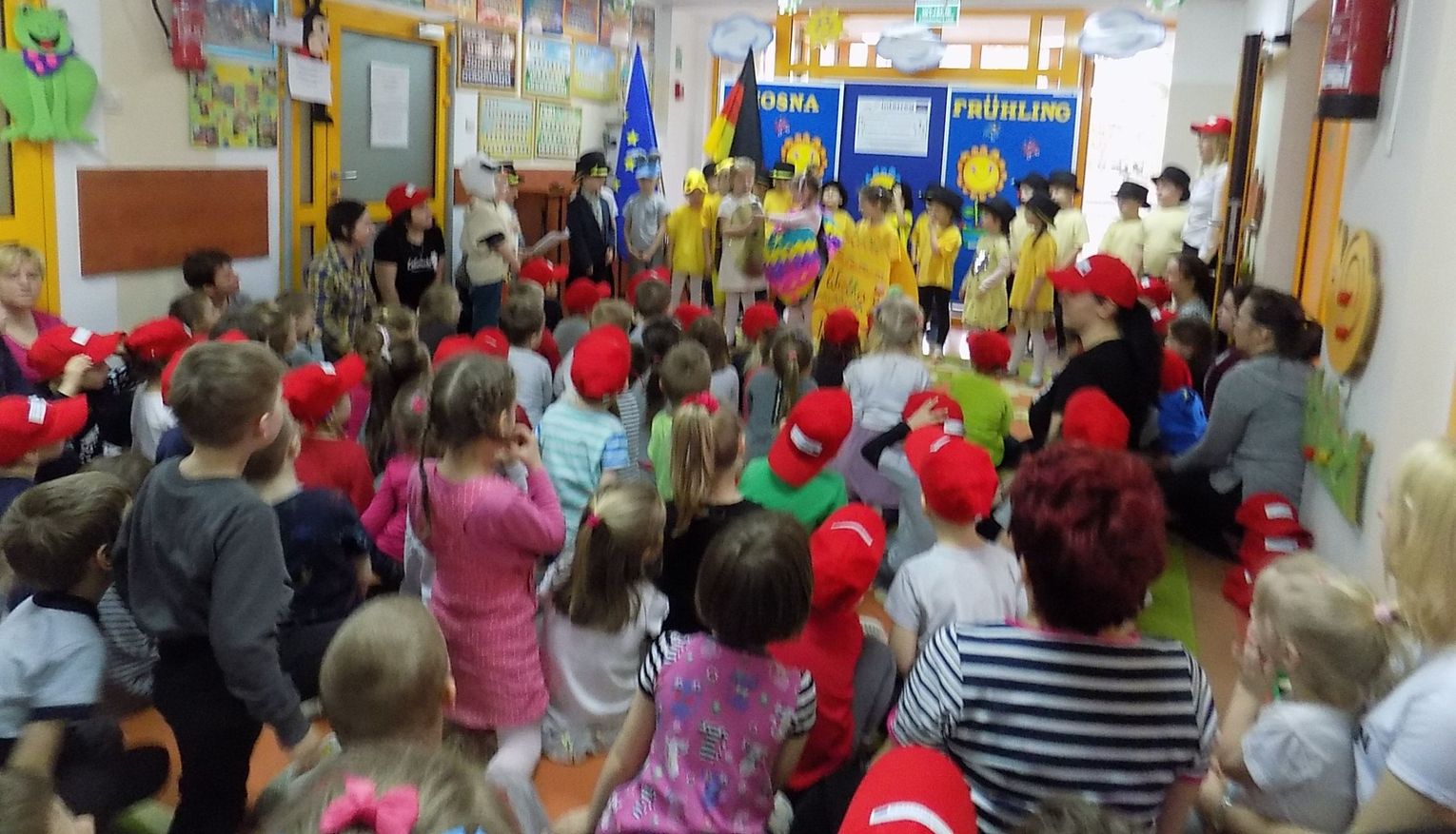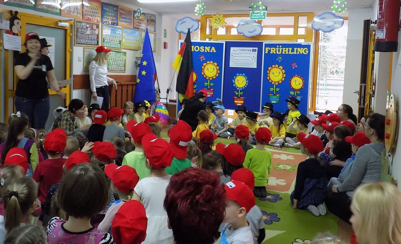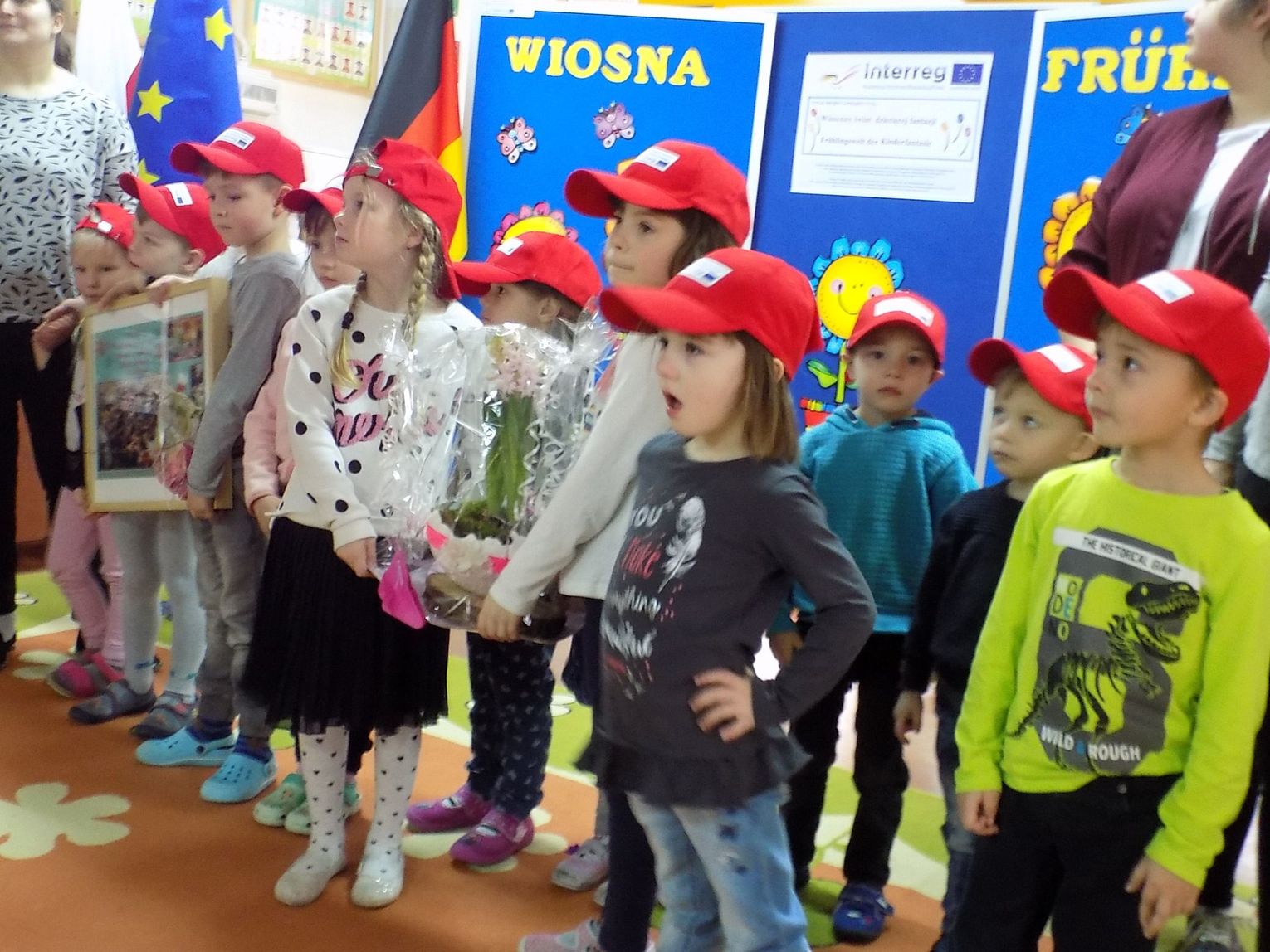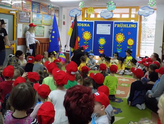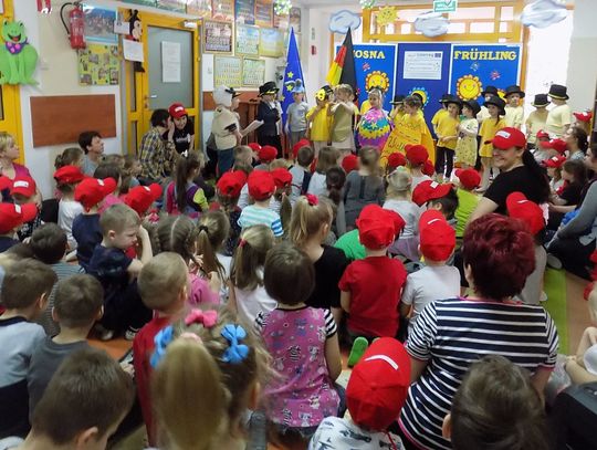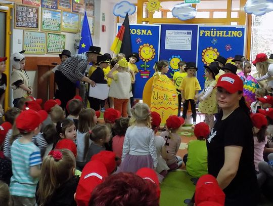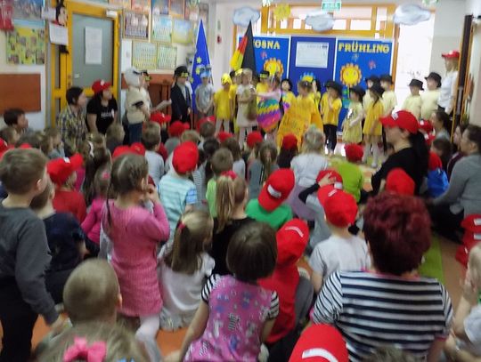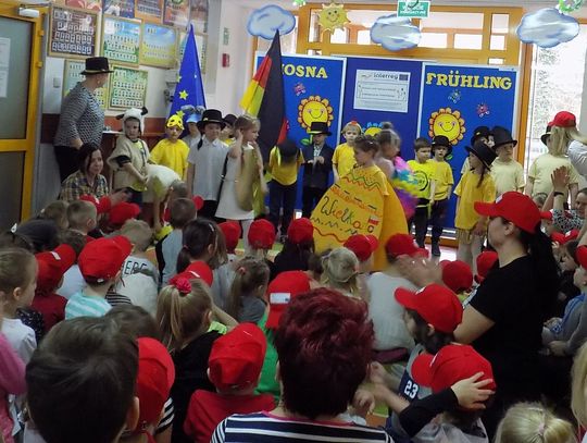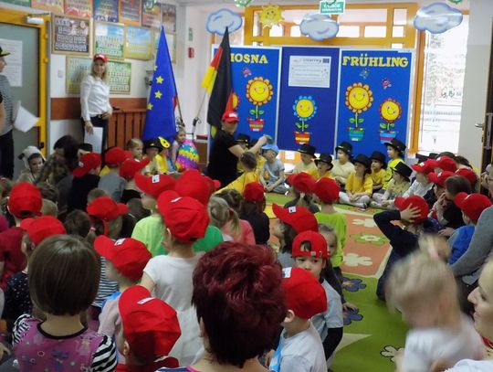 Barbara Wróblewska, dbająca o kontakty i przyjazne pomiędzy dwoma przedszkolami, przywitała gości i gospodarzy. Niemieccy koledzy wręczając przywiezione prezenty podkreślili, że nazwa wiosennego kwiatka „hiacynt” brzmi prawie tak samo po polsku jak po niemiecku.
