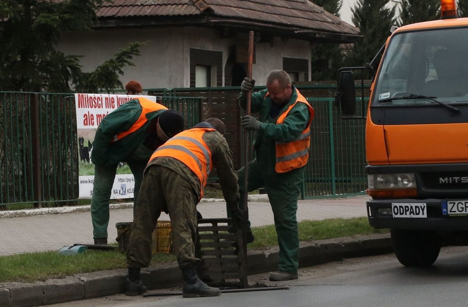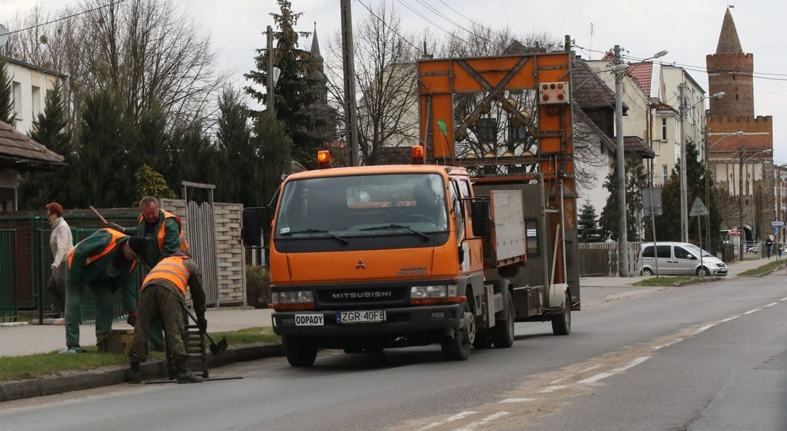 Spowolniony ruch mamy dziś 5 kwietnia 2018 r. na ul. Łużyckiej w Gryfinie. Pracownicy firmy Elwi w pobliżu przejścia dla pieszych i sklepu Wójcika prowadzą prace. Chodzi o kanalizację...