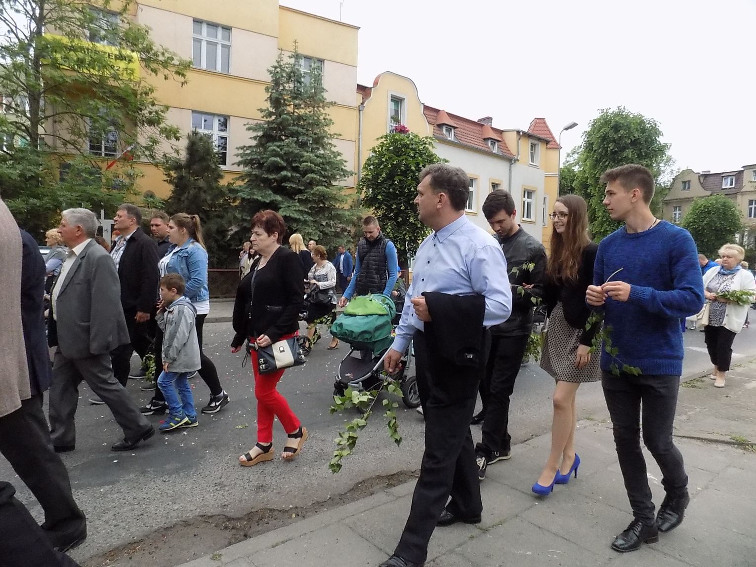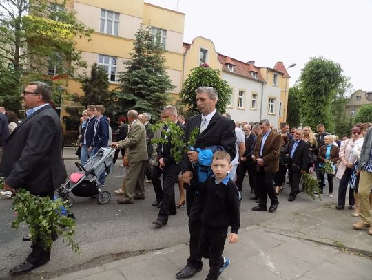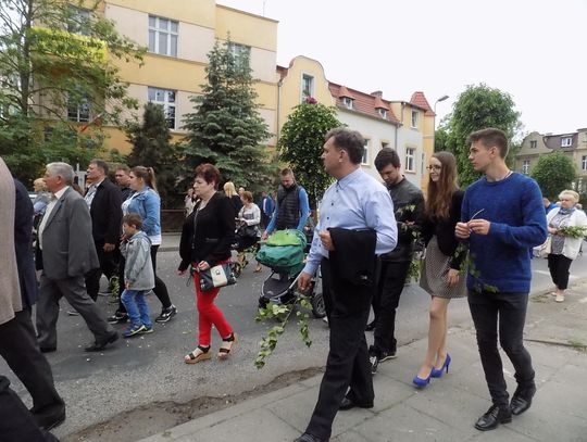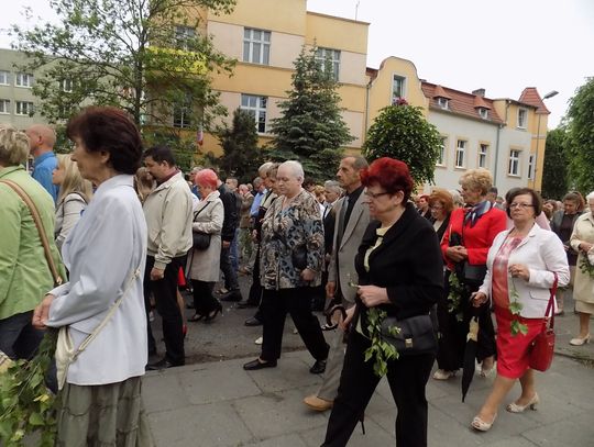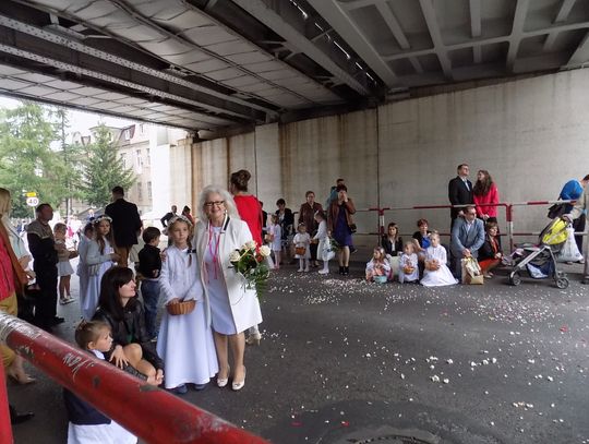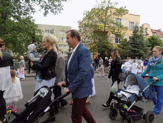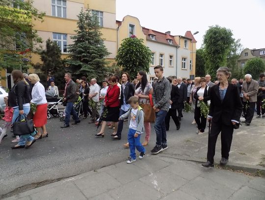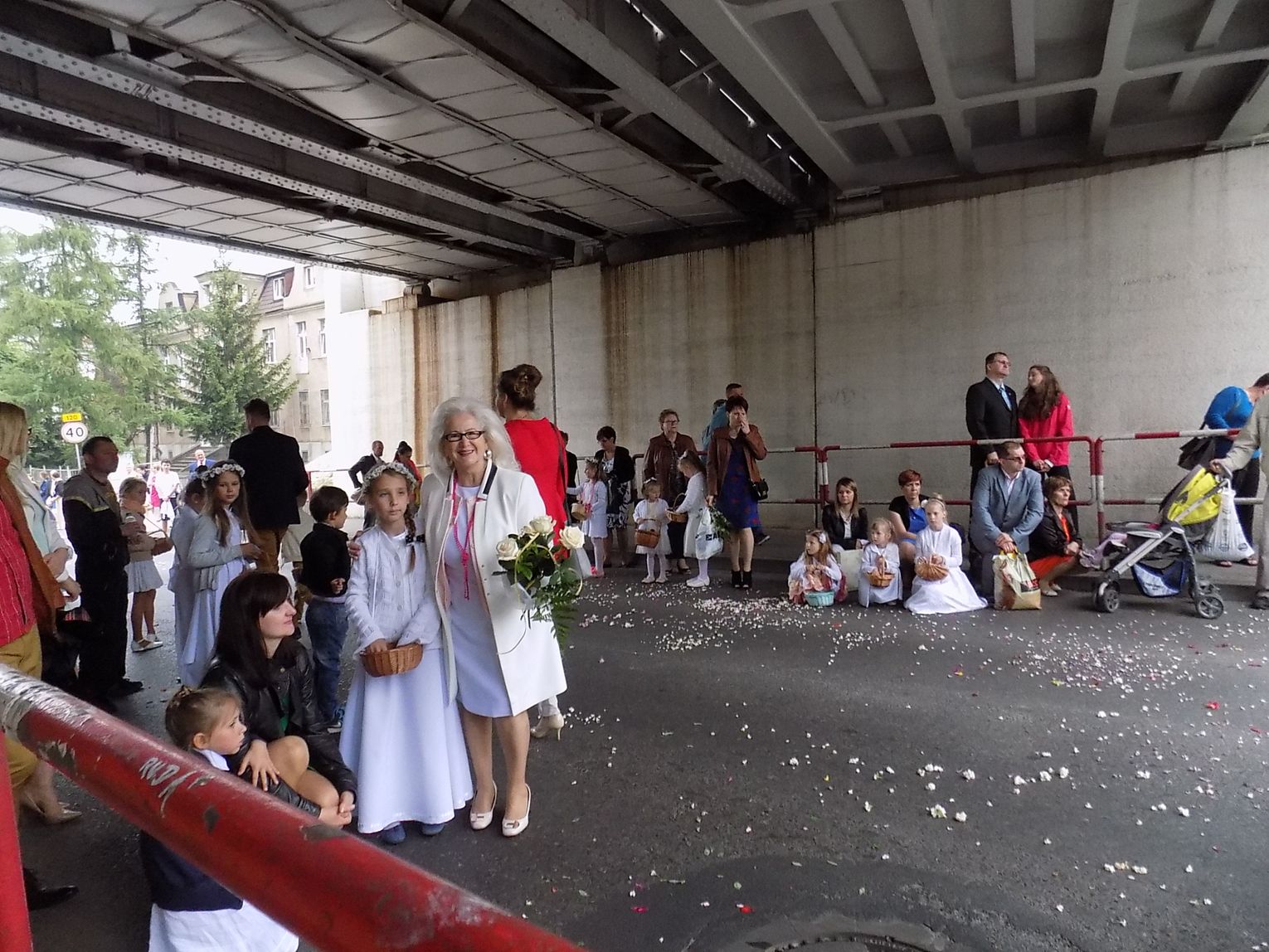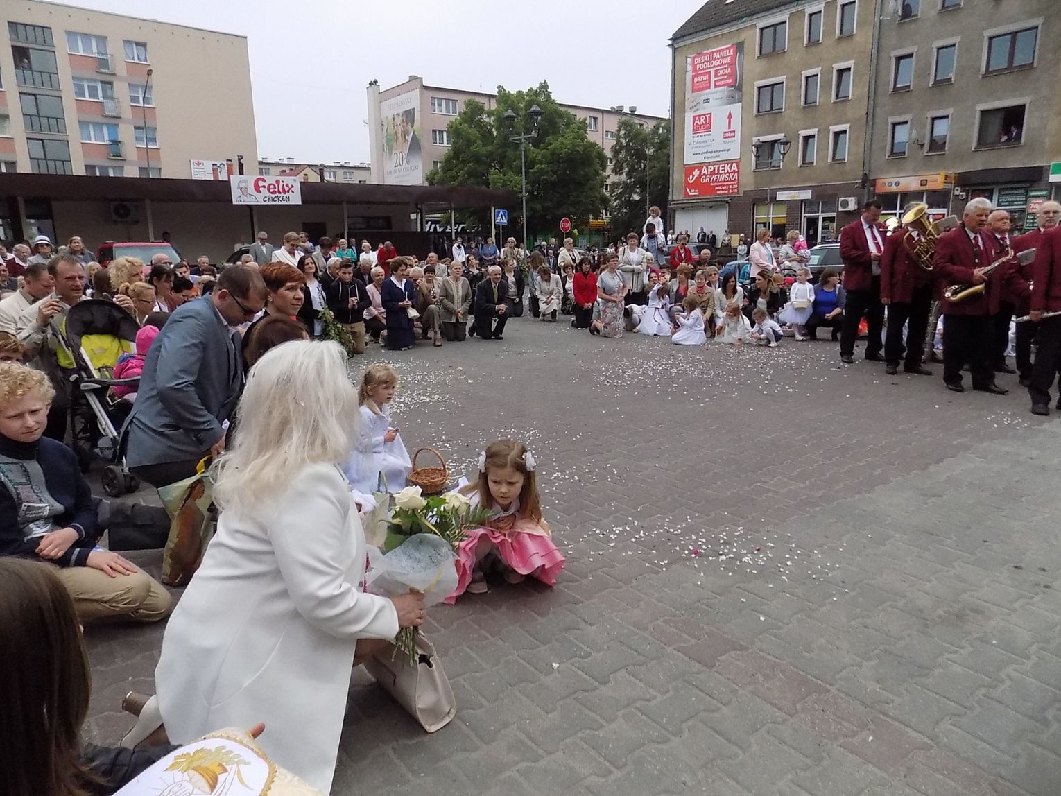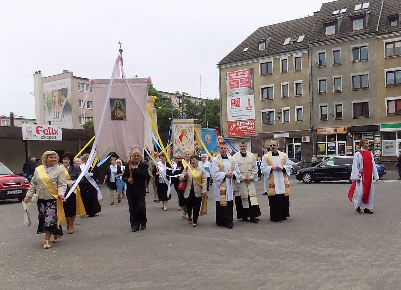 Dziewczynki w białych sukieneczkach sypią kwiaty, bardzo przejęte swoją rolą. Chłopcy niosą ogromny różaniec. Są kobiety adorujące Najświętszą Pannę. Są chorągwie. Gra orkiestra z Dolnej Odry. Wśród księży radujący się gryfinian, dostojny ks. kanonik Bronisław Kozłowski.