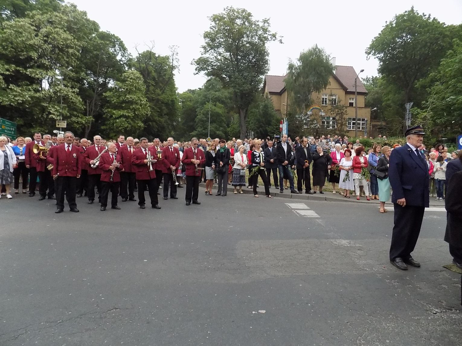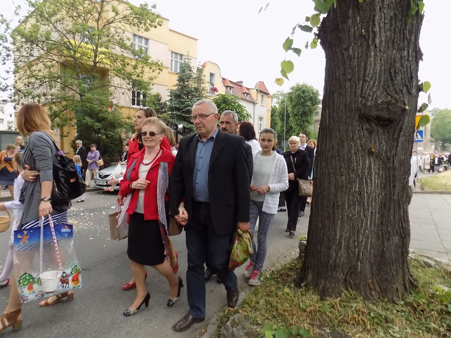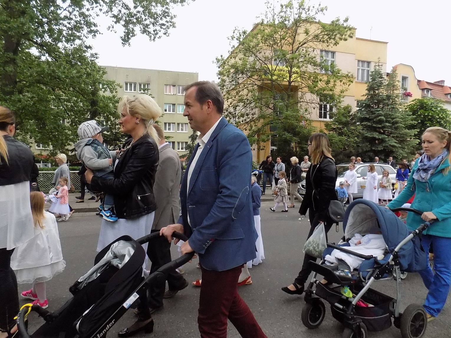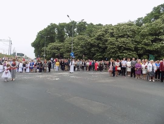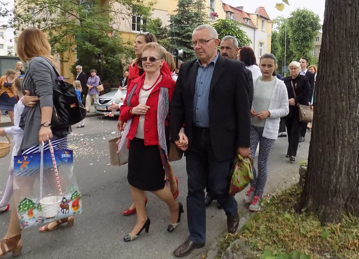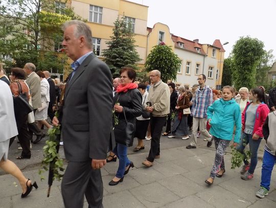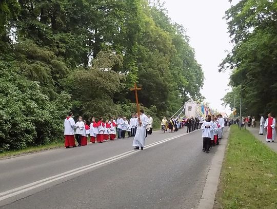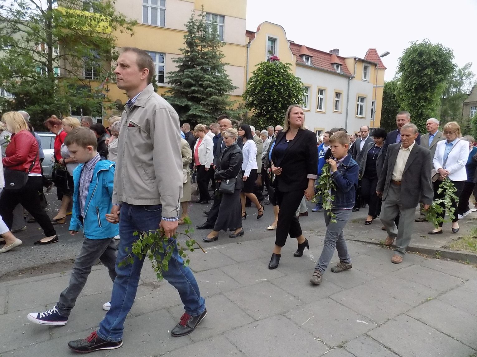 Dziewczynki w białych sukieneczkach sypią kwiaty, bardzo przejęte swoją rolą. Chłopcy niosą ogromny różaniec. Są kobiety adorujące Najświętszą Pannę. Są chorągwie. Gra orkiestra z Dolnej Odry. Wśród księży radujący się gryfinian, dostojny ks. kanonik Bronisław Kozłowski.
