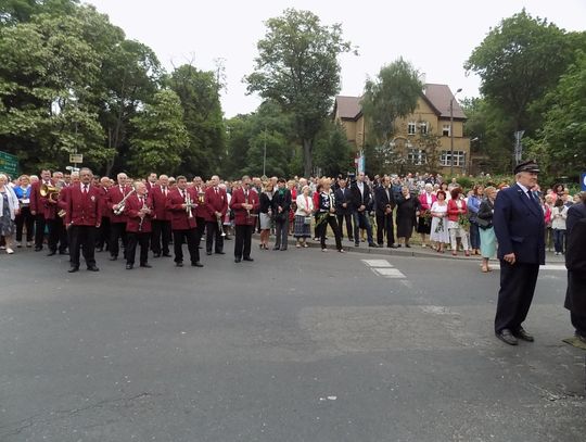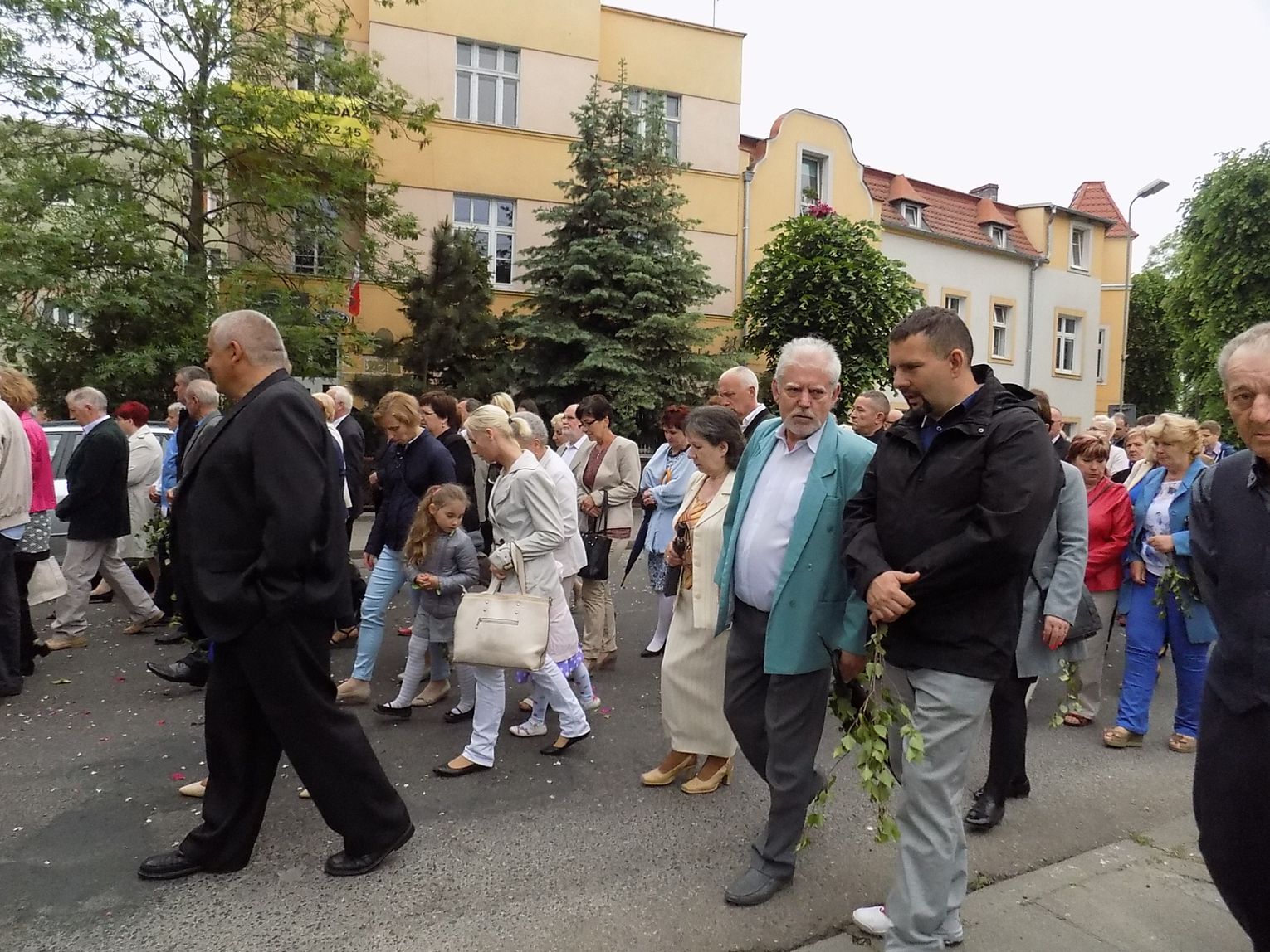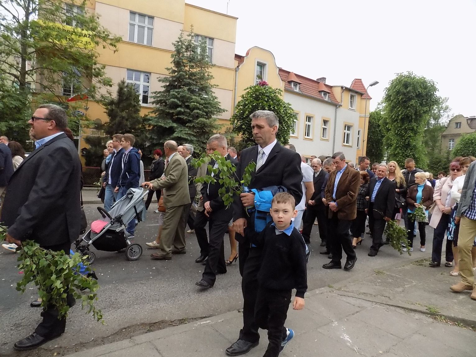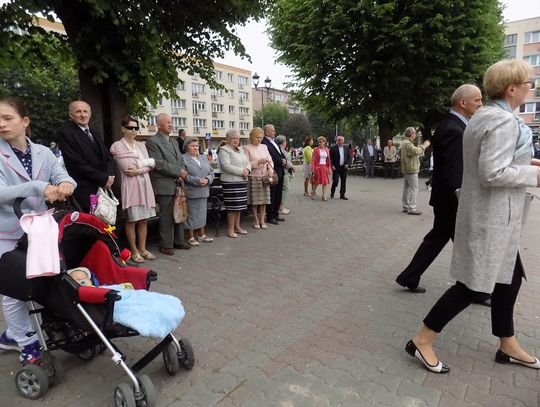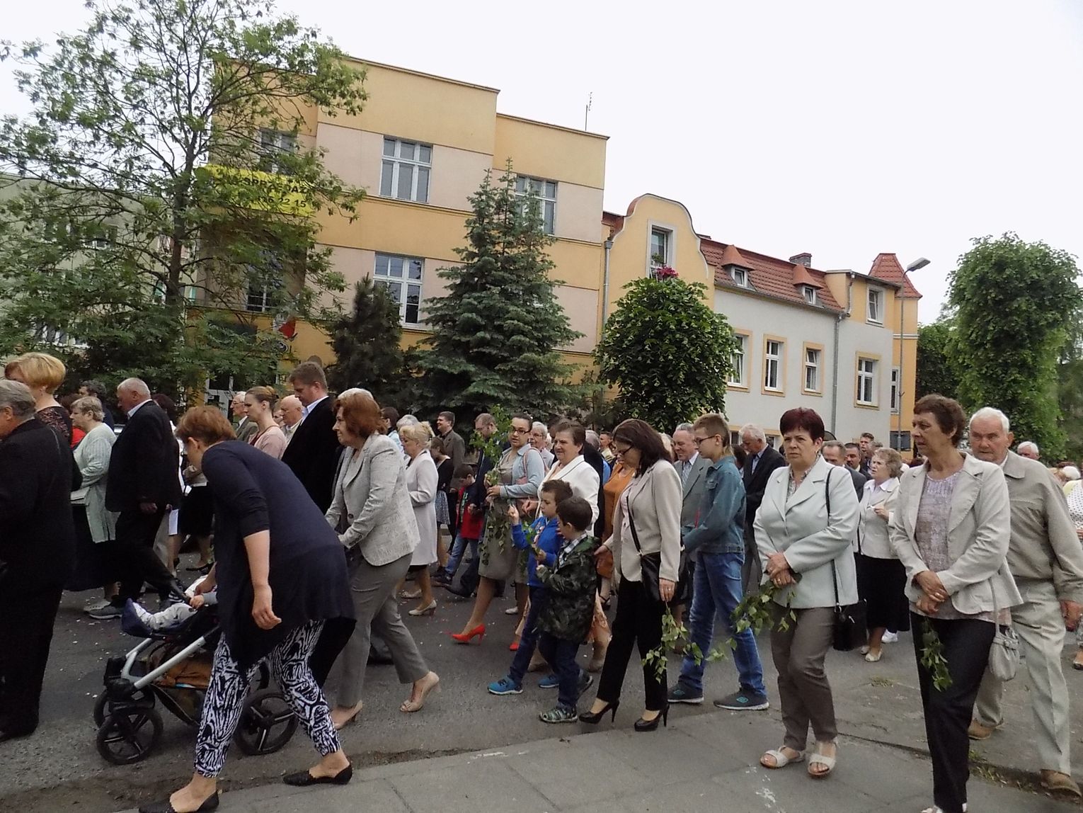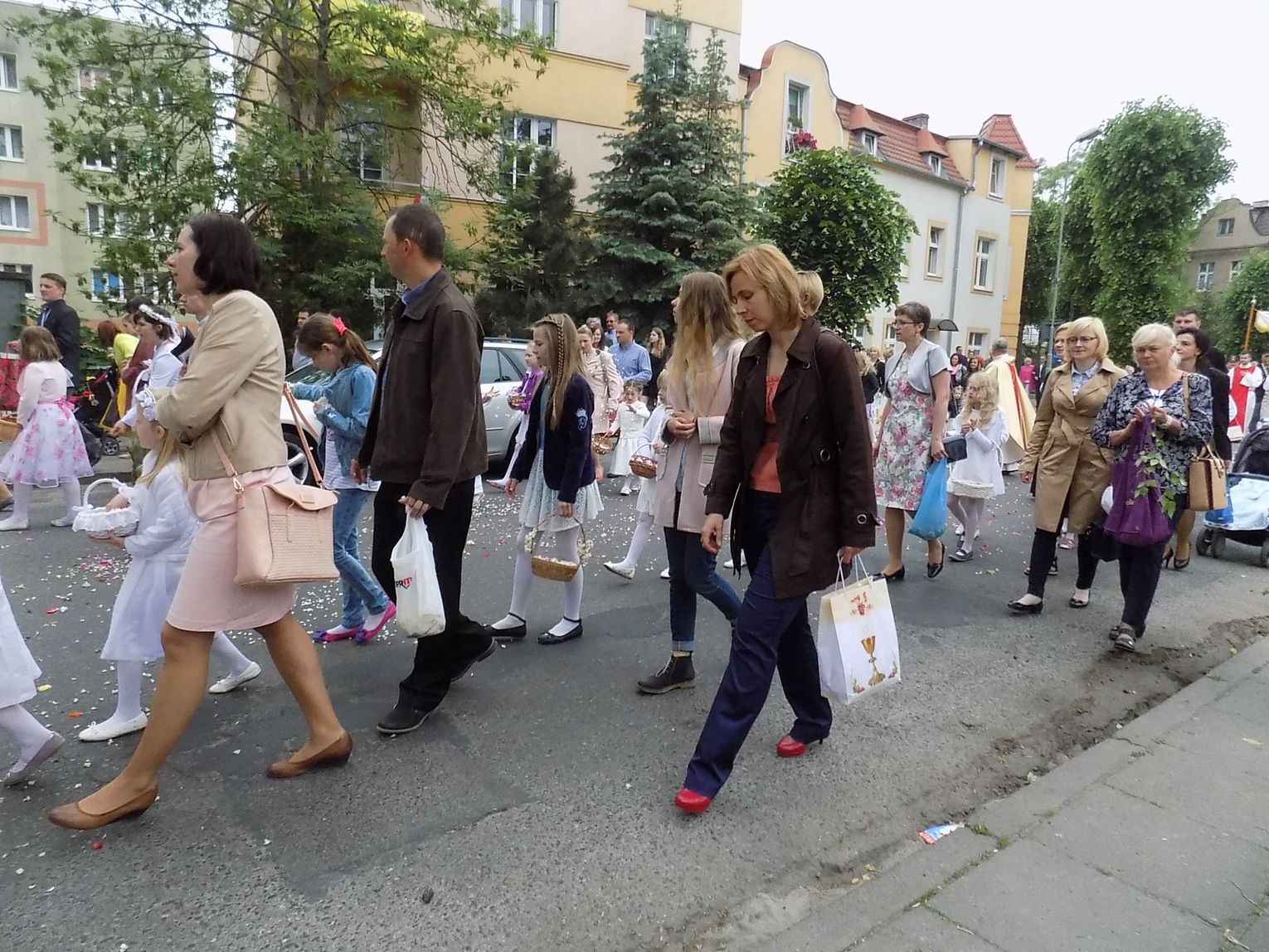 Dziewczynki w białych sukieneczkach sypią kwiaty, bardzo przejęte swoją rolą. Chłopcy niosą ogromny różaniec. Są kobiety adorujące Najświętszą Pannę. Są chorągwie. Gra orkiestra z Dolnej Odry. Wśród księży radujący się gryfinian, dostojny ks. kanonik Bronisław Kozłowski.