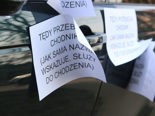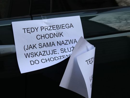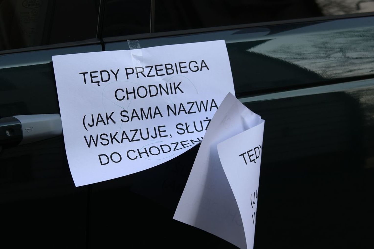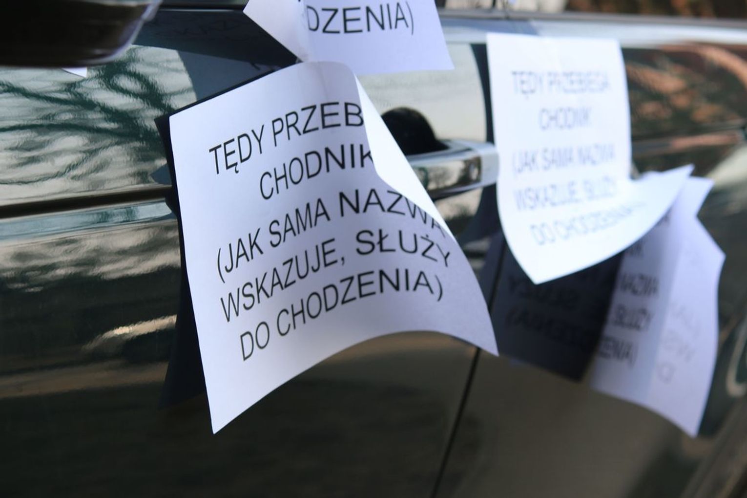"Tędy przebiega chodnik (jak sama nazwa wskazuje służy do chodzenia)" - o takiej treści napisy na kartkach nalepione zostały na maskę zaparkowanego na chodniku samochodu...
