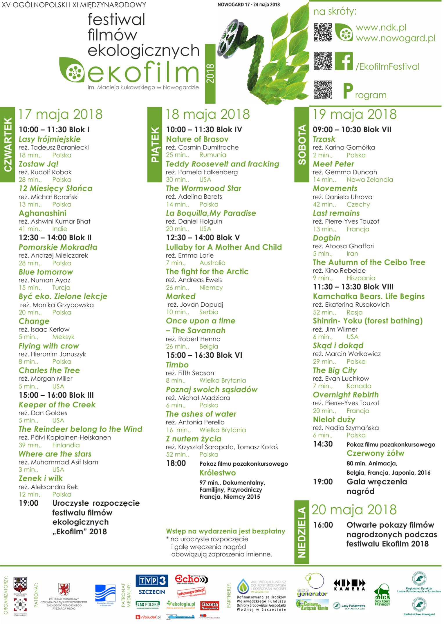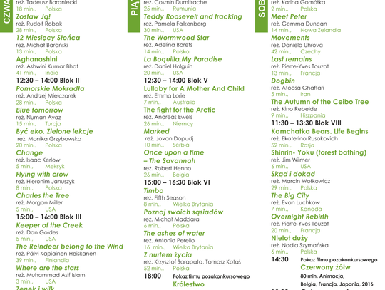 W piątek i sobotę odbędą się dodatkowe pokazy filmów pozakonkursowych. Pierwszy to „Królestwo” - niesamowita opowieść o przyrodzie, tej najdzikszej i nietkniętej jeszcze ludzką ręką, drugi „Czerwony żółw” to piękna i cicha animacja, opowiadająca historię rozbitka, który odkrywa tajemnice magicznej wyspy. Kolejne dni – od 21 do 24 maja - poświęcone są dzieciom i młodzieży z przedszkoli i szkół, które zobaczą zwycięskie produkcje i zostaną wprowadzone w meandry ekologii i filmoznawstwa.