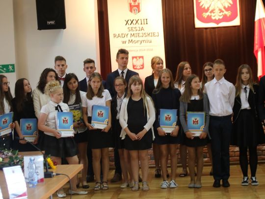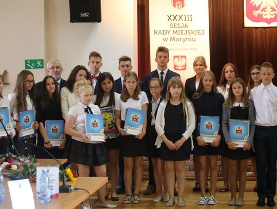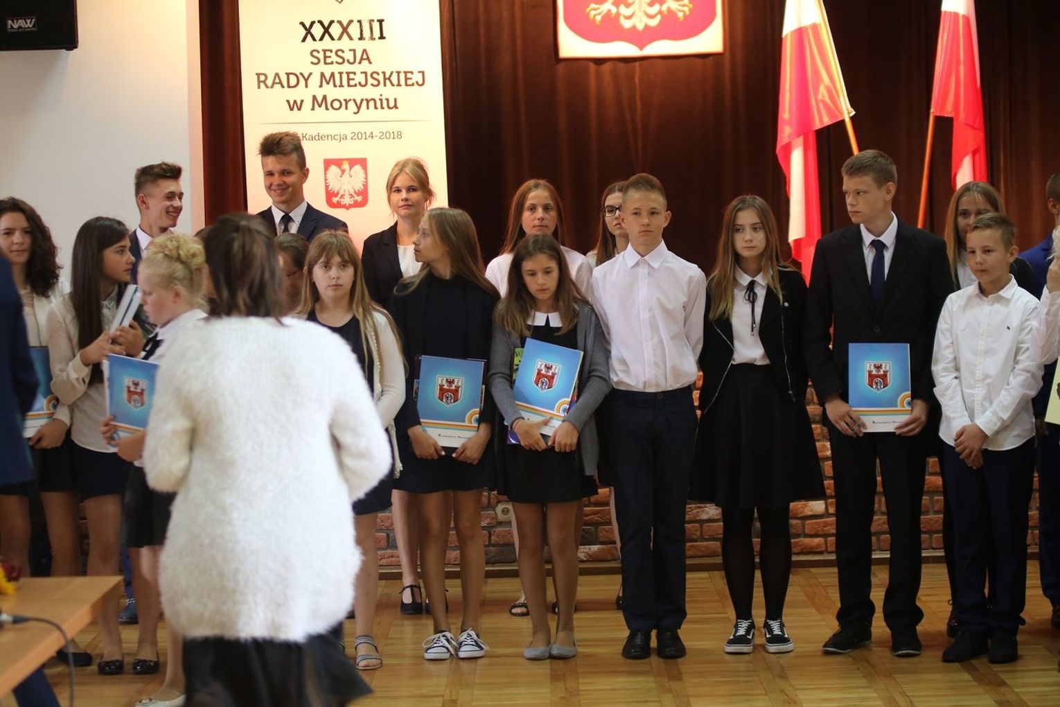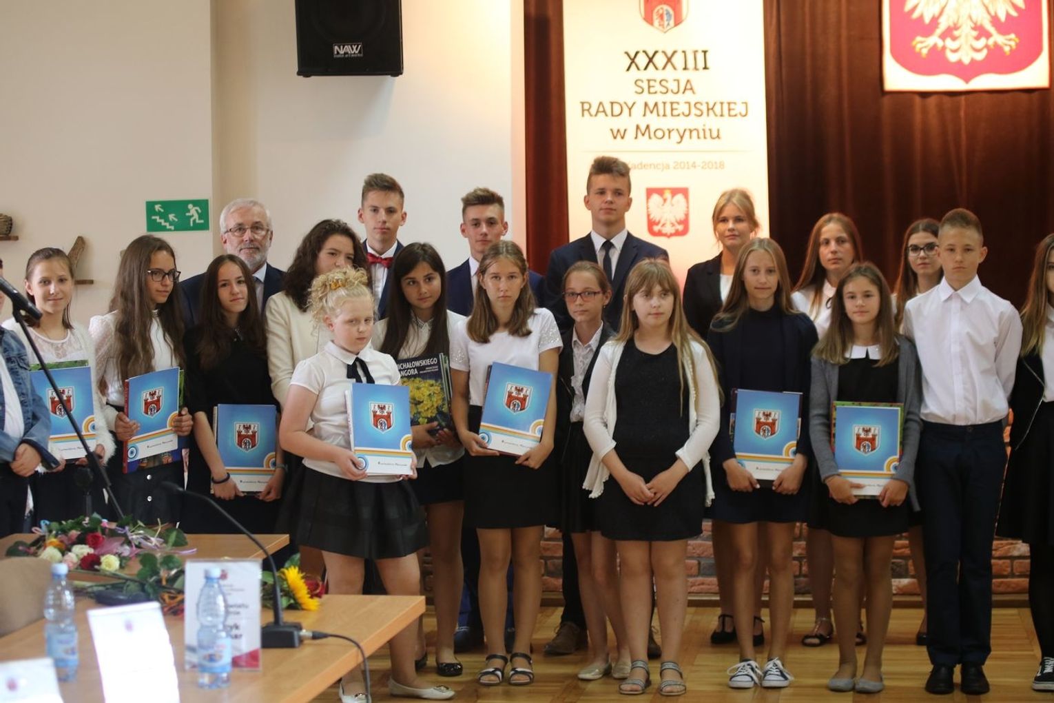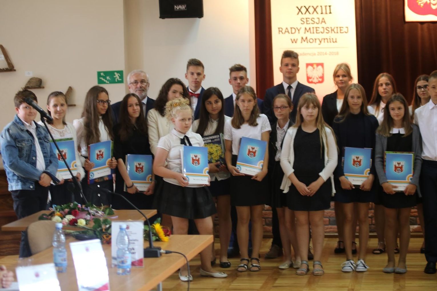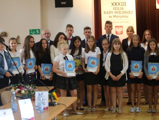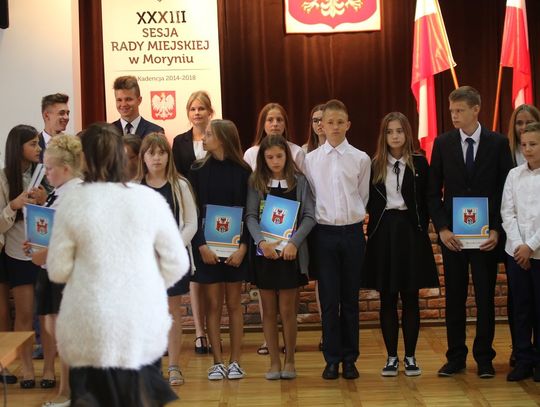 - dla Aleksandry Brodackiej – uczennicy Szkoły Podstawowej im. st. sierż. M. Majchrzaka w Moryniu w wysokości 70 zł miesięcznie na rok szkolny 2018/2019 za osiągnięcie szczególnie wysokich wyników w nauce, wzorowe zachowanie, zdobycie tytułu finalisty Wojewódzkiego Konkursu Matematycznego w roku szkolnym 2017/2018 oraz godne reprezentowanie Gminy Moryń.