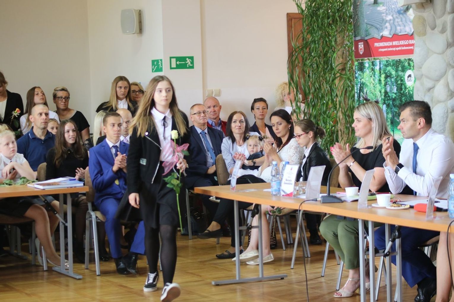- dla Kingi Rozkrut uczennicy Publicznego Gimnazjum im. Jana Pawła II w Moryniu w wysokości 70 zł miesięcznie na rok szkolny 2018/2019 za osiągnięcie szczególnie wysokich wyników w nauce oraz wzorowe zachowanie w roku szkolnym 2017/2018.