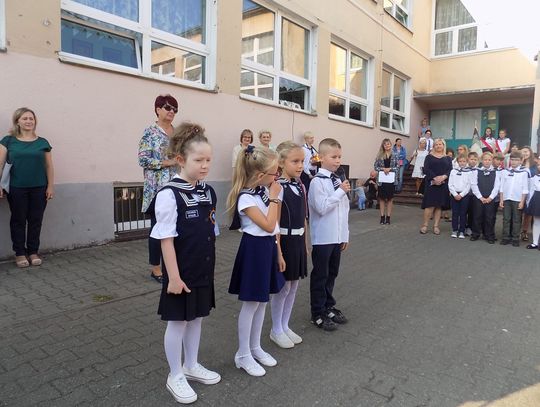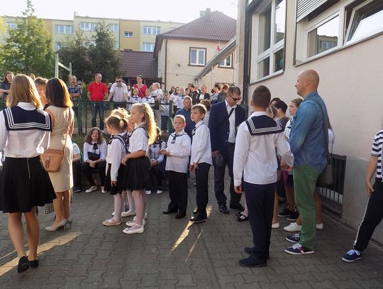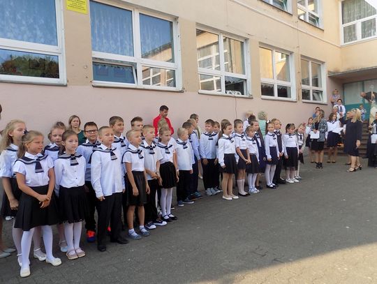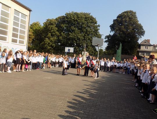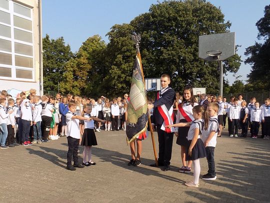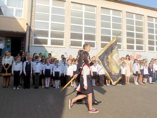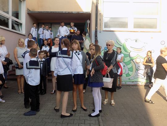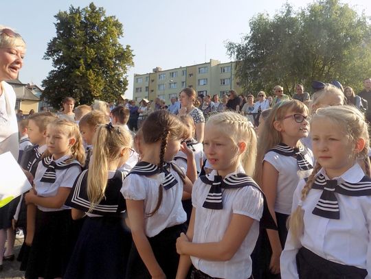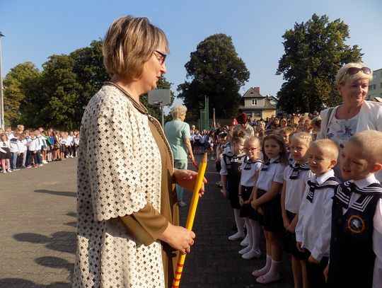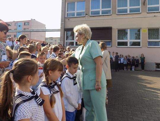 Na dużym placu przed szkołą zebrali się uczniowie, rodzice i nauczyciele, poczet sztandarowy. Dla dyrektor Elżbiety Wnuk to już czternasty szkolny dzwonek.