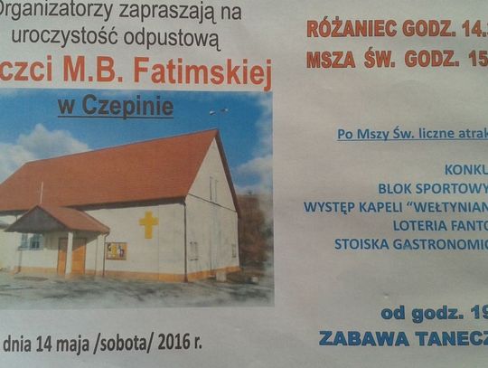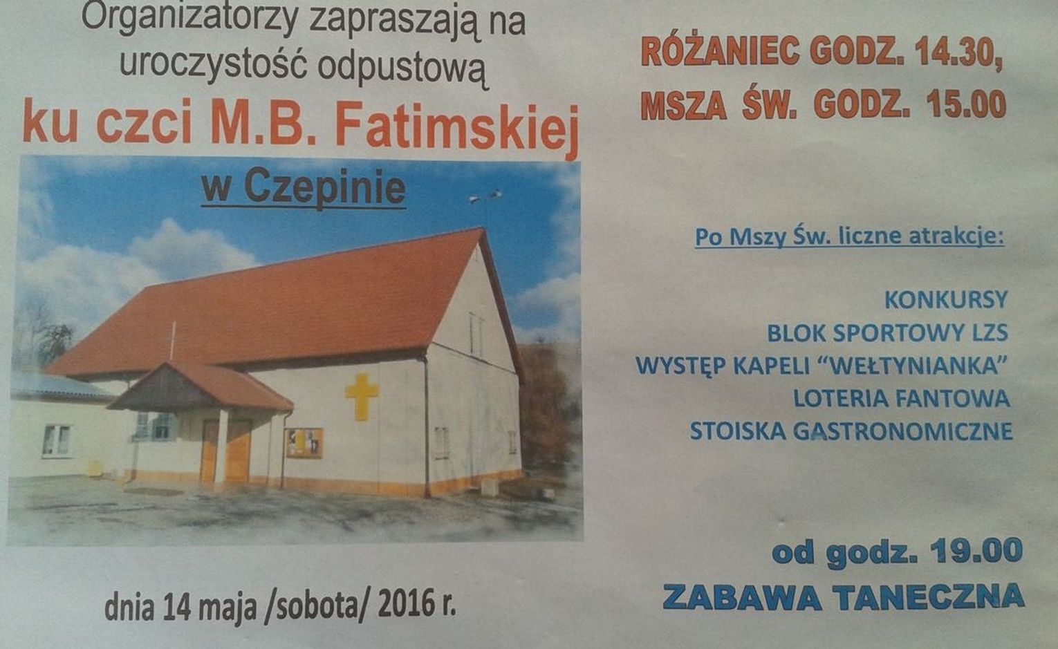 Ksiądz proboszcz Jerzy Brocławik, radny Zdzisław Kmieciak, rada kościelna, Koło Gospodyń Wiejskich, sołtys Józef Zajączkowski, rada sołecka, instruktor świetlicy oraz mieszkańcy Czepina i Nowych Brynek zapraszają na uroczystość odpustową patronki kościoła Matki Boskiej Fatimskiej w Czepinie. Wydarzenie zaplanowano na dzień 14 maja 2016 r. Organizatorzy zapewniają liczne atrakcje, loterię fantową (nagroda główna rower) oraz występy artystyczne , znakomitą kuchnie w plenerze i zabawę taneczną. Szczegóły programu poniżej i na plakacie w fotogalerii.