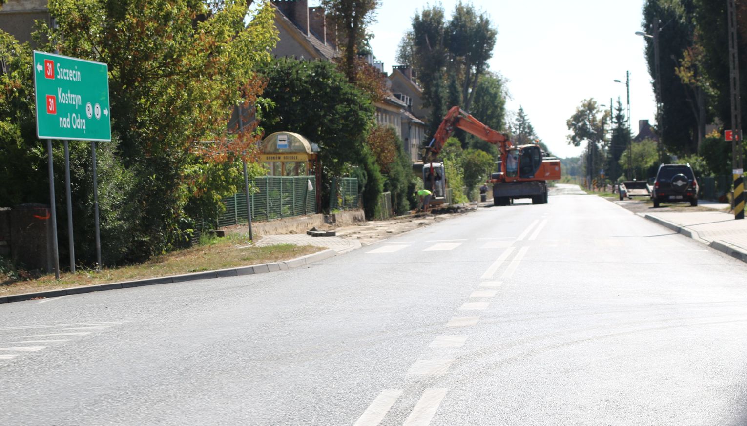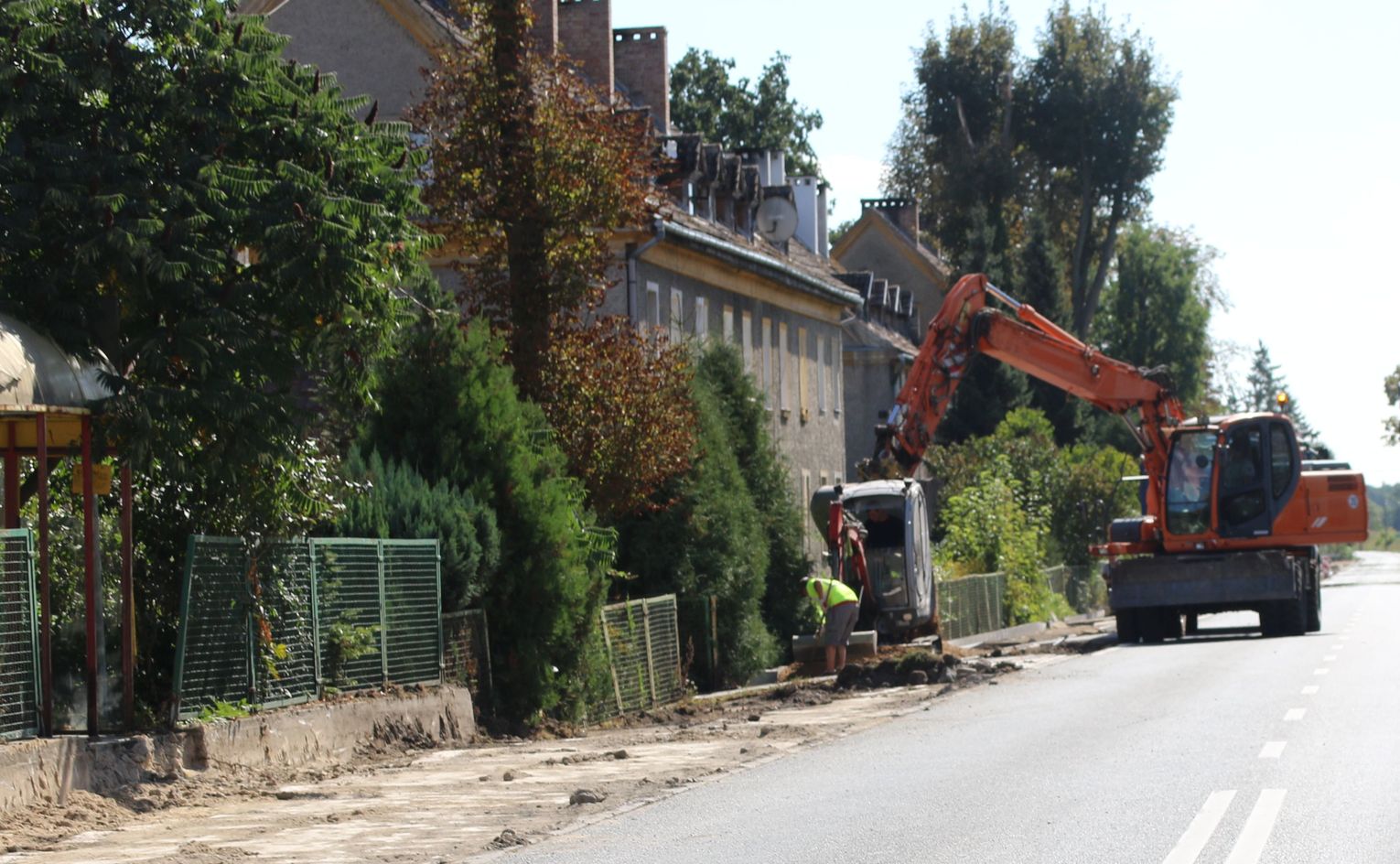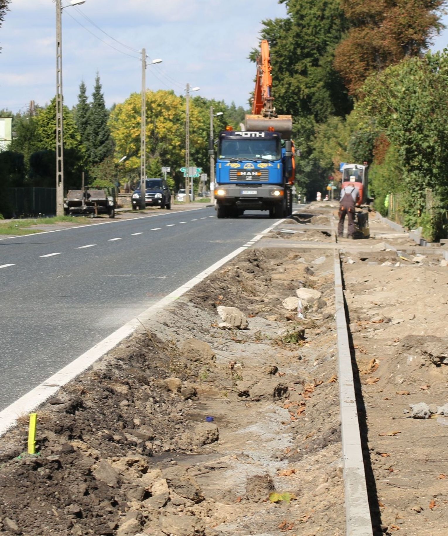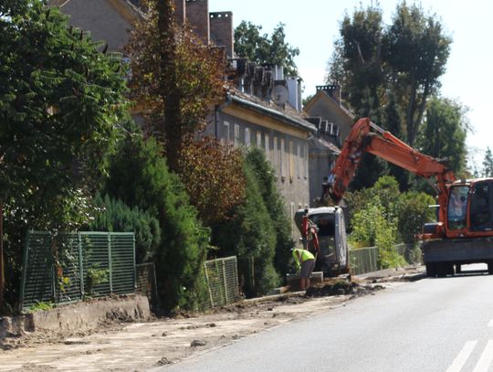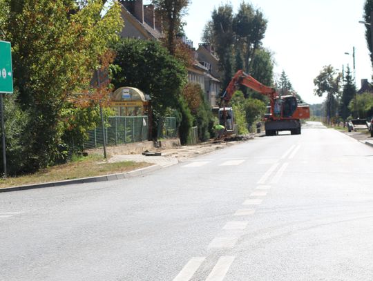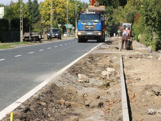 Trwają prace na drodze krajowej nr 31 w Godkowie Osiedlu. Przy jezdni wymieniane są chodniki. Nowe będą z polbruku.