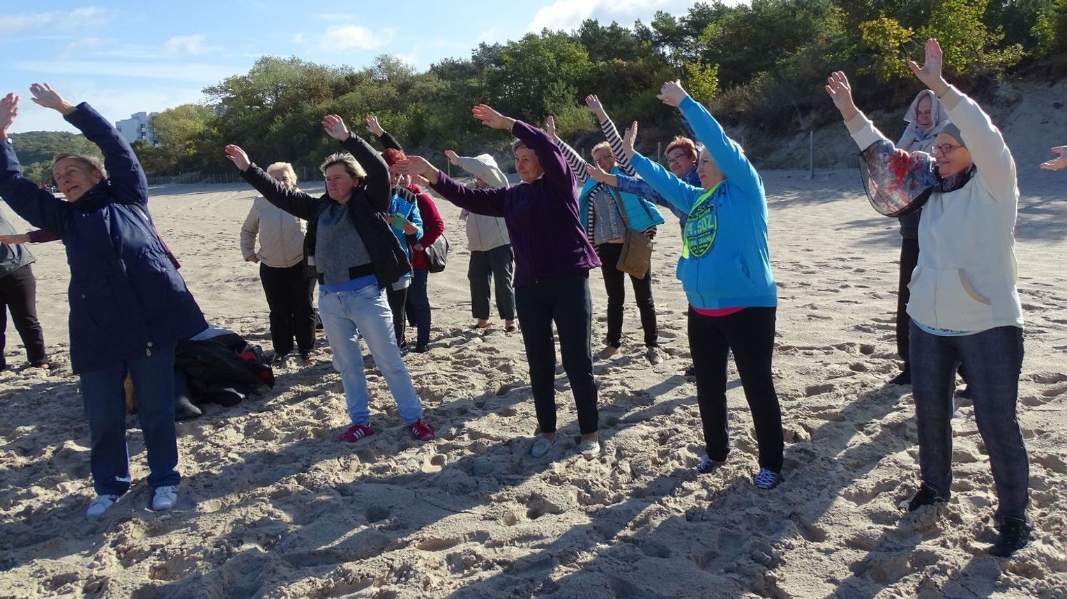 Właśnie w sobotę 22 września Międzyzdroje były miejscem spotkań artystycznych seniorów, którzy przyjechali nad morze z całej Polski. Swoją wycieczkę rozpoczęliśmy od wspólnych śpiewów przy akompaniamencie akordeonistów Danuty Panek i Jana Ogonowskiego już w autobusie. Po przyjedzie grupa udała się na plażę gdzie przyprowadzono zajęcia gimnastyczne prowadzone przez instruktora MGOK D. Panek i zajęcia oddechowe z jogi przez Ursule Veckenstedt z Frauenzentrum. Potem udano się na spacer wzdłuż brzegów morza. Wspólnie, w przyjaznej atmosferze, w restauracji Neptun zjedzono obiad i deser. Następnie grupkami byliśmy widzami i słuchaczami popisów artystycznych seniorów. Artyści występowali bowiem w każdym zakątku miasteczka i towarzyszyli nam przez cały czas pobytu w Międzyzdrojach. Piękna choć wietrzna pogoda skończyła się wraz naszym wyjazdem. W drodze powrotnej wesoło śpiewano przy niestrudzonym akordeonowym akompaniamencie.