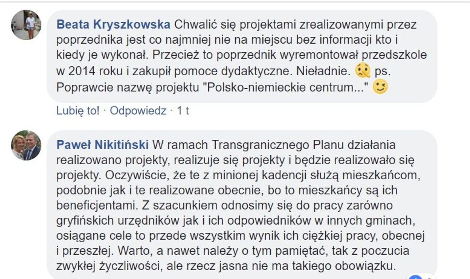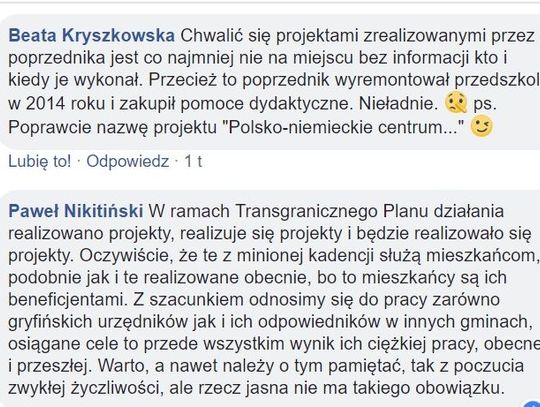 - Chwalić się projektami zrealizowanymi przez poprzednika jest co najmniej nie na miejscu bez informacji kto i kiedy je wykonał. Przecież to poprzednik wyremontował przedszkole w 2014 roku i zakupił pomoce dydaktyczne. Nieładnie. ? ps. Poprawcie nazwę projektu "Polsko-niemieckie centrum..." ? - napisała Beata Kryszkowska.