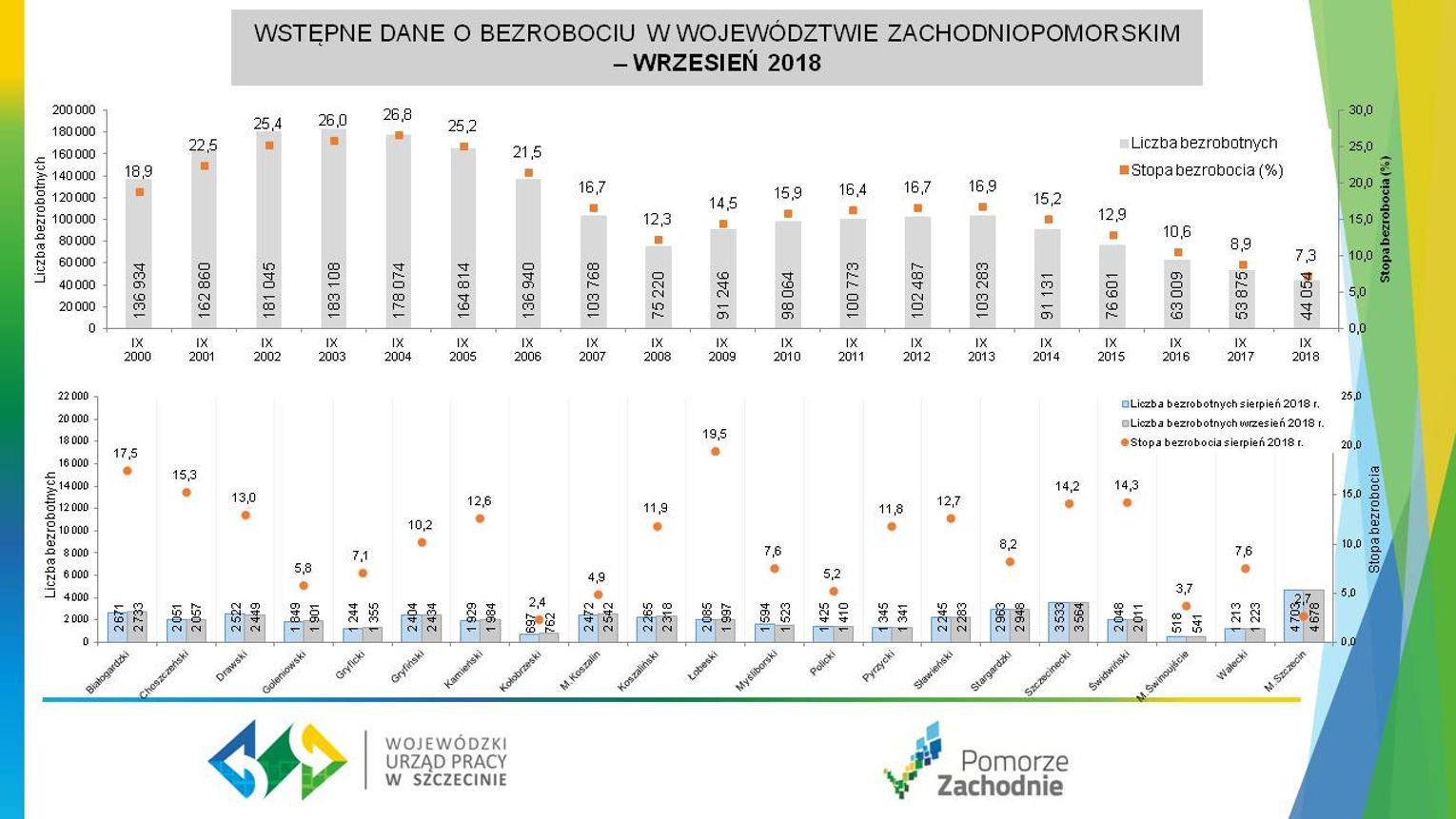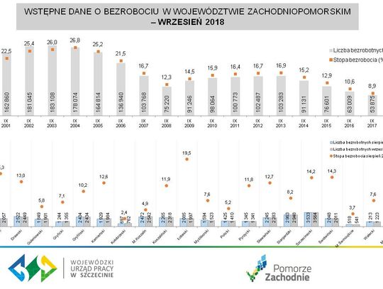 Co miesiąc Wojewódzki Urząd Pracy w Szczecinie zbiera dane z powiatowych jednostek i aktualizuje wskaźniki zachodniopomorskiego rynku pracy. We wrześniu zarejestrowanych było 44 054 bezrobotnych osób. Liczba ta w stosunku do danych z poprzedniego miesiąca zwiększyła się 0,6%, ale w porównaniu z wrześniem 2017 roku jest niższa o 18,2%.
