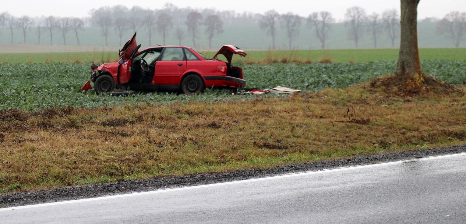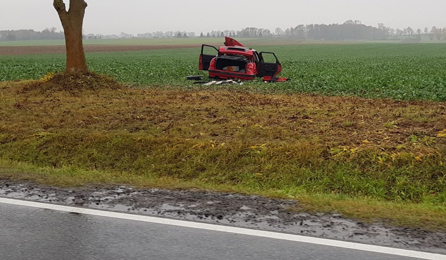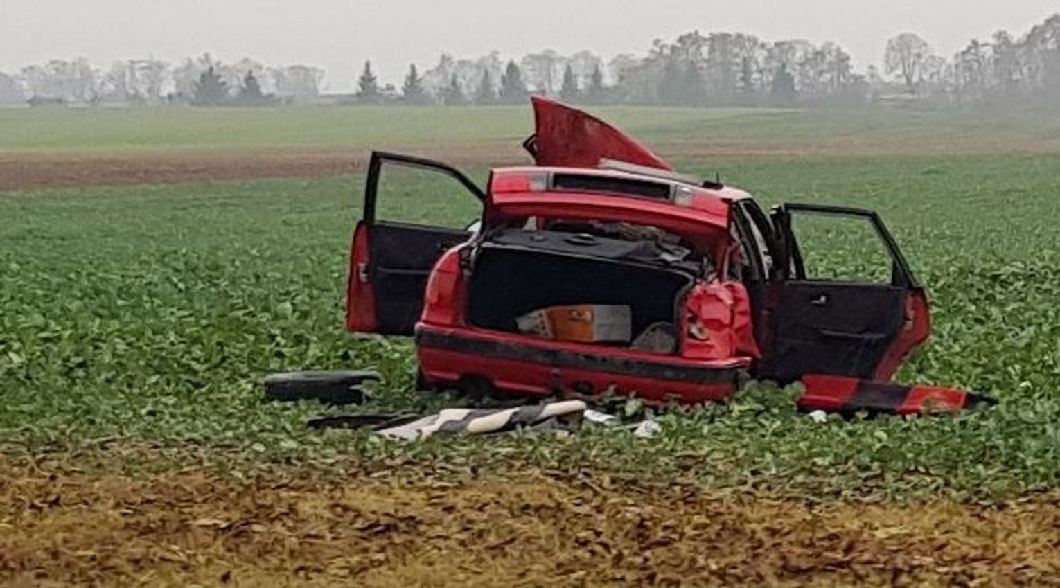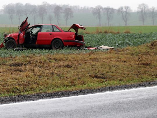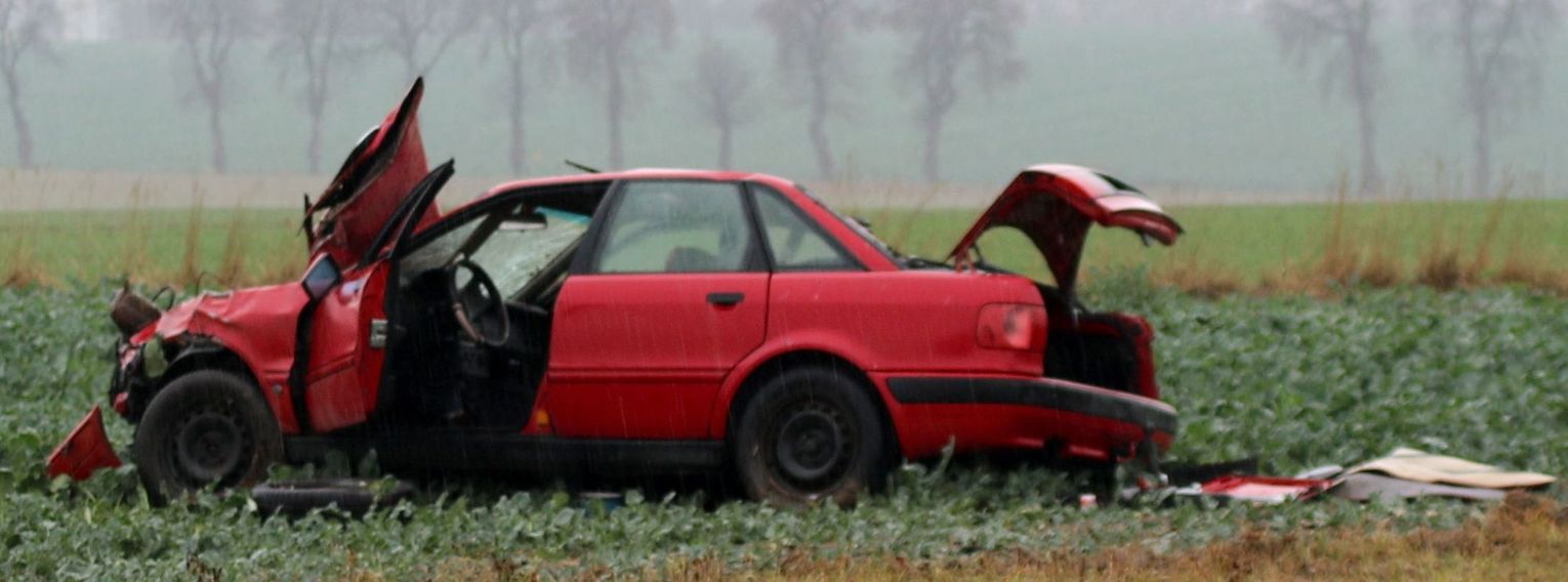 Wrak auta do dzisiaj znajduje się w polu, przypominając kierowcom jakie mogą być skutki nieostrożnej jazdy.