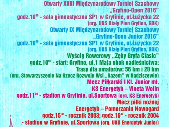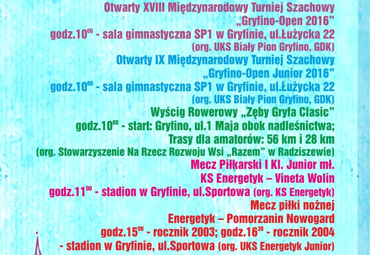 Trwa pierwszy dzień święta miasta. Dni Gryfina rozpoczynają się od imprez towarzyszących. Niestety wyścig rowerowy "Żęby Gryfa Clasic" nie odbył się. Rozpoczęto za to rozgrywki szachowe. Na scenie na nabrzeżu koncerty rozpoczną gryfińskie talenty. Inmprezę zakończy dyskoteka plenerowa, którą poprowadzi dj Mati. Niedzielny plan Dni Gryfina w fotogalerii.