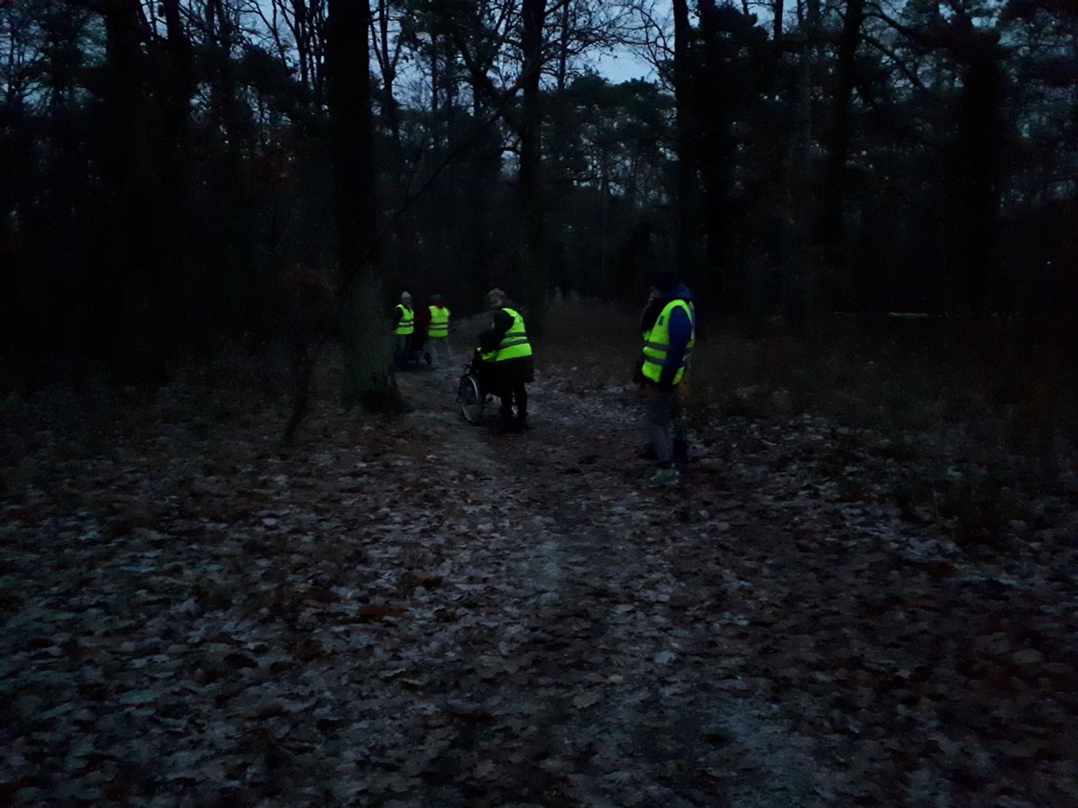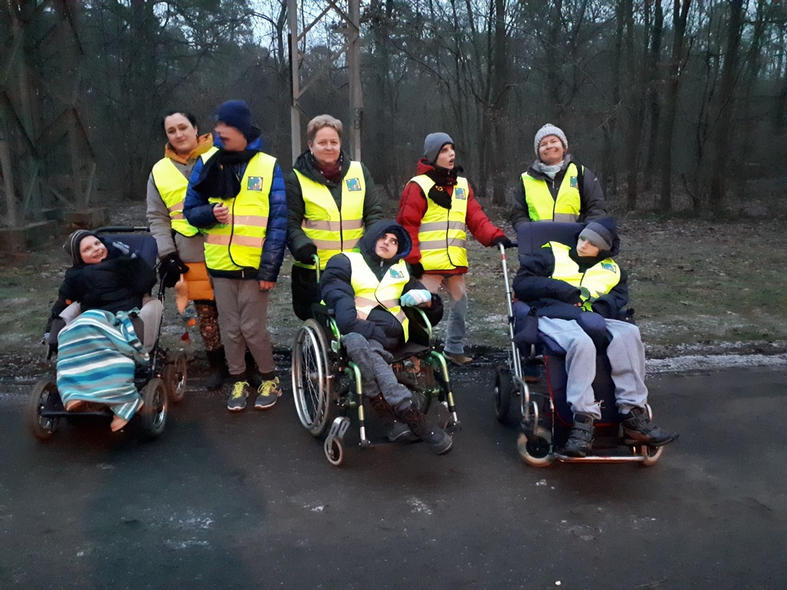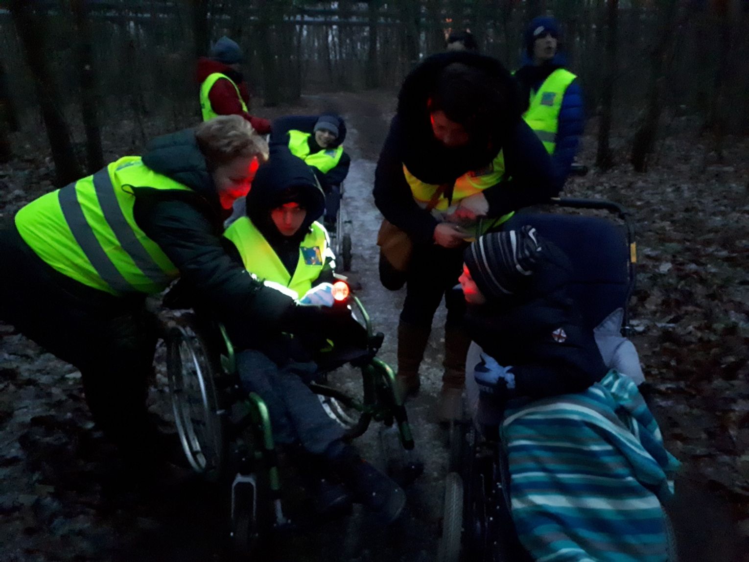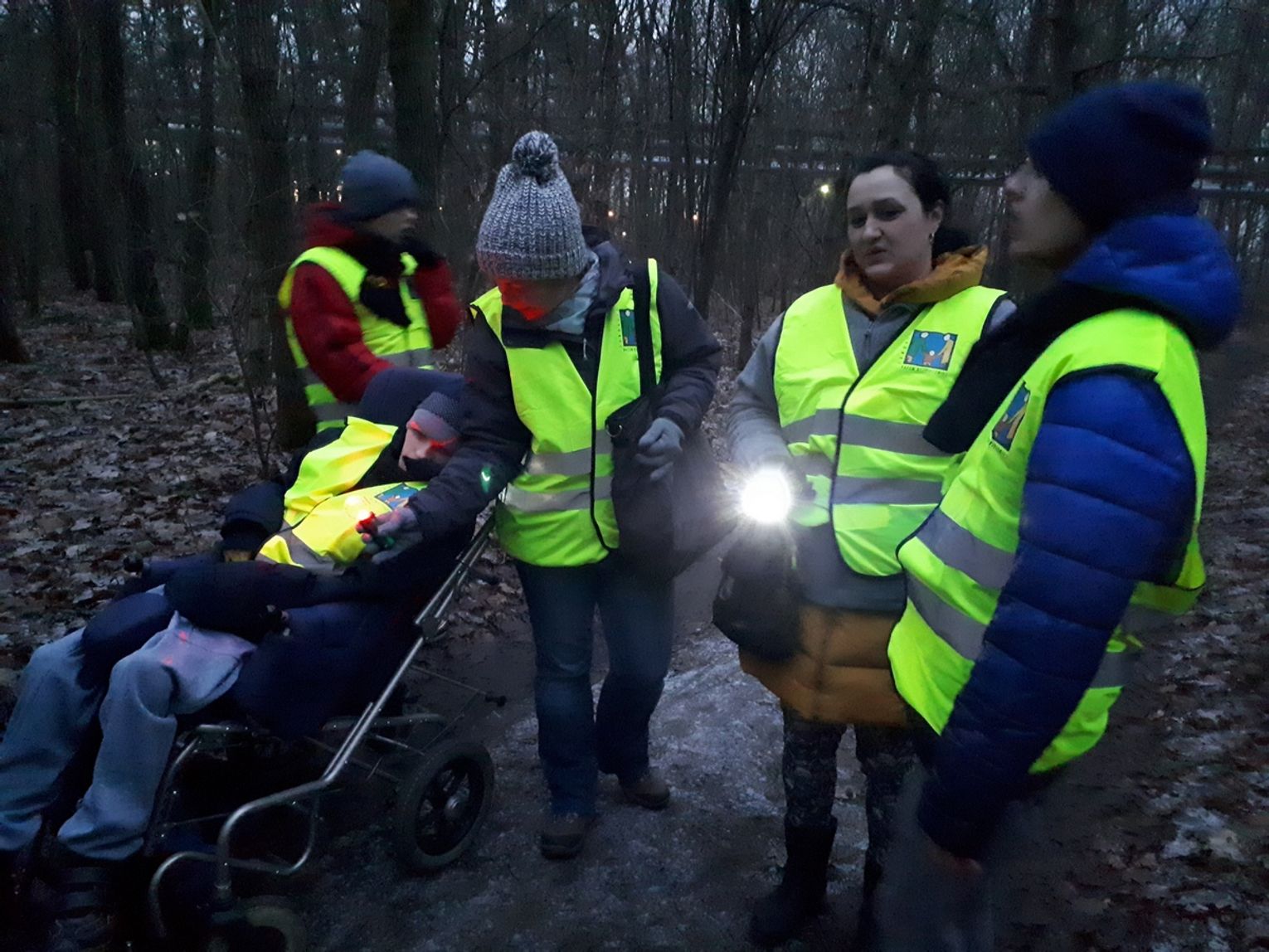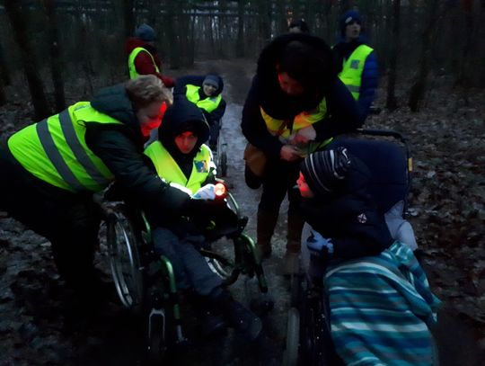 Dziś tj. 17 grudnia, gdy zaczęło się ściemniać, zaopatrzeni w latarki, kamizelki odblaskowe oraz kolorowe światełka ruszyliśmy ulicami Nowego Czarnowa. Pochód w zapadającym mroku jest niecodziennym doświadczeniem dla naszych podopiecznych, ponieważ zwykle o tej porze są już w swoich pokojach. Tym razem dzieci doświadczały niezwykłych efektów świetlnych wywołanych przez lampki i latarki rozjaśniające zapadające ciemności. Dzieci z zapartym tchem słuchały odgłosów natury i cywilizacji w nowej scenerii. Wszyscy pełni wrażeń wrócili do domów.