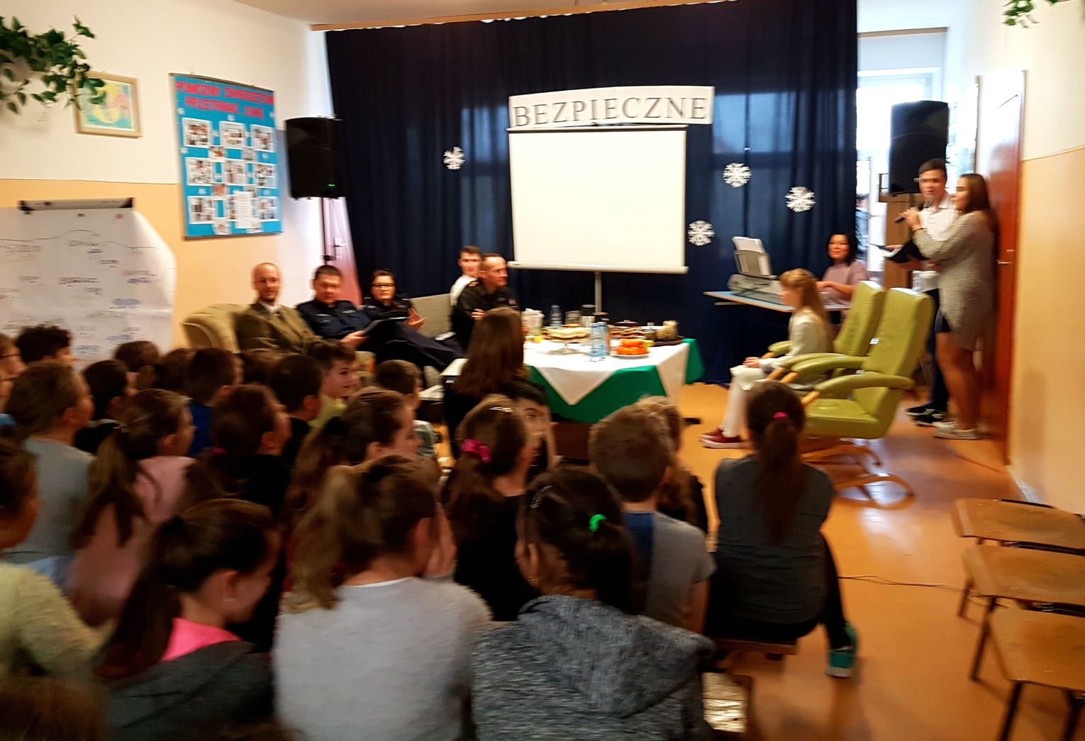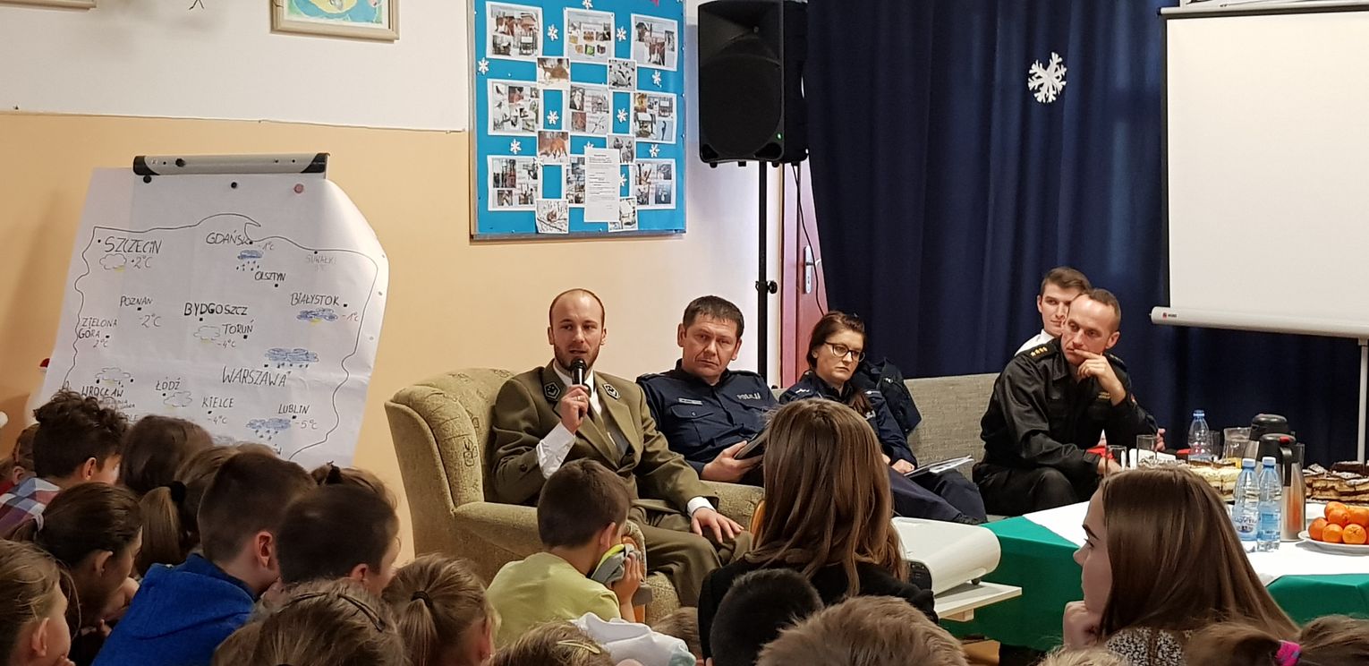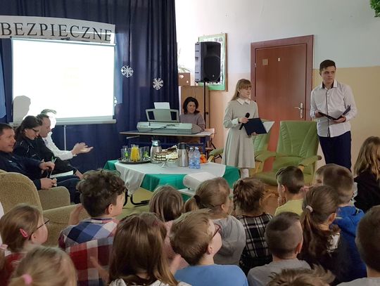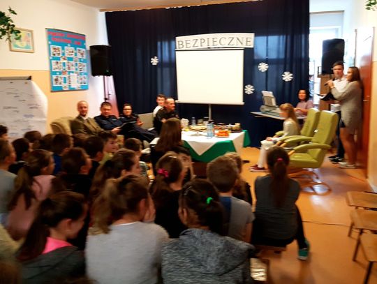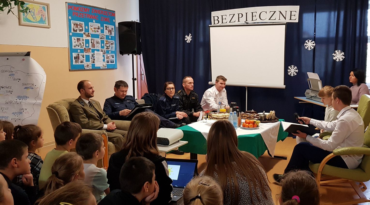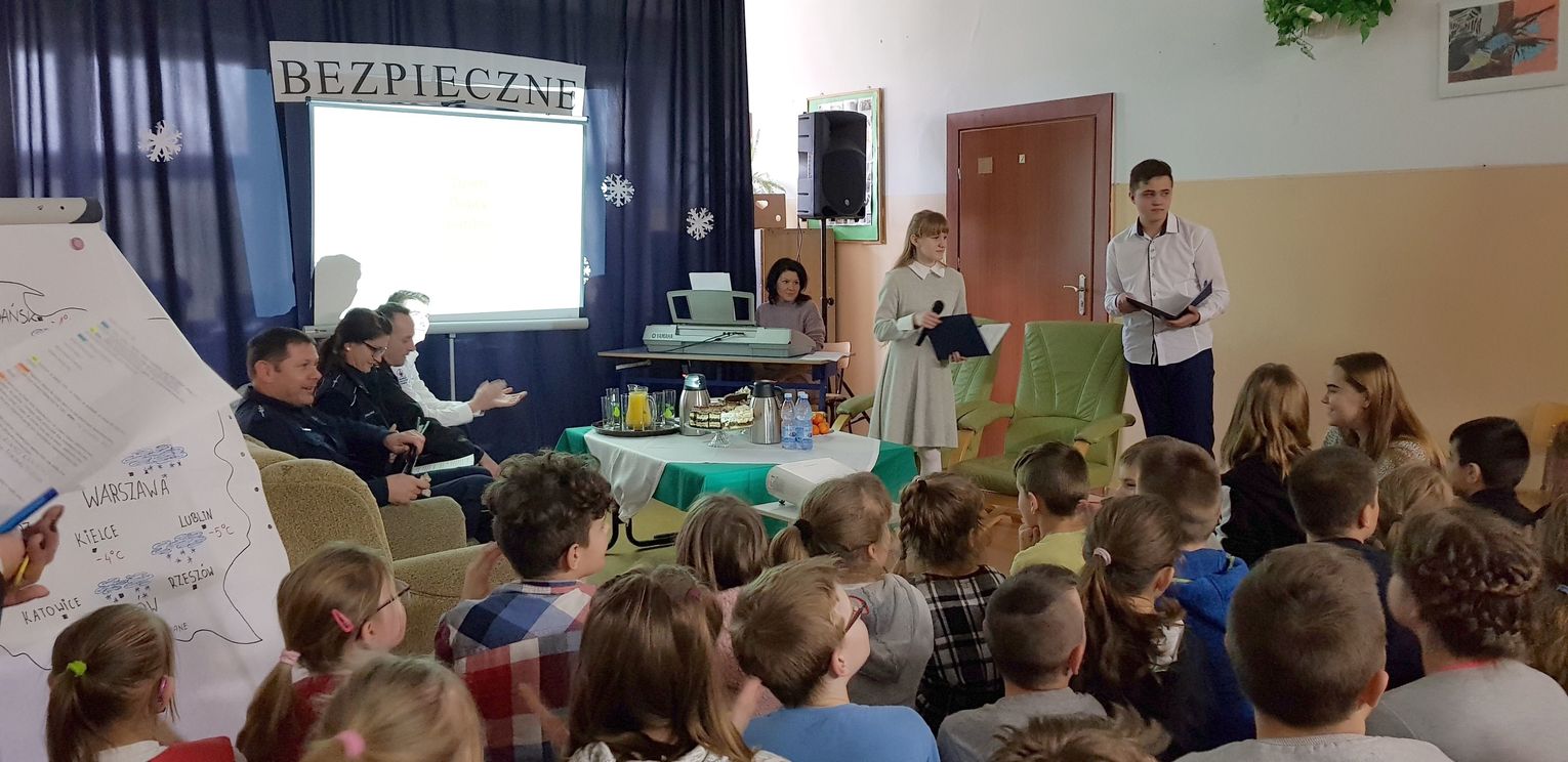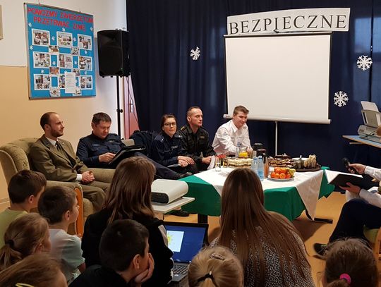Goście odpowiadali na pytania dotyczące bezpieczeństwa uczniów i ich rodzin podczas ferii zimowych, a zadawali je Ada Respondowska z klasy 3bg i Mikołaj Borsuk z klasy 8a.