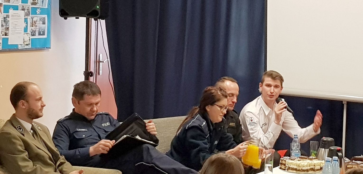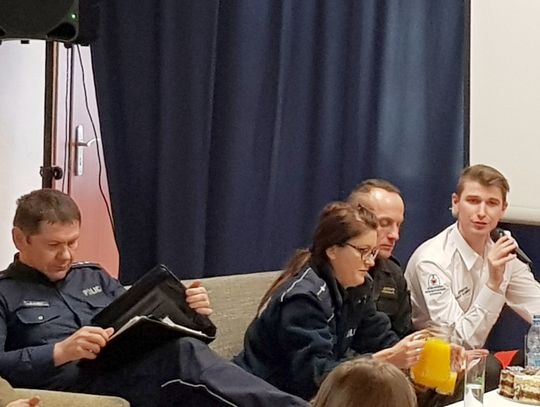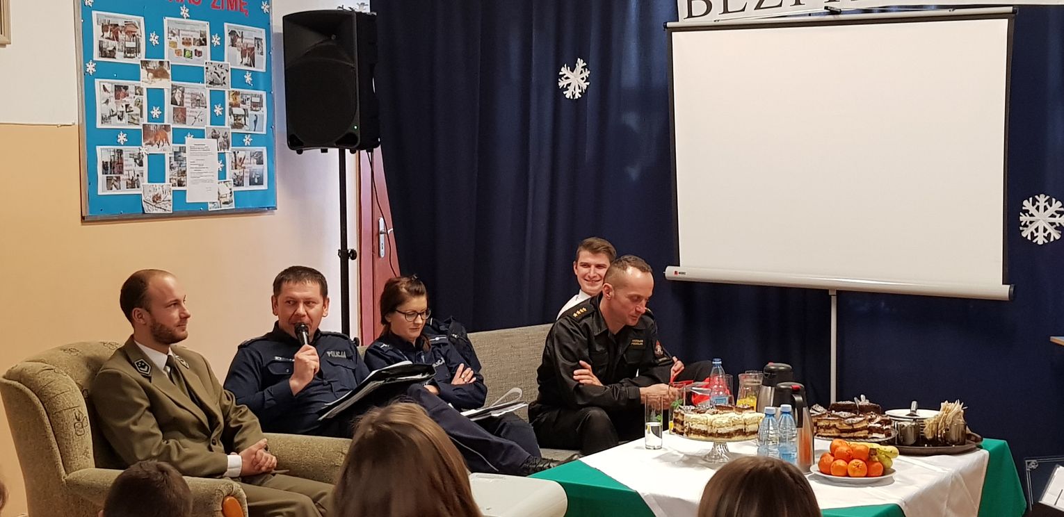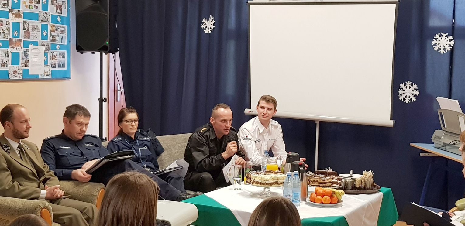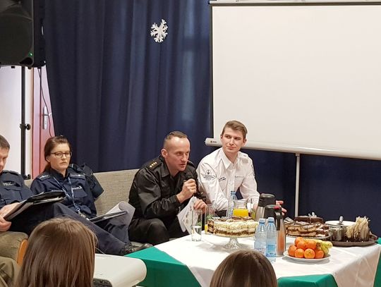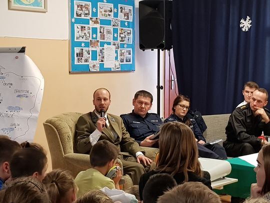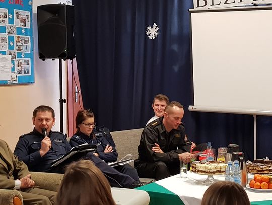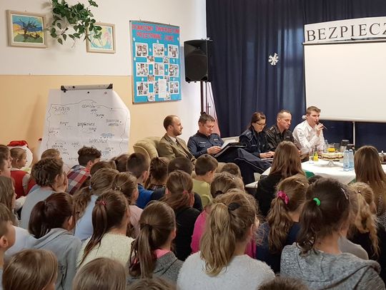 Goście odpowiadali na pytania dotyczące bezpieczeństwa uczniów i ich rodzin podczas ferii zimowych, a zadawali je Ada Respondowska z klasy 3bg i Mikołaj Borsuk z klasy 8a.