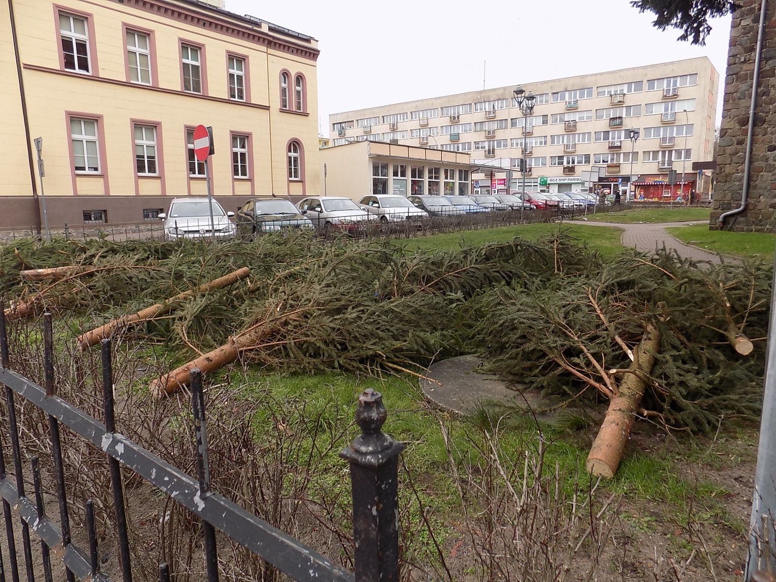 Przed kościołem leżą choinki. Spełniły swoje zadanie i zamiast na śmietnikach, pewno w jakimś piecu posłużą za opał.