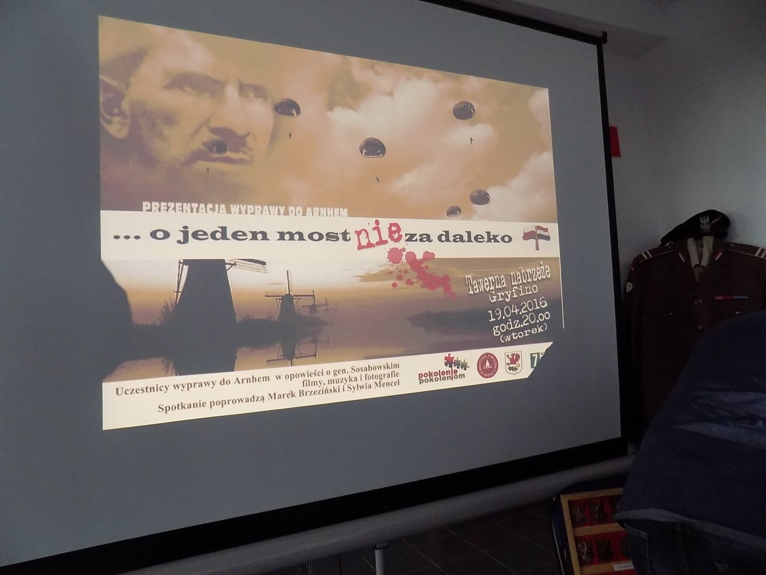 Grupa wstąpiła także do miasteczka Arnhem, znanego już mieszkańcom Gryfina z rekonstrukcji bitwy toczącej się na gryfińskim nabrzeżu. I nagle w malej salce w „tawernie” pojawiły się mosty. Ten oświetlony latarniami za oknem i ten z żołnierzami, czołgiem i wybuchami na kadrze filmowym, i ten prawdziwy. W małej salce, wypełnionej nie tylko stałymi bywalcami Markowych spotkań, wróciły wspomnienia, również o gen. Sosobowskim, żołnierzach gen. Andersa i niedźwiedziu Wojtku, o mostach, które powinny zawsze łączyć.