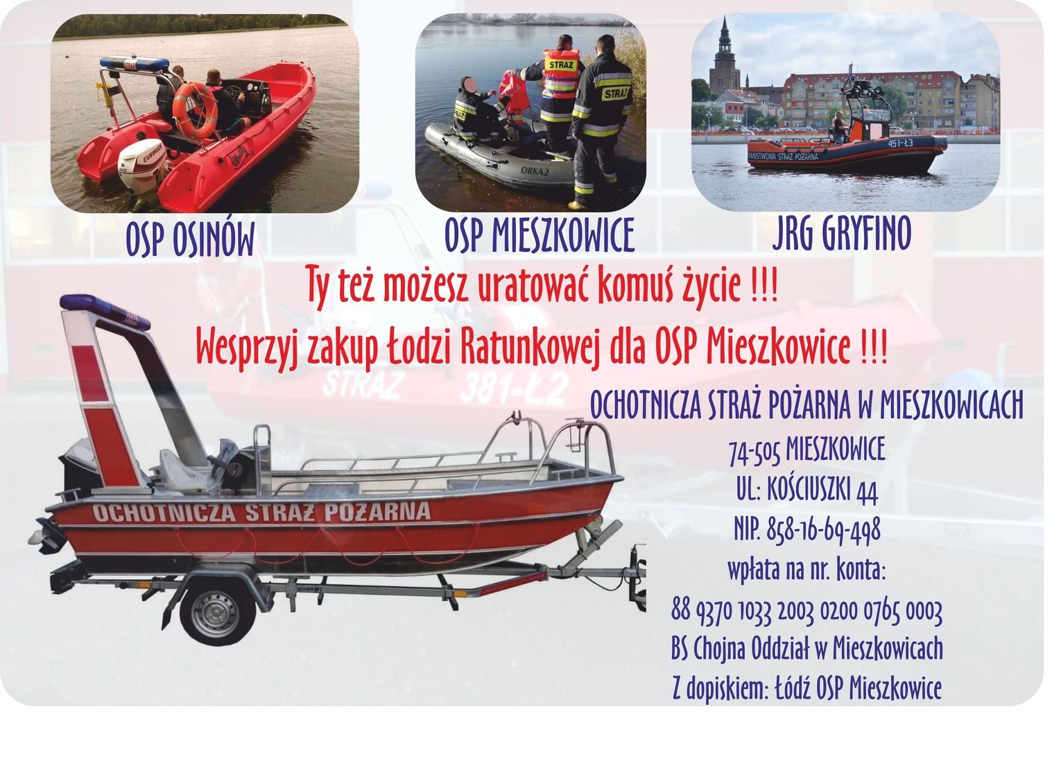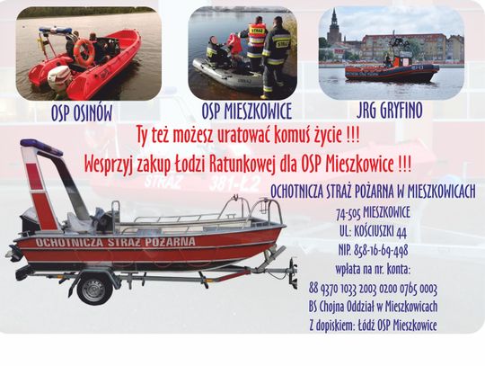W związku z powyższym, Zarząd Ochotniczej Straży Pożarnej w Mieszkowicach zwraca się z prośbą o wsparcie finansowe na zakupu profesjonalnej łodzi ratowniczej. Każda złotówka wpłacona na nasze konto może przyczynić się do skuteczniejszej akcji ratunkowej.