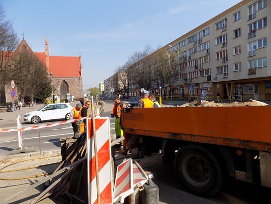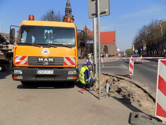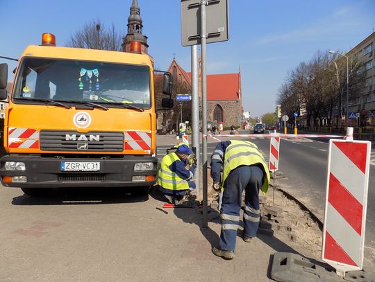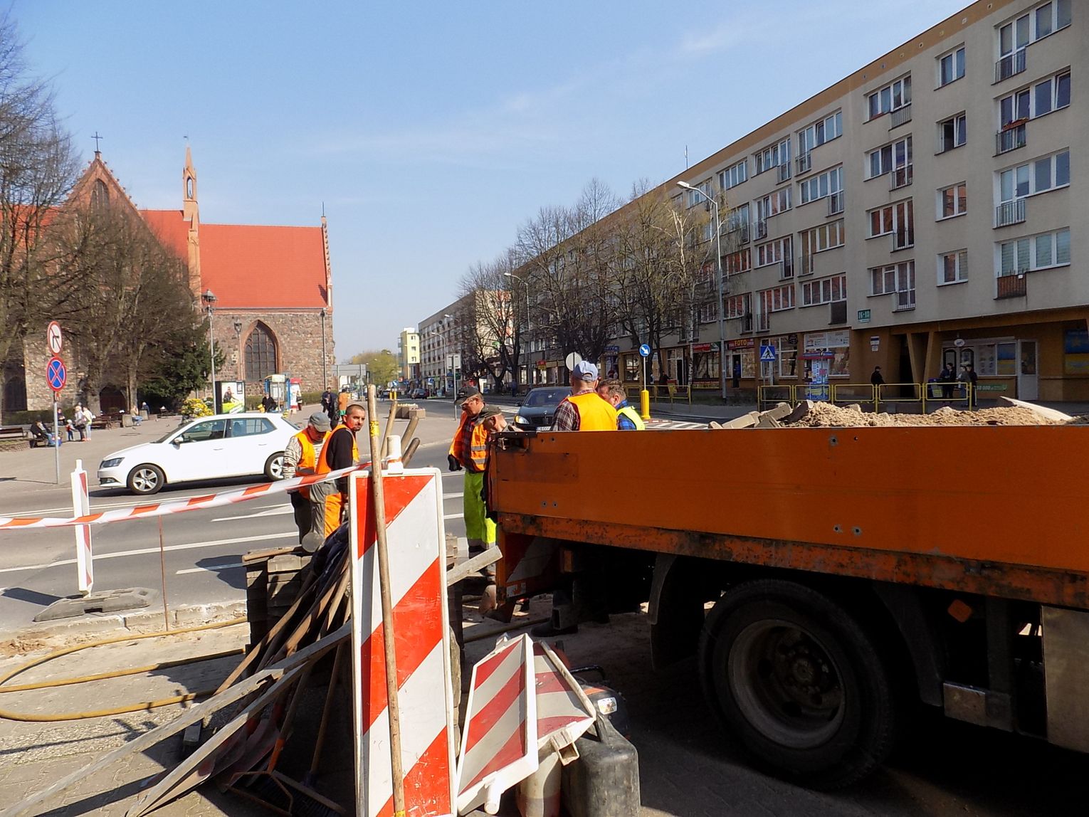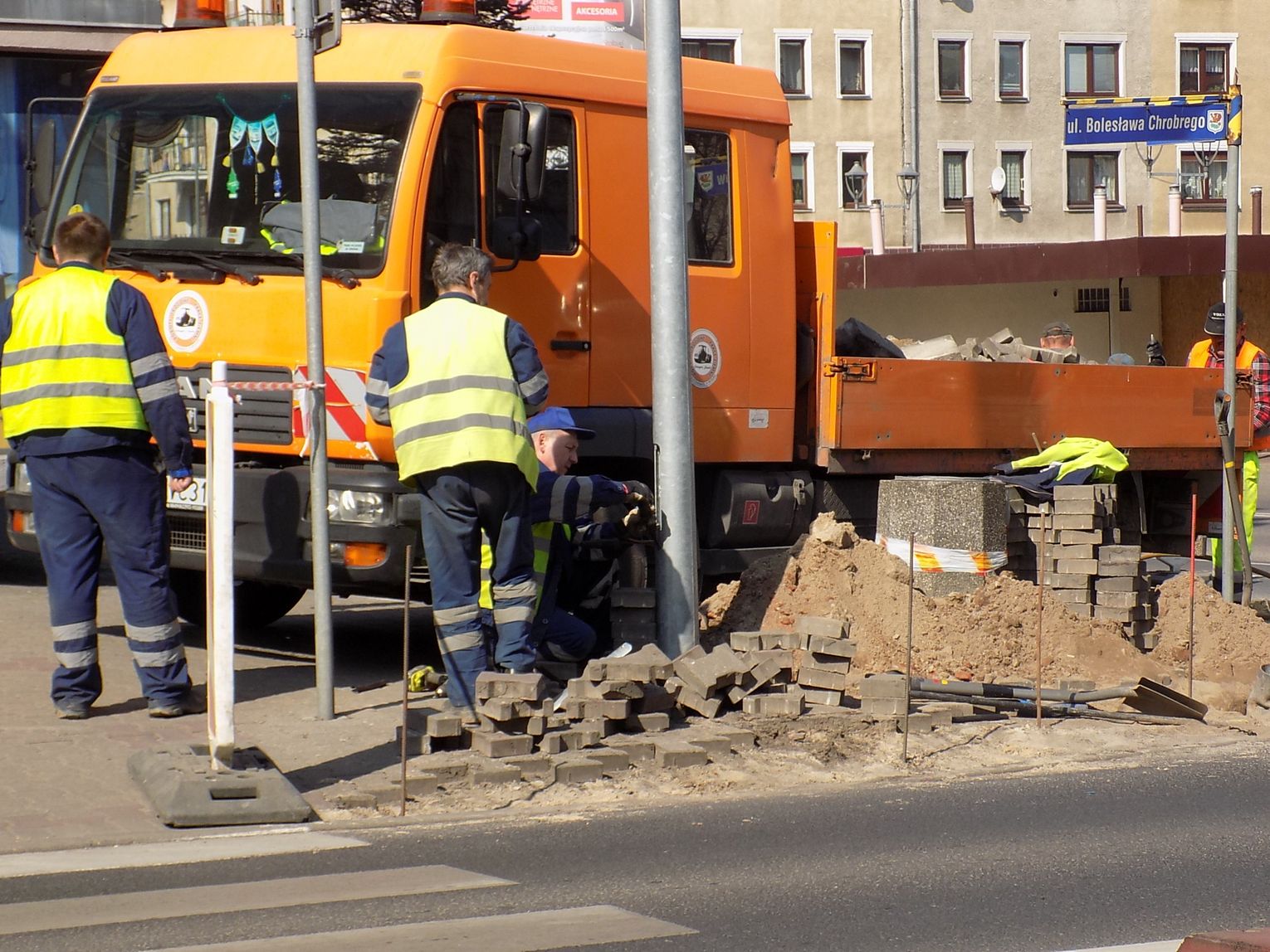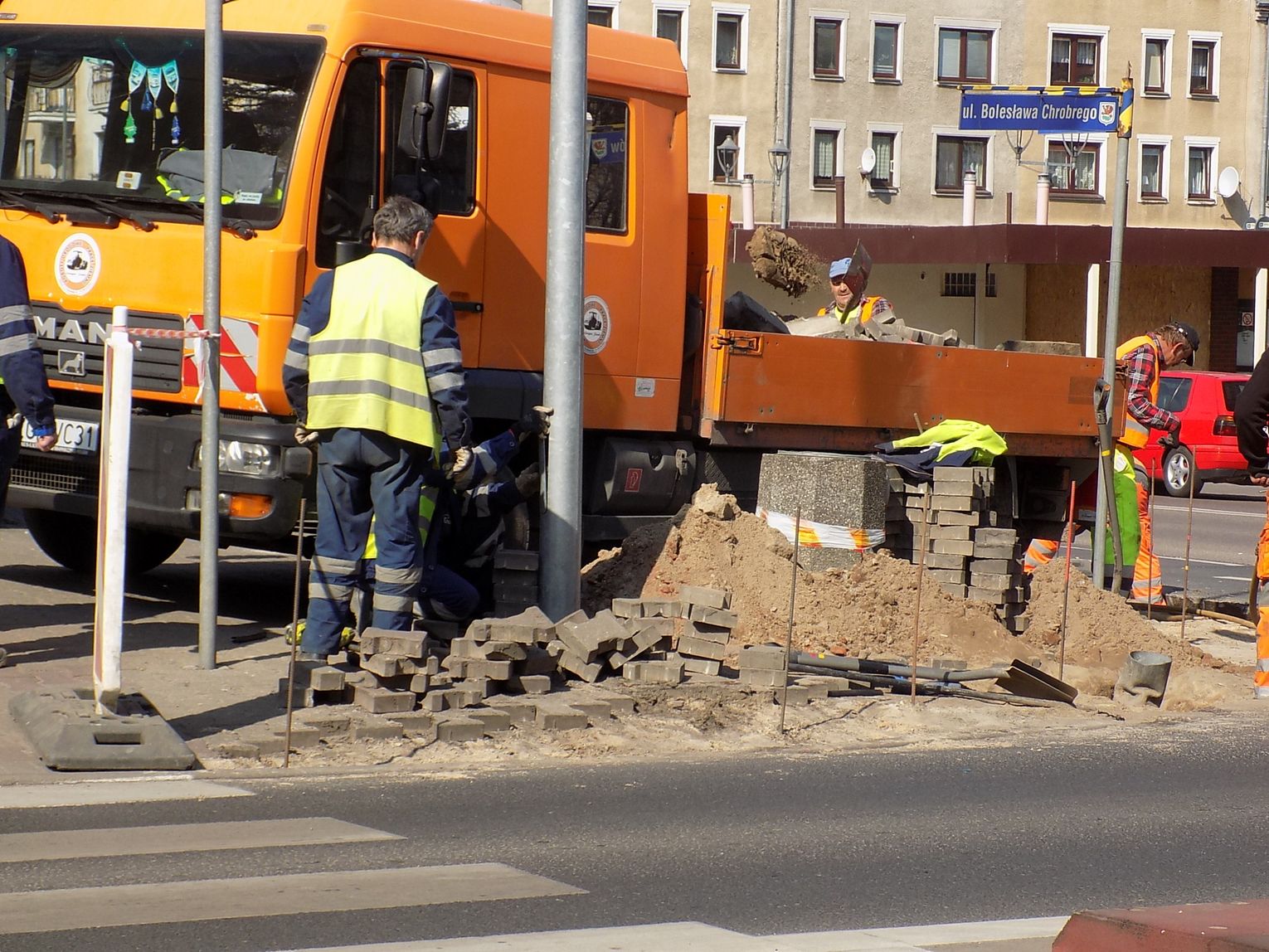 Przy okazji montowania lampy ścięta została część chodnika, tak aby samochody łatwiej mogły skręcać z ul. Piastów w lewo.