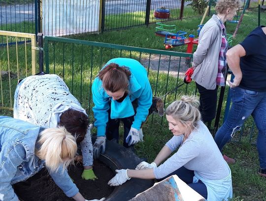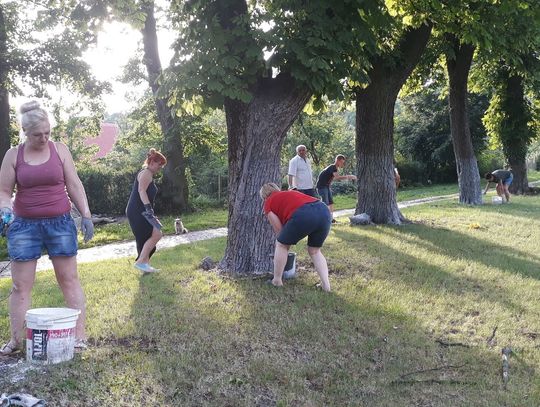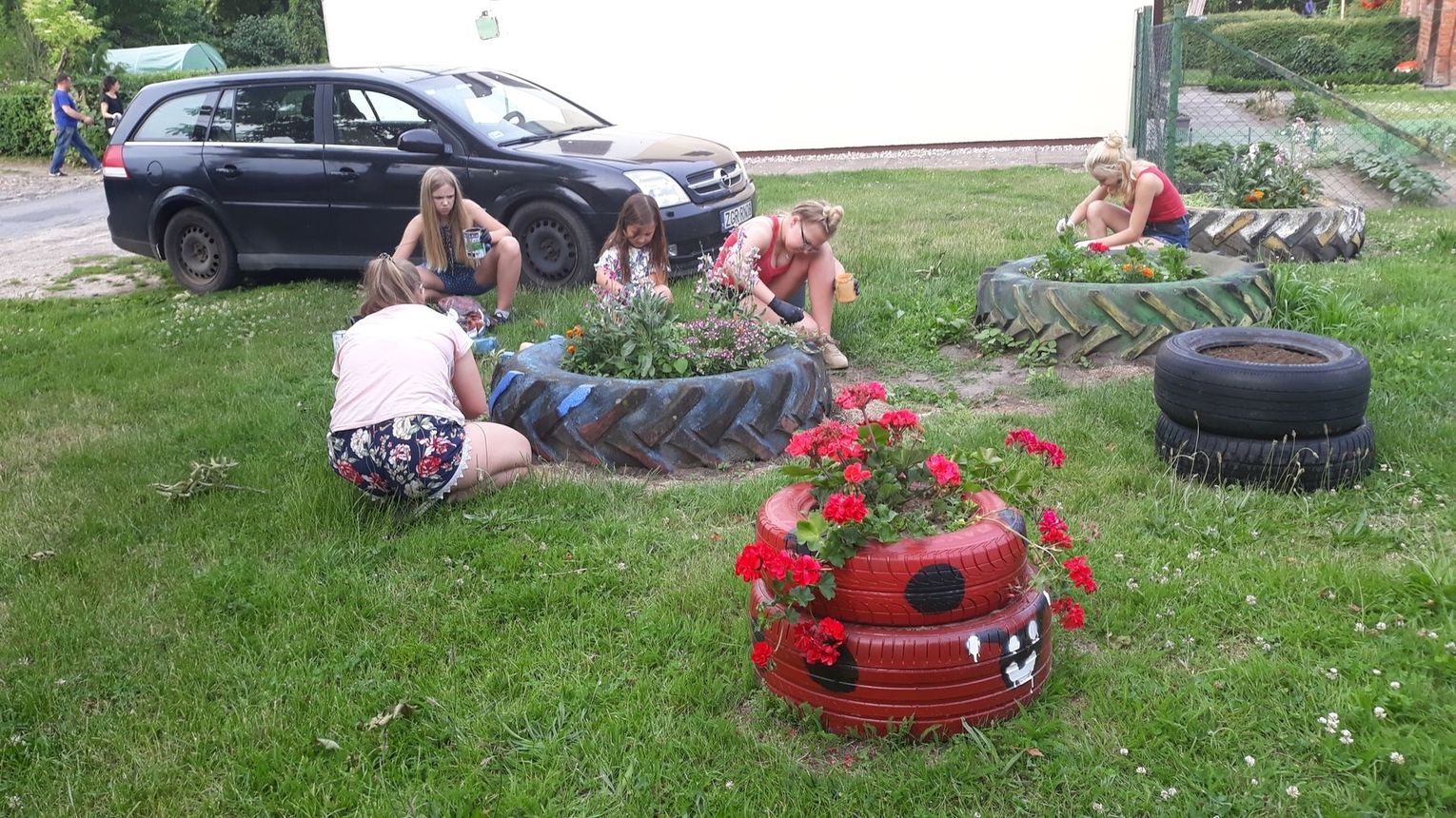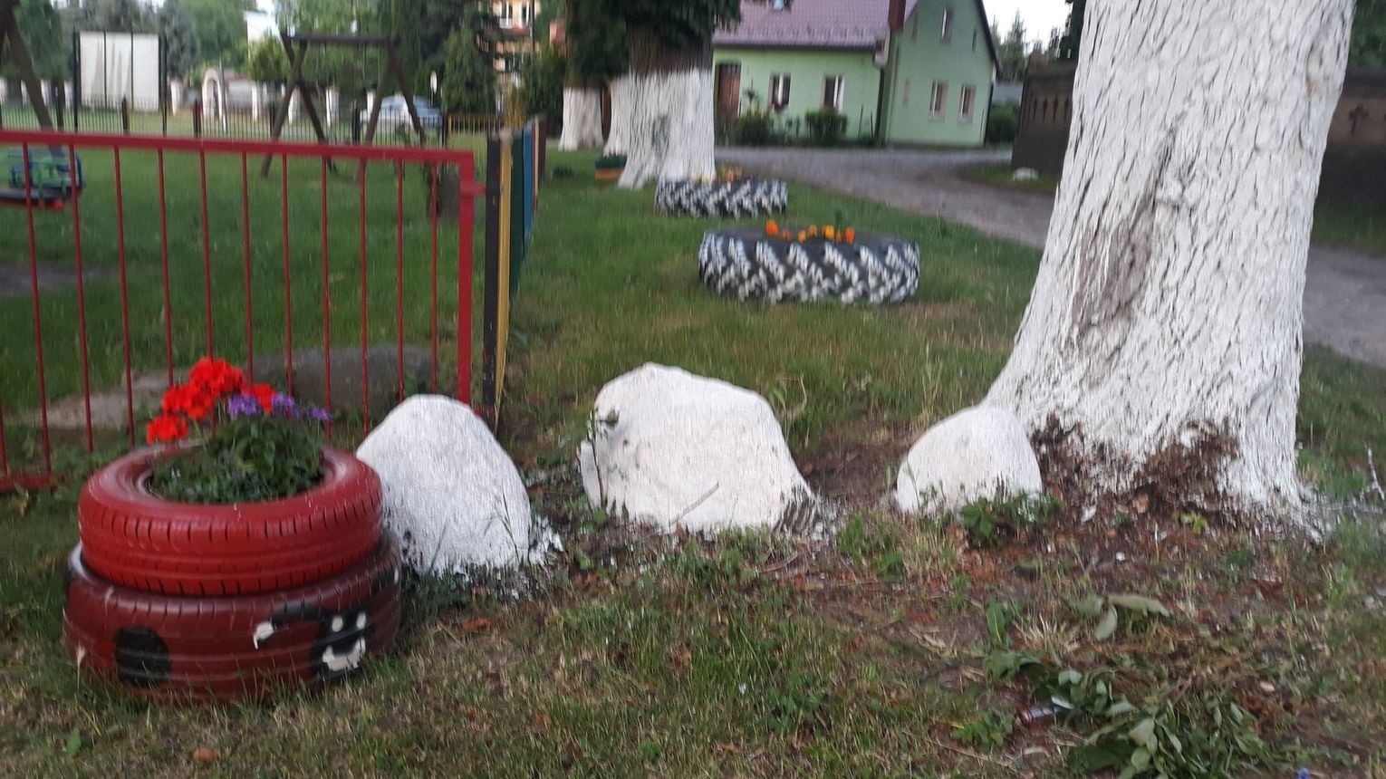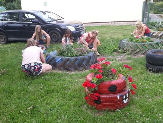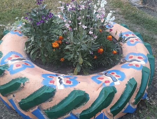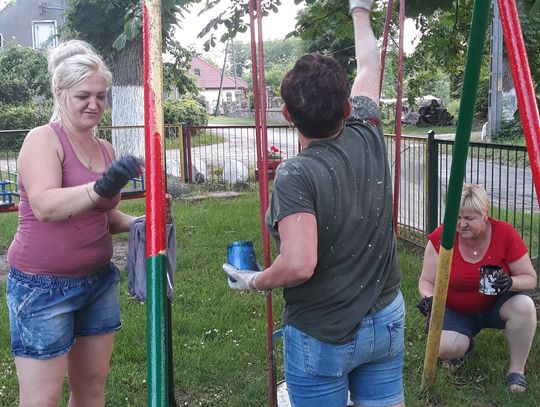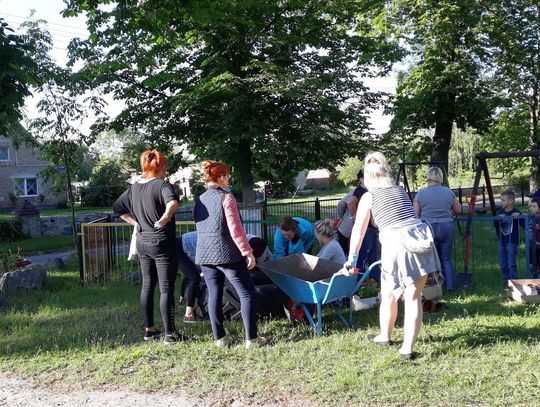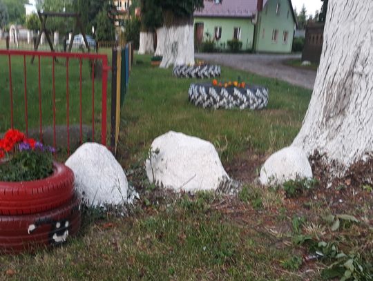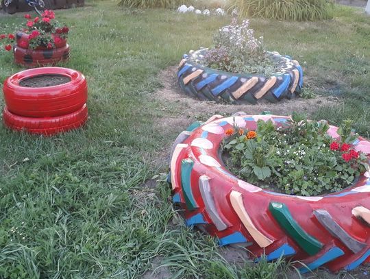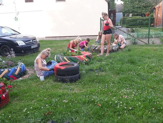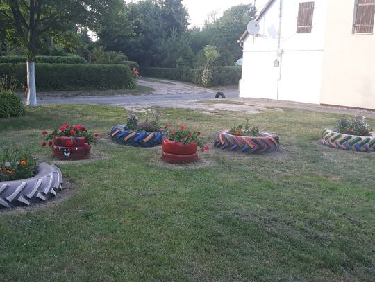 Szczególnie serdecznie dziękujemy zaangażowanym mieszkańcom naszej miejscowości za poświęcenie swojego wolnego czasu na pracę w czynie społecznym, jakim było zrobienie klombów z opon, pomalowanie i obsadzenie kwiatami, o białkowanie drzew, pomalowanie huśtawek na placu zabaw.