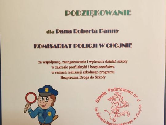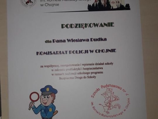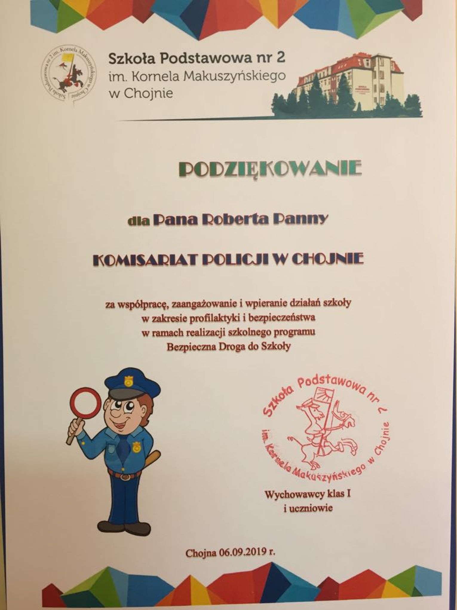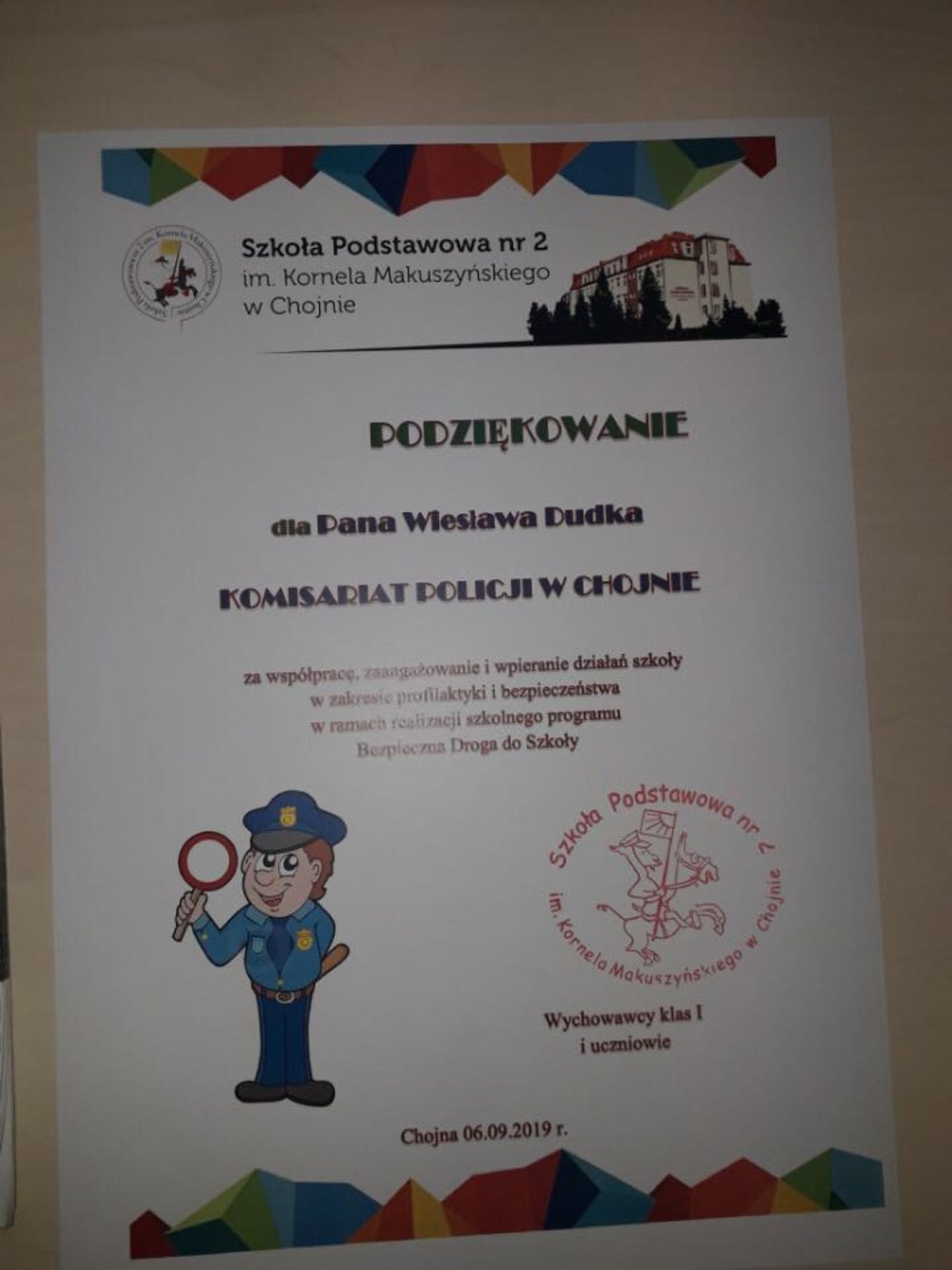 Wraz z rozpoczęciem szkoły Policjanci przeprowadzili ogólnopolskie działania pod nazwą „Bezpieczna droga do szkoły”. Celem tych działań jest zapewnienie bezpieczeństwa dzieciom przemieszczającym się do szkoły i ze szkoły do miejsca zamieszkania. Funkcjonariusze Komisariatu Policji w Chojnie odwiedzili w dniu 06.09.2019 r. uczniów i przedszkolaków z SP nr 1 i 2 w Chojnie. Łącznie przeszkolono 163 uczniów, w tym 83 z klasy ,,0” i 80 uczniów klas pierwszych. Zorganizowali zajęcia teoretyczno-praktyczne dla dzieci i młodzieży. Omówili zagadnienia związane z ruchem drogowym, w tym elementarne zasady bezpieczeństwa obowiązujące w ruchu drogowym w obszarze zabudowanym i poza nim. Podczas spotkania szczególną uwagę funkcjonariusze zwrócili na zasady obowiązujące przy przewożeniu dzieci samochodem i jak należy zachować się jeżdżąc rowerem, na obowiązek noszenia przez pieszych po zmroku poza strefą zabudowaną elementów odblaskowych lub kamizelek, a także jak prawidłowo poruszać się po jezdni i przechodzić po przejściu dla pieszych.