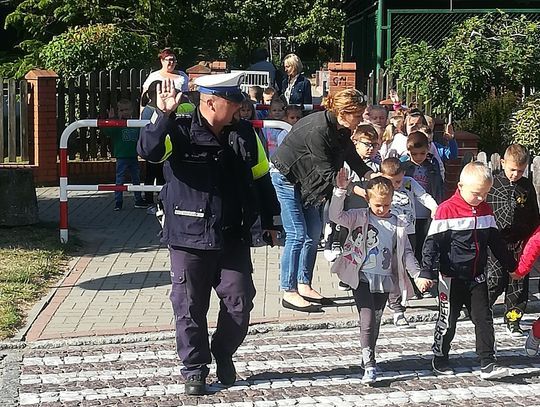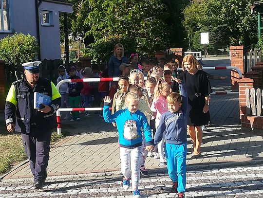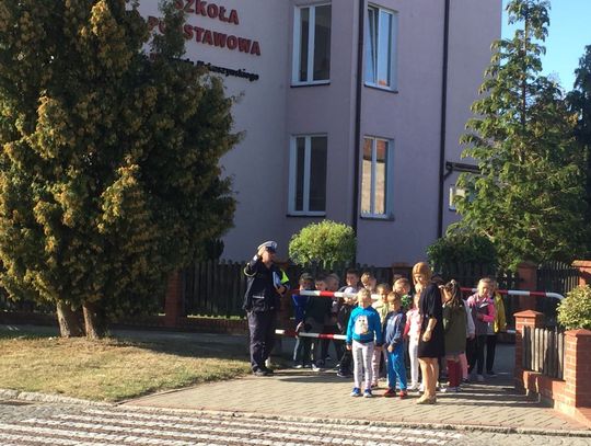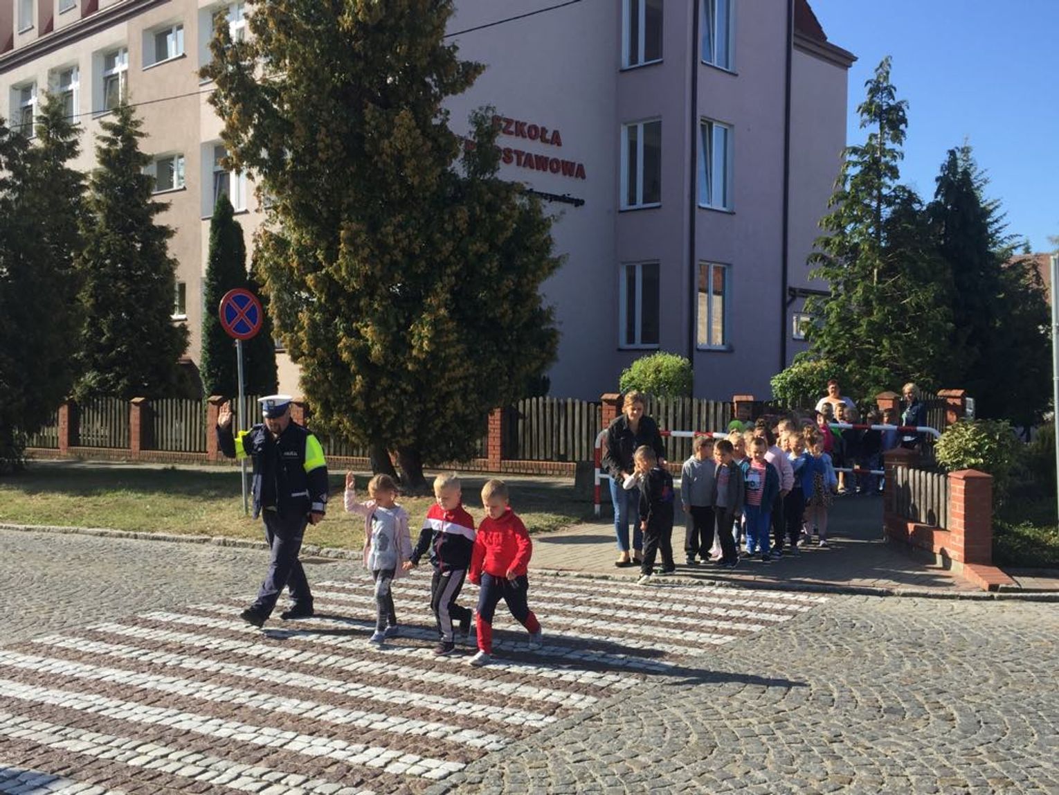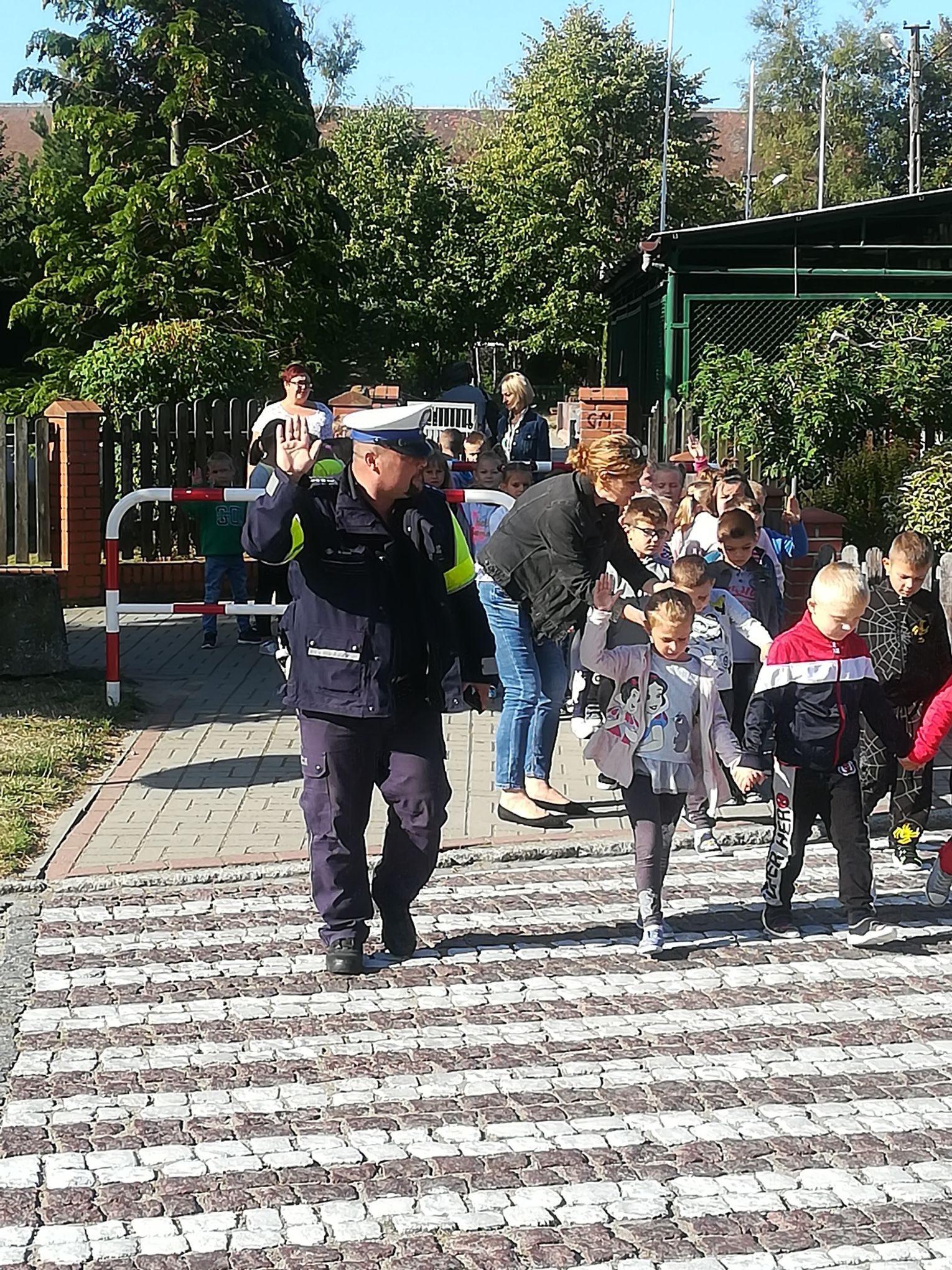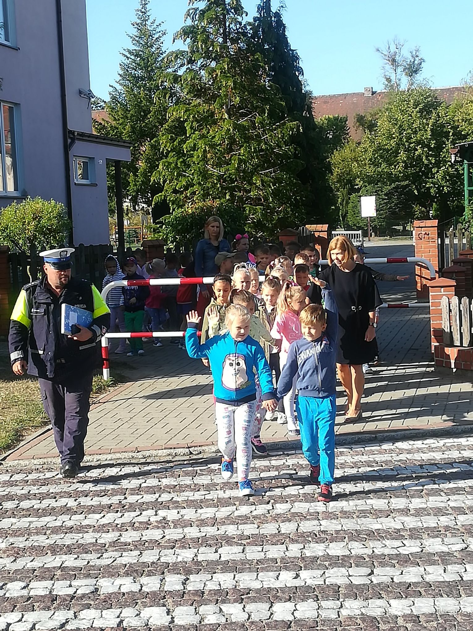 Następnie przedszkolaki i uczniowie kl. I-szych razem z policjantami udali się na przejście dla pieszych, gdzie odbyły się praktyczne ćwiczenia na pasach. Policjanci pomagali przechodzić przez jezdnię i dbali, aby każde dziecko w prawidłowy sposób reagowało na drodze. Dzieci z dużym zaangażowanie brały udział w zajęciach i chętnie odpowiadały na pytania.