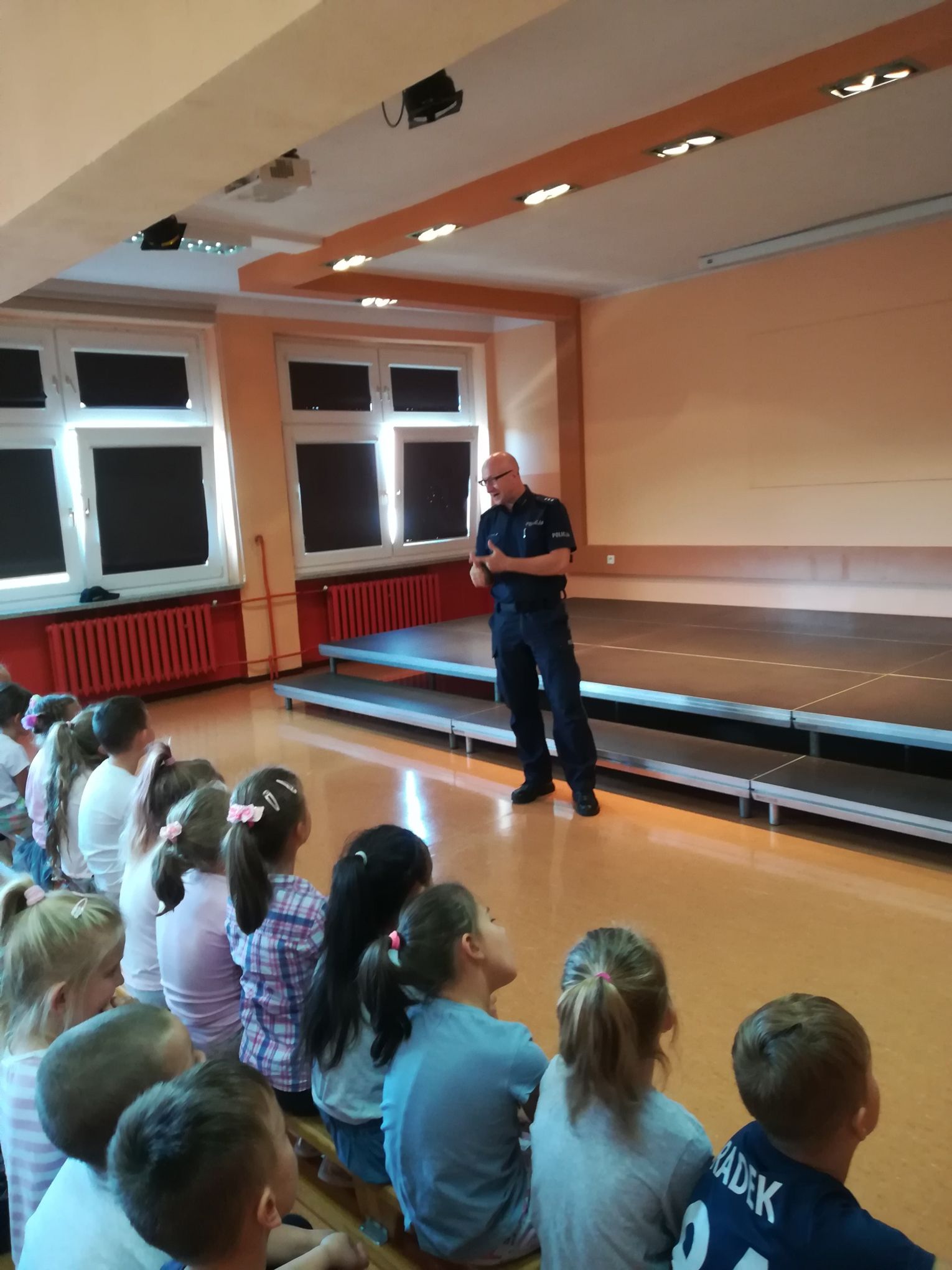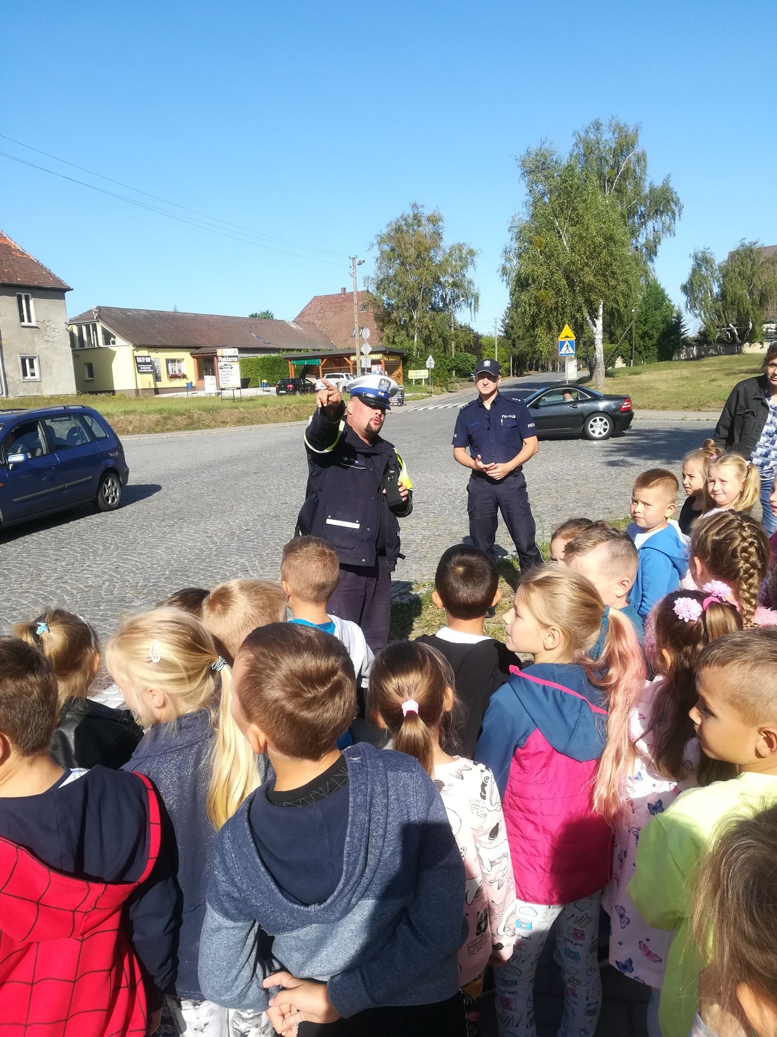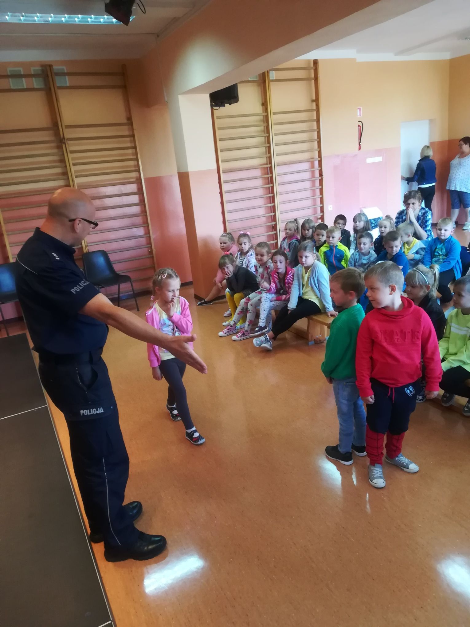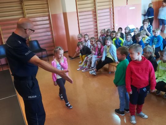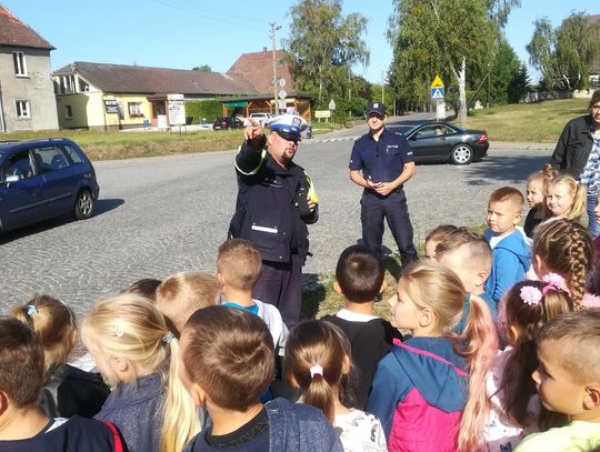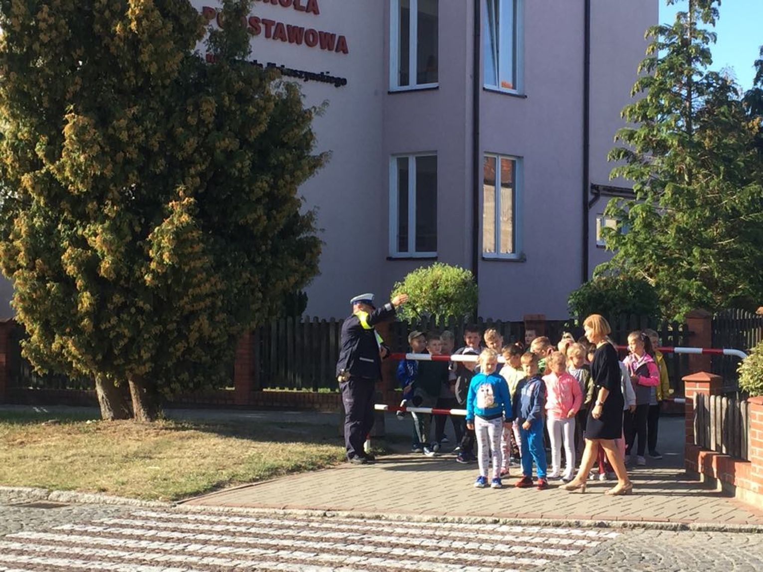 Następnie przedszkolaki i uczniowie kl. I-szych razem z policjantami udali się na przejście dla pieszych, gdzie odbyły się praktyczne ćwiczenia na pasach. Policjanci pomagali przechodzić przez jezdnię i dbali, aby każde dziecko w prawidłowy sposób reagowało na drodze. Dzieci z dużym zaangażowanie brały udział w zajęciach i chętnie odpowiadały na pytania.