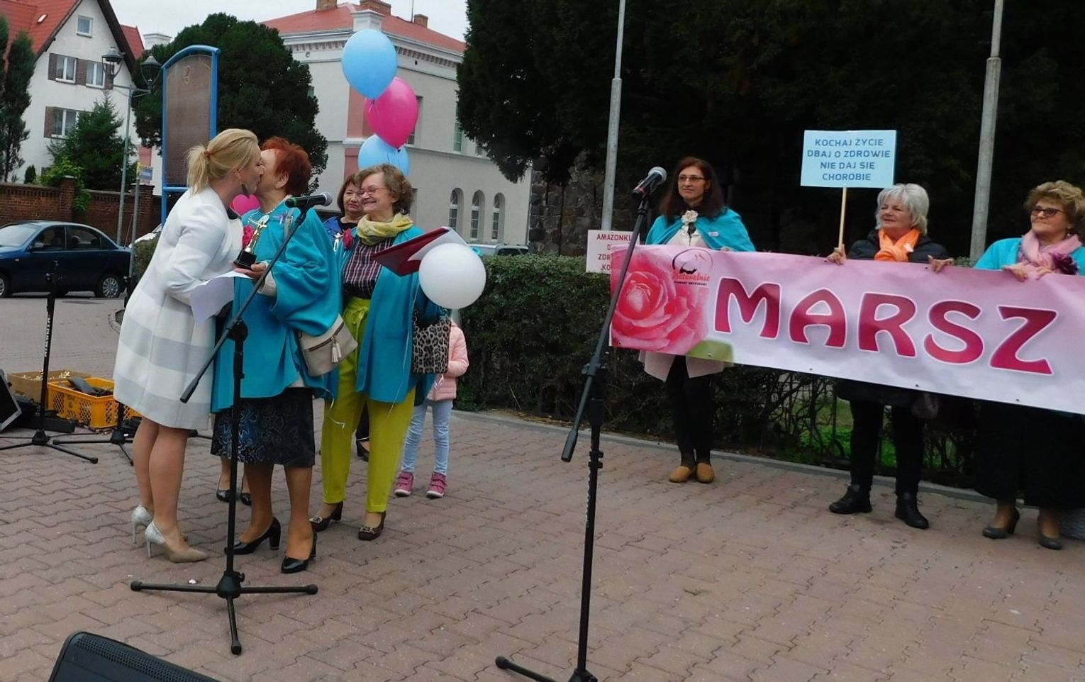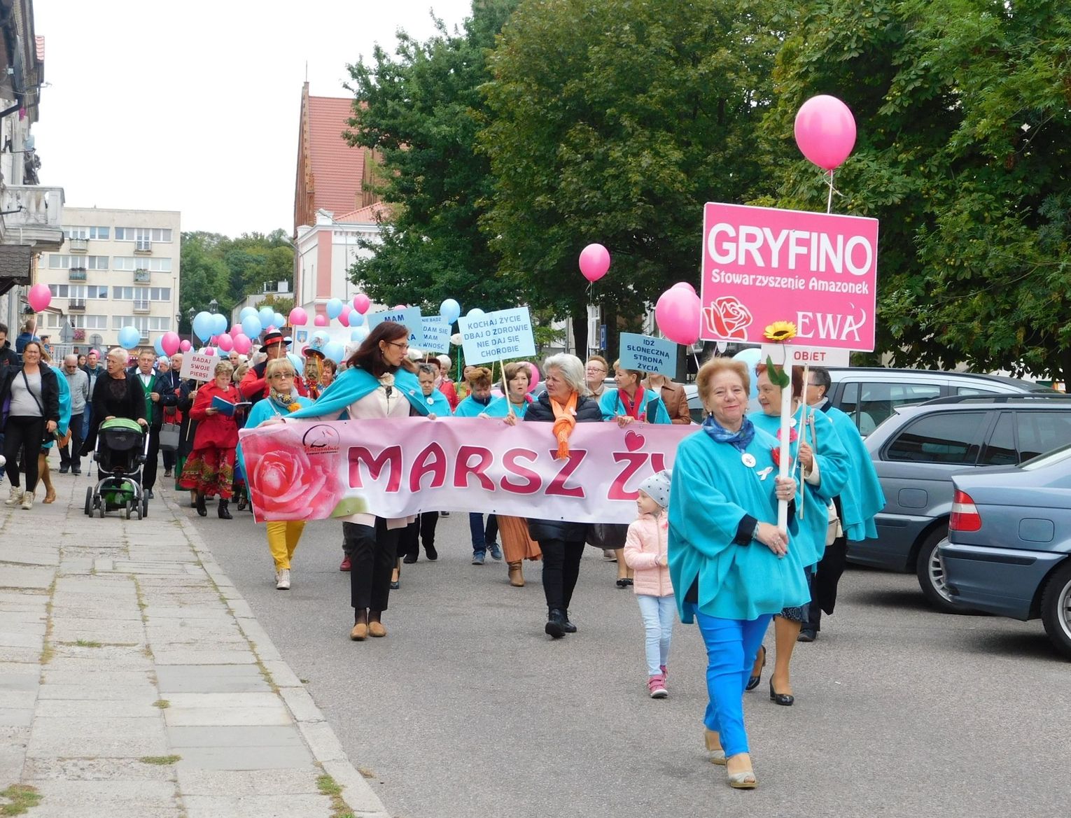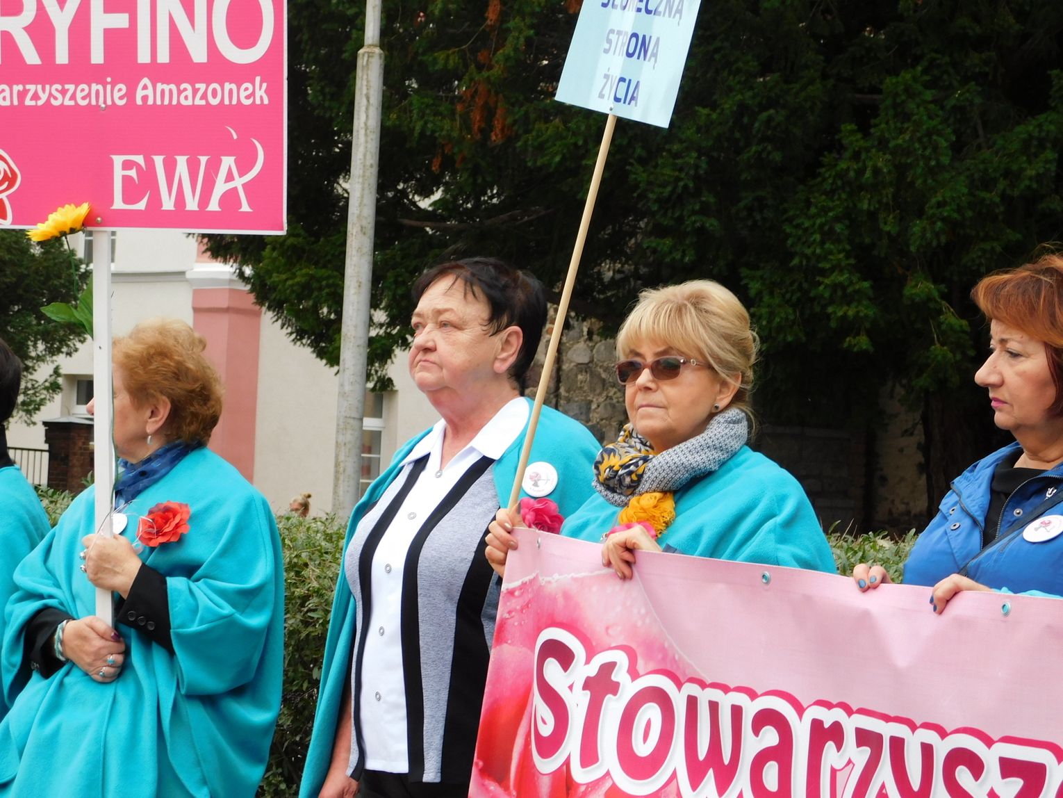 Po mszy świętej przed Klubem Nauczyciela na ul. Kościelnej uformował się kokardkowy różowo- niebieski pochód, od kilku już lat organizowany przez Stowarzyszenie Amazonek „Ewa” w Gryfinie. Jedenaście lat walki kobiet i siedem lat walki mężczyzn o zdrowie. Walki trudnej, ale możliwej do wygrania, czego dowodem są te wspólne spotkania.