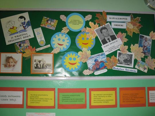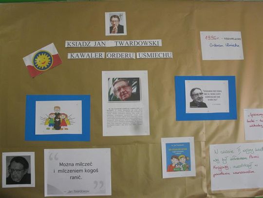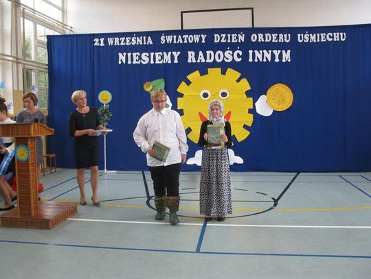 Następnie poznaliśmy laureatów szkolnego konkursu literackiego ,,Moja szkoła, mój patron” oraz klasy nagrodzone za gazetkę poświęconą patronowi. Uczniowie napisali wiele ciepłych słów o szkole, swoich klasach, nauczycielach, a także Kawalerach Orderu Uśmiechu. Wśród uczniów klas I-III pierwsze miejsce zajął Filip Gobis, drugie Borys Matuszak, trzecie Oliwier Rutkowski – wszyscy z klasy III. W kategorii klas V-VIII najlepszy tekst napisał Miłosz Ziętek, druga była Karolina Kozak, a trzecie miejsce przypadło Marzenie Zalewskiej. Nagrodzeni uczniowie
