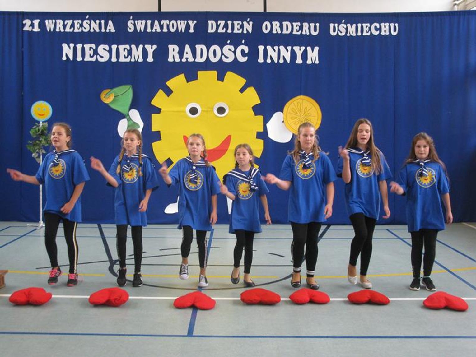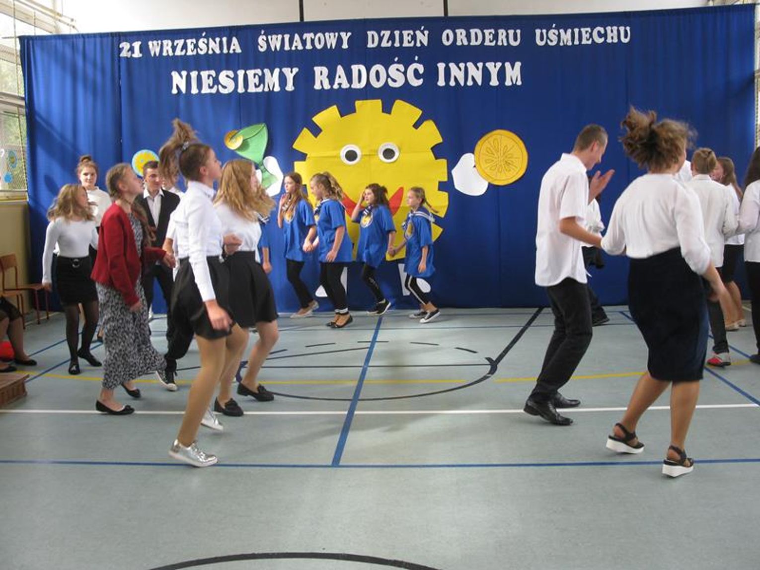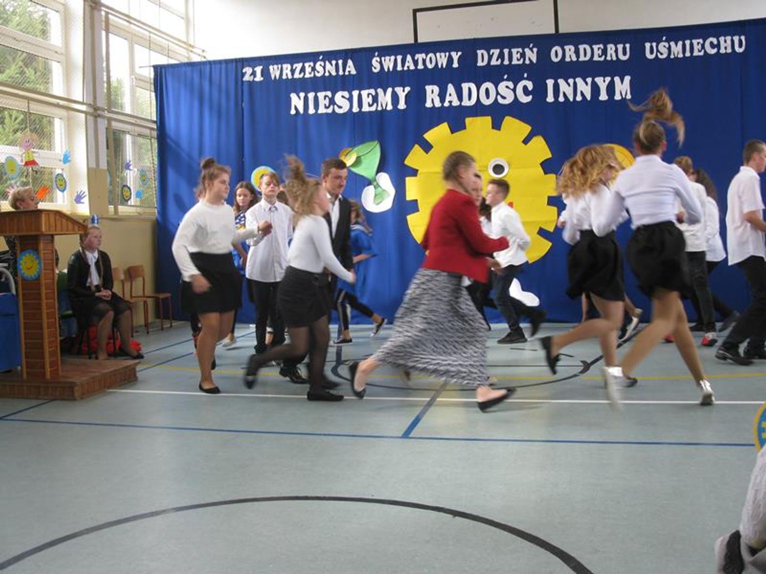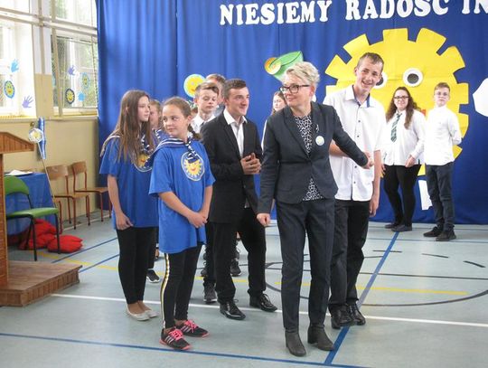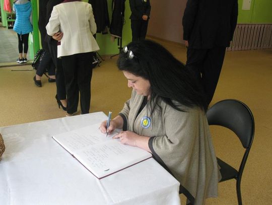 Pani Krystynie Czerwińskiej -Twarowskiej, Panu Januszowi Czyżowi, Panu Jackowi Janiakowi- Kawalerom Orderu Uśmiechu, dedykowaliśmy utwór ,,Hej, Bałtyckie Morze” w wykonaniu wszystkich uczniów, natomiast Janowi Pawłowi II zaśpiewaliśmy ,,Barkę” wspólnie z klasą VIII. Miłą niespodziankę dla Pani Kurator przygotowali uczniowie dedykując napisaną przez siebie piosenkę oraz wręczyli piękną czerwoną różę. Naszą uroczystość zakończył radosny taniec integracyjny. Pamiątką tego niecodziennego spotkania będzie wspólna fotografia oraz wpis w ,,Księdze pamiątkowej”.
