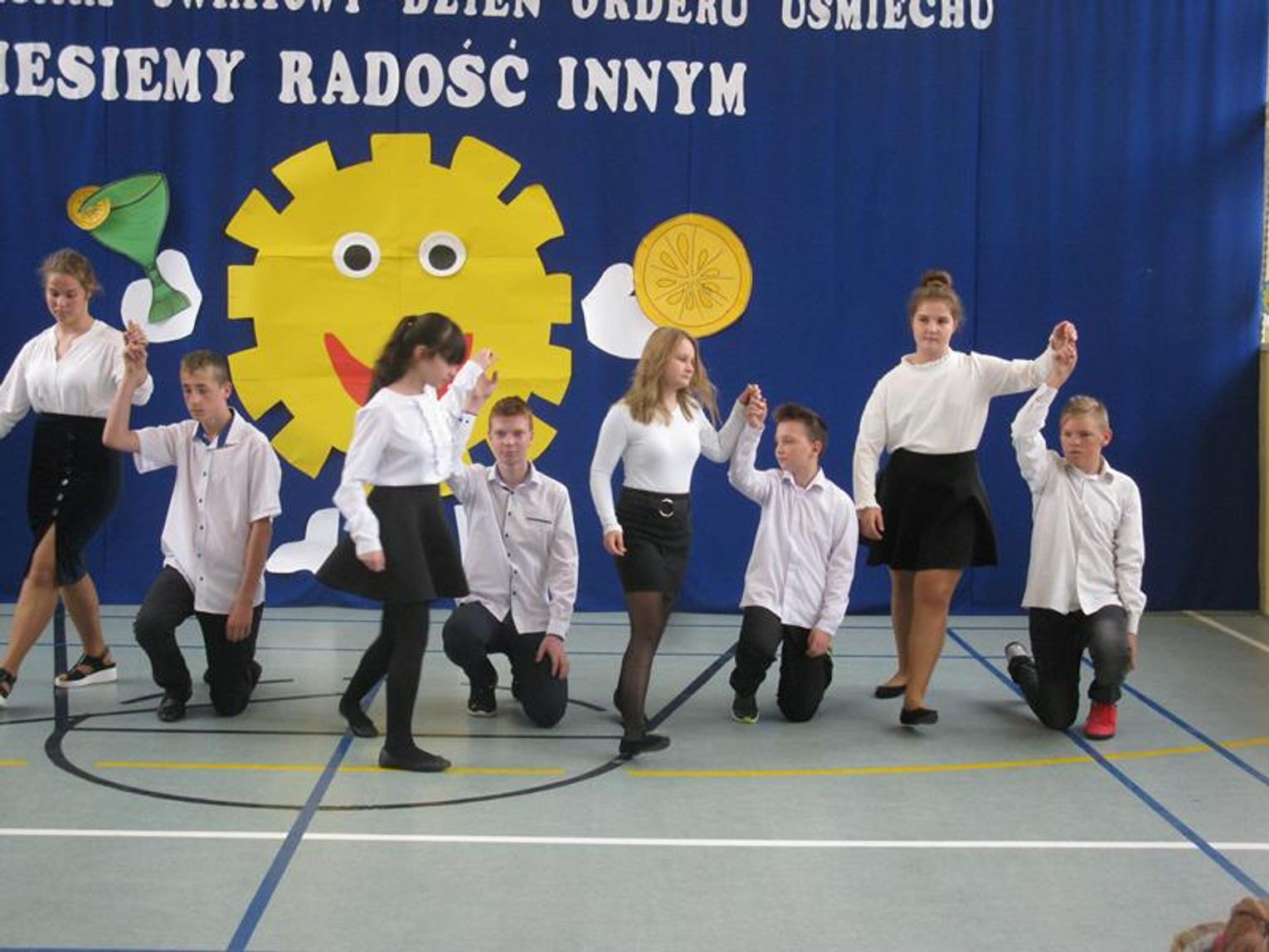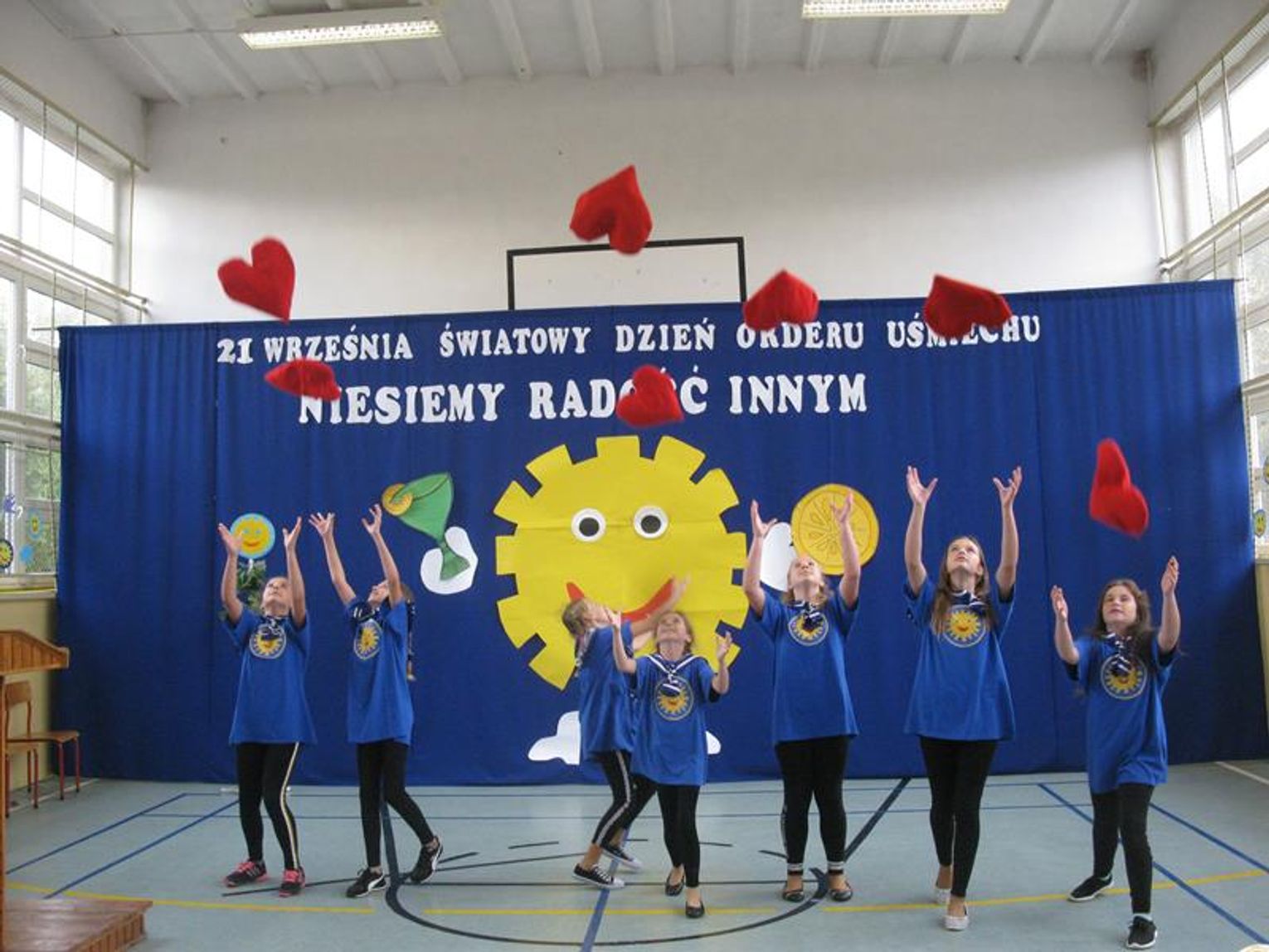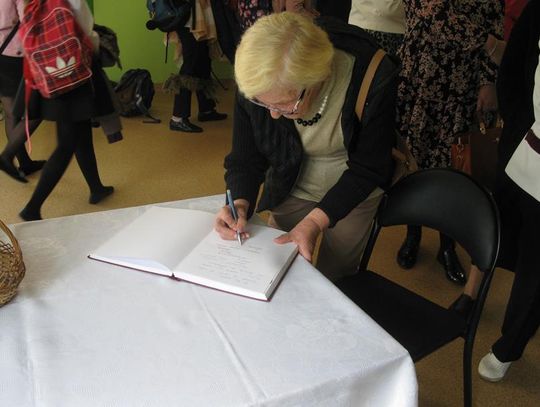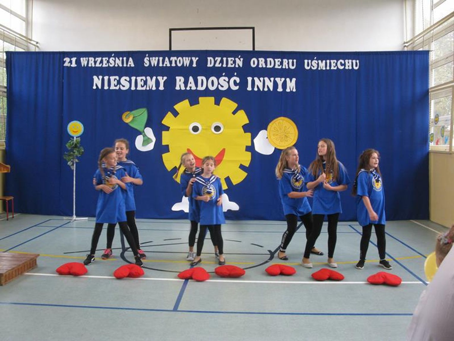 Pani Krystynie Czerwińskiej -Twarowskiej, Panu Januszowi Czyżowi, Panu Jackowi Janiakowi- Kawalerom Orderu Uśmiechu, dedykowaliśmy utwór ,,Hej, Bałtyckie Morze” w wykonaniu wszystkich uczniów, natomiast Janowi Pawłowi II zaśpiewaliśmy ,,Barkę” wspólnie z klasą VIII. Miłą niespodziankę dla Pani Kurator przygotowali uczniowie dedykując napisaną przez siebie piosenkę oraz wręczyli piękną czerwoną różę. Naszą uroczystość zakończył radosny taniec integracyjny. Pamiątką tego niecodziennego spotkania będzie wspólna fotografia oraz wpis w ,,Księdze pamiątkowej”.