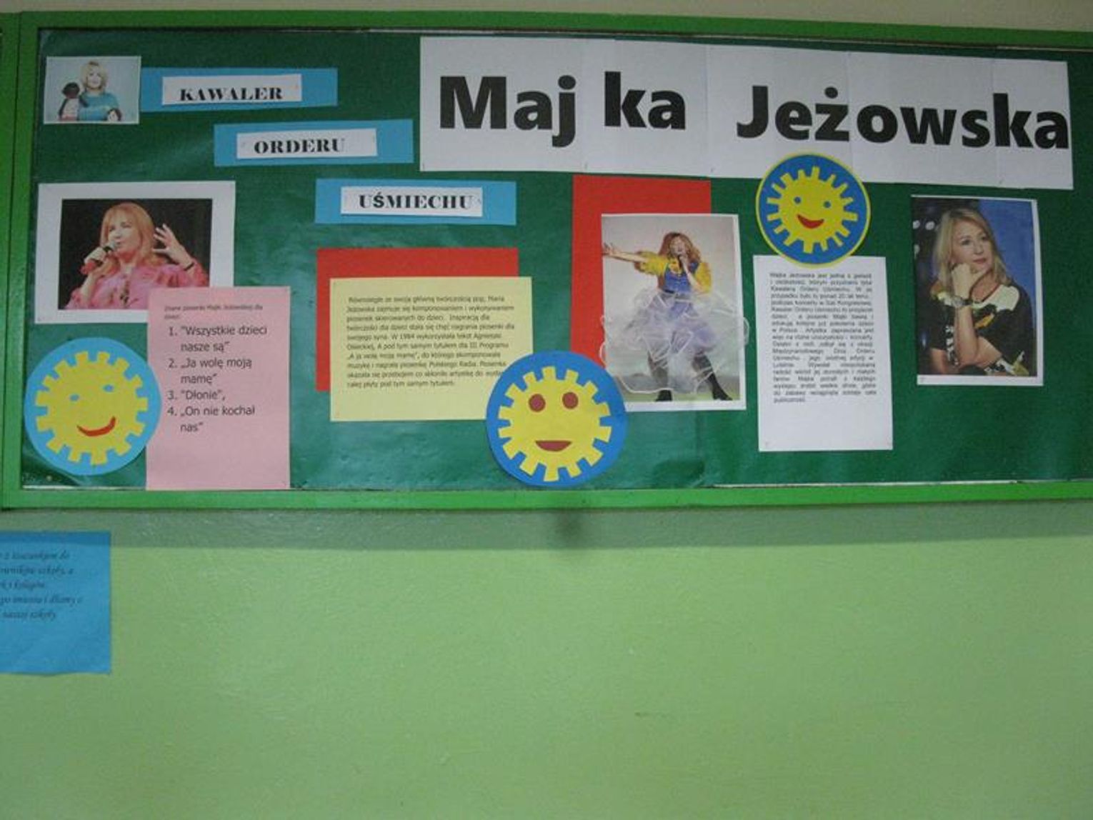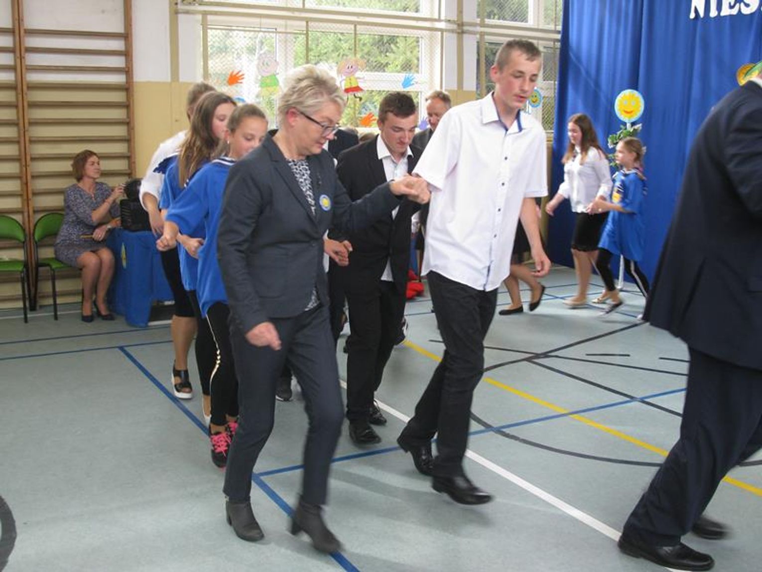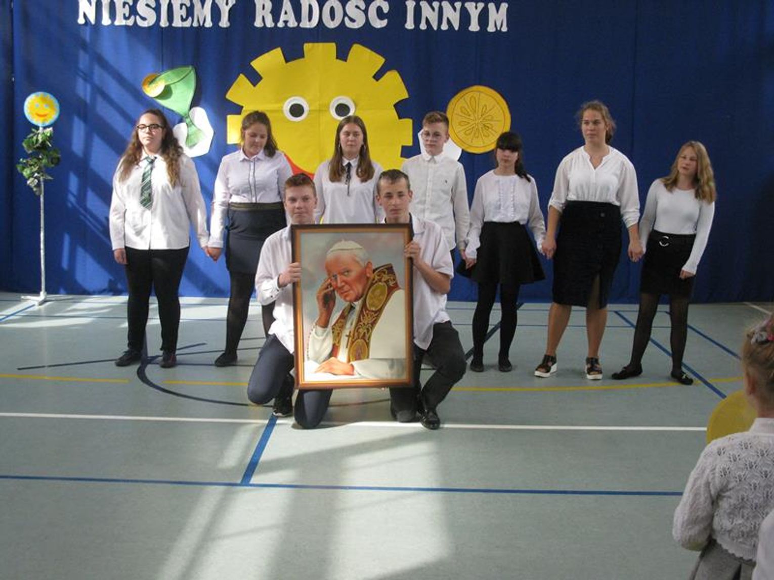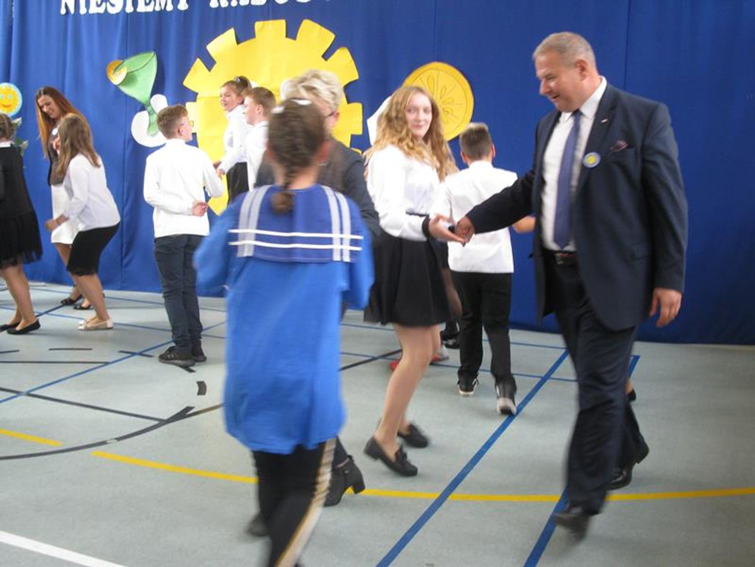 Pani Krystynie Czerwińskiej -Twarowskiej, Panu Januszowi Czyżowi, Panu Jackowi Janiakowi- Kawalerom Orderu Uśmiechu, dedykowaliśmy utwór ,,Hej, Bałtyckie Morze” w wykonaniu wszystkich uczniów, natomiast Janowi Pawłowi II zaśpiewaliśmy ,,Barkę” wspólnie z klasą VIII. Miłą niespodziankę dla Pani Kurator przygotowali uczniowie dedykując napisaną przez siebie piosenkę oraz wręczyli piękną czerwoną różę. Naszą uroczystość zakończył radosny taniec integracyjny. Pamiątką tego niecodziennego spotkania będzie wspólna fotografia oraz wpis w ,,Księdze pamiątkowej”.