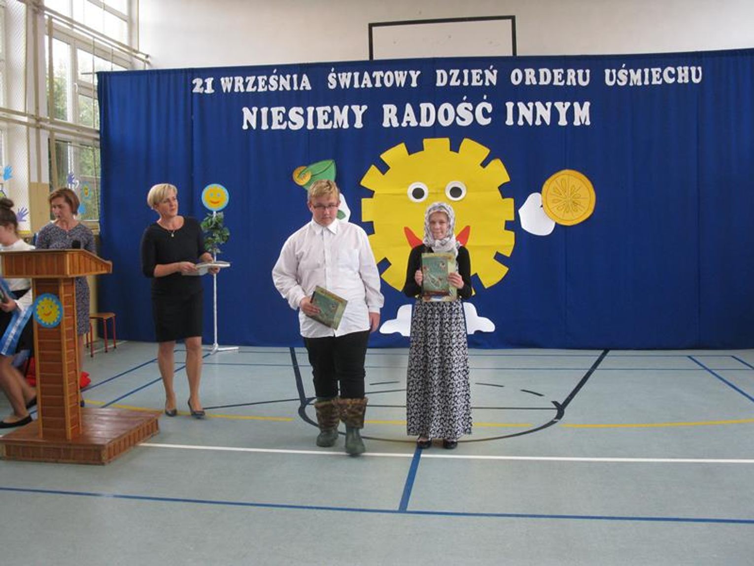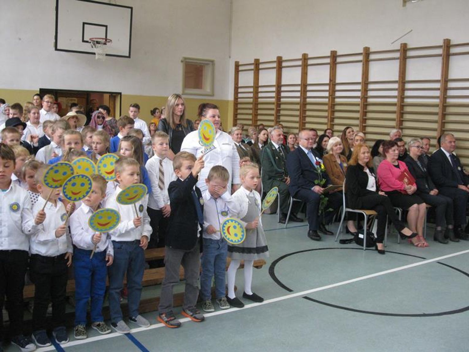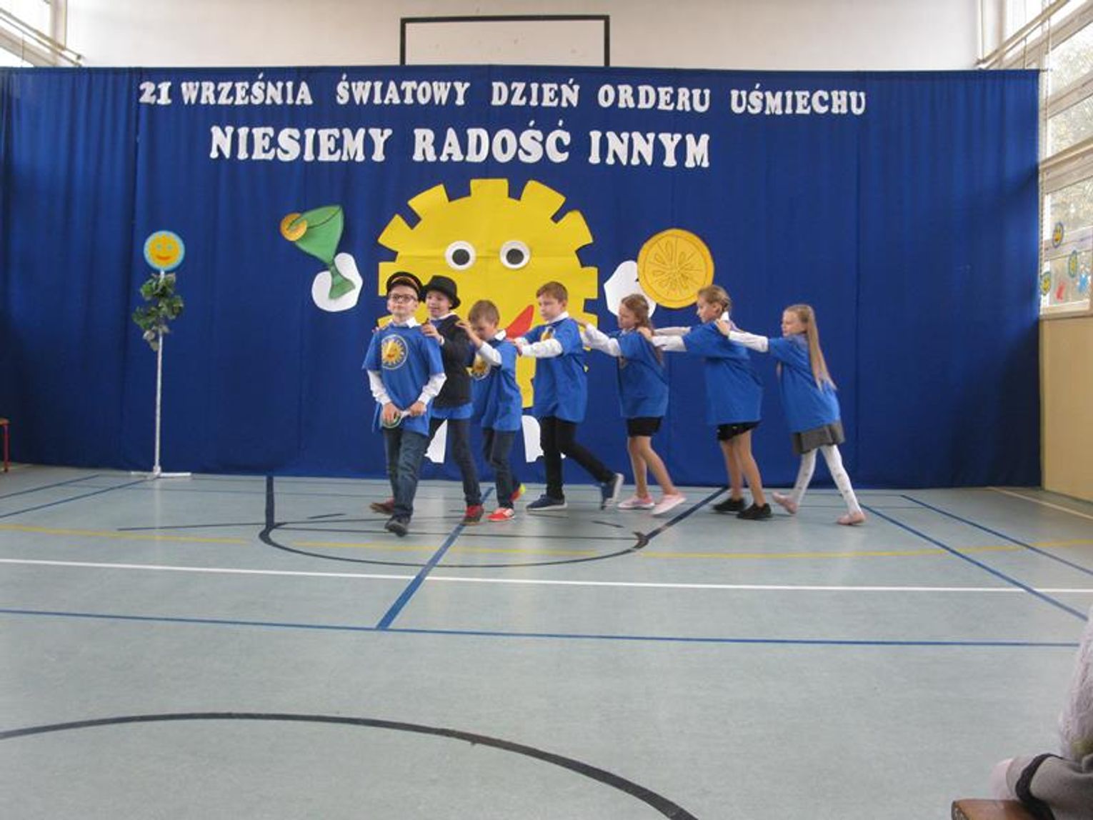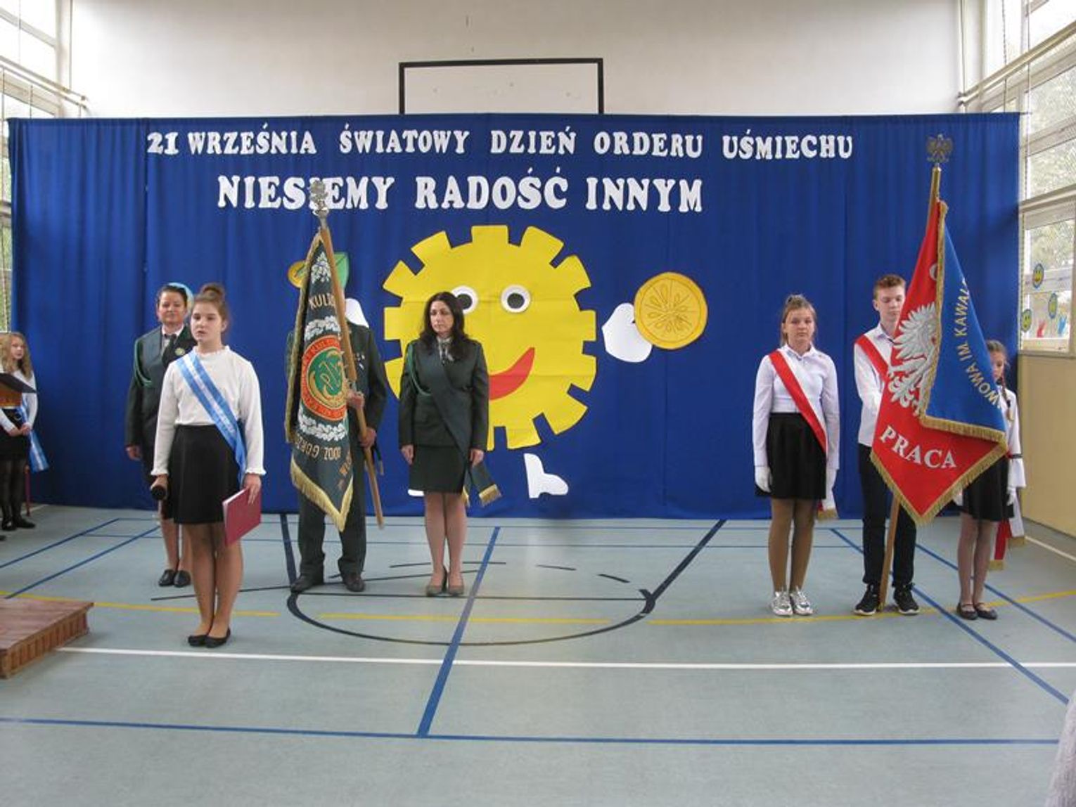 Na uroczystość przybyli Przyjaciele Szkoły, od lat współpracujący z naszą placówką. Do tego grona należą: Pani Krystyna Zioła, Pani Alicja Saja, Pani Alfreda Karmelita, Pani Emilia Więcławska, Pan Jan Bosek. Zaszczyceni zostaliśmy obecnością pokolenia Dzieci Wojny. Gościliśmy: Panią Ludwikę Powiadę, Panią Franciszkę Krakowską, Panią Irenę Fedczyszyn, Panią Antoninę Wodzińską, Panią Leokadię Lewandowską, Panią Danutę Nowak, Panią Helenę Krysztoforską oraz emerytowanych nauczycieli i pracowników szkoły, sponsorów, rodziców, dziadków, mieszkańców Stołecznej, Piaseczna, Babina i Wesołej. Wiele ciepłych słów z życzeniami i podziękowaniem za zaproszenie skierowała do nas Pani Halina Szymańska- Szefowa Kancelarii Prezydenta Rzeczypospolitej Polskiej, od której list odczytała Pani Wanda Angowska. Głos zabrała Pani Kurator podkreślając bardzo dobrą współpracę oraz obdarowała nas prezentami. Również Pan Leszek Dobrzyński przygotował dla wszystkich uczniów upominki. Społeczność szkolna zaśpiewała hymn szkoły w obecności pocztów sztandarowych - naszej szkoły oraz Klubu Kolekcjonera i Kultury Łowieckiej im. Włodzimierza Korsaka z Gorzowa. Następnie wysłuchaliśmy historii Orderu Uśmiechu o randze międzynarodowej.