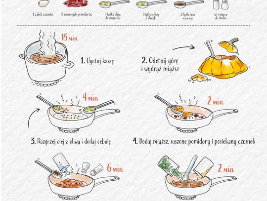 i posiekany czosnek, smażyć całość przez 2 min. Do warzyw dodać ugotowaną kaszę i podlać gorącą wodą z sosem sojowym. Doprawić solą i pieprzem. Dusić pod przykryciem ok. 5 min. Następnie dodać drobno posiekane liście jarmużu i parmezan, gotować jeszcze chwilę