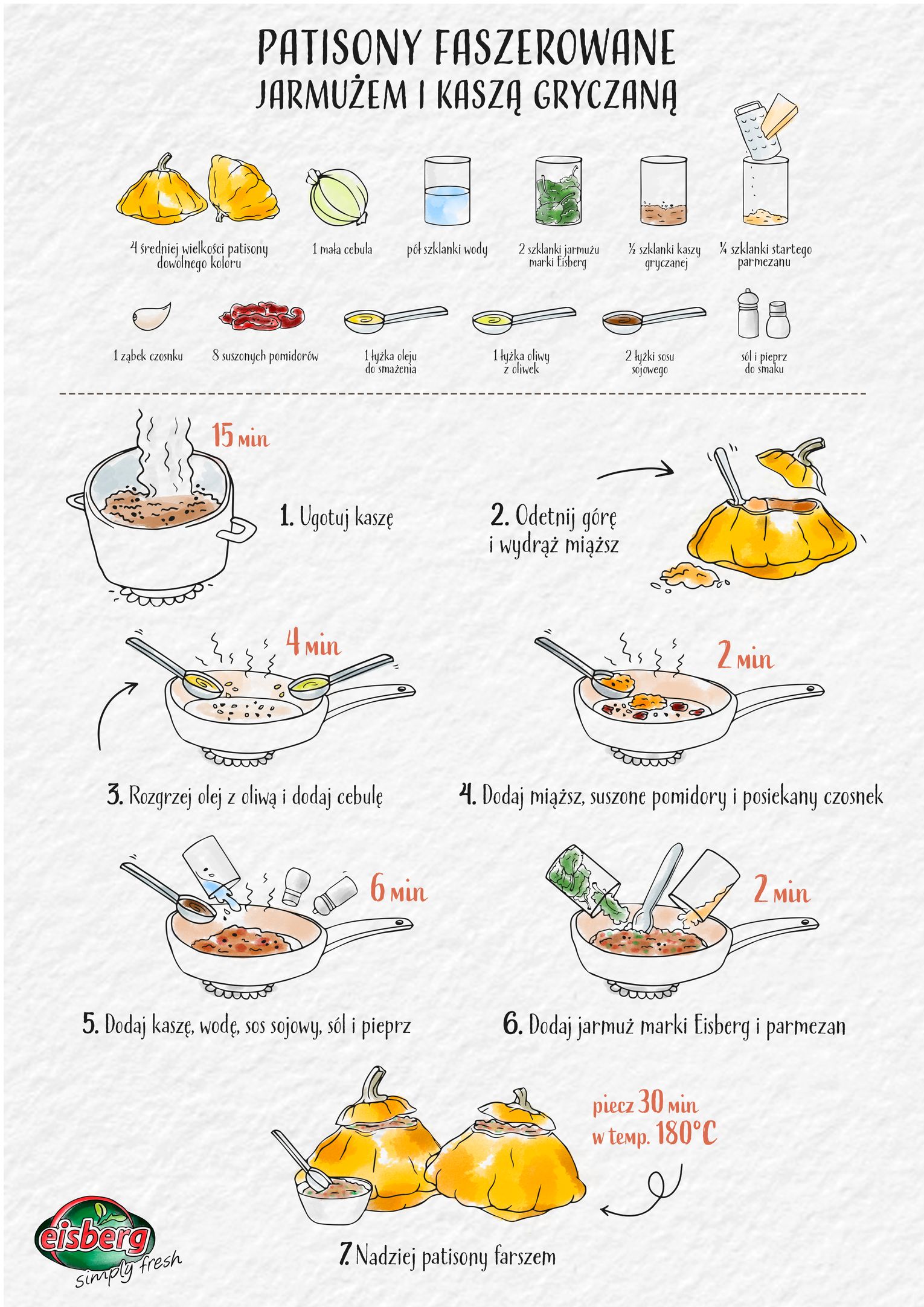 Kaszę gryczaną ugotować w osolonej wodzie (ok. 15 min). Odciąć górną część patisonów, zachowując ją na później. Wydrążyć miąższ, usunąć pestki. Miąższ pociąć na drobne kawałki. Na patelni rozgrzać łyżkę oleju i dodać posiekaną drobno cebulę. Smażyć na małym ogniu. Gdy cebula się zeszkli, dorzucić miąższ z patisona, drobno pokrojone suszone pomidory