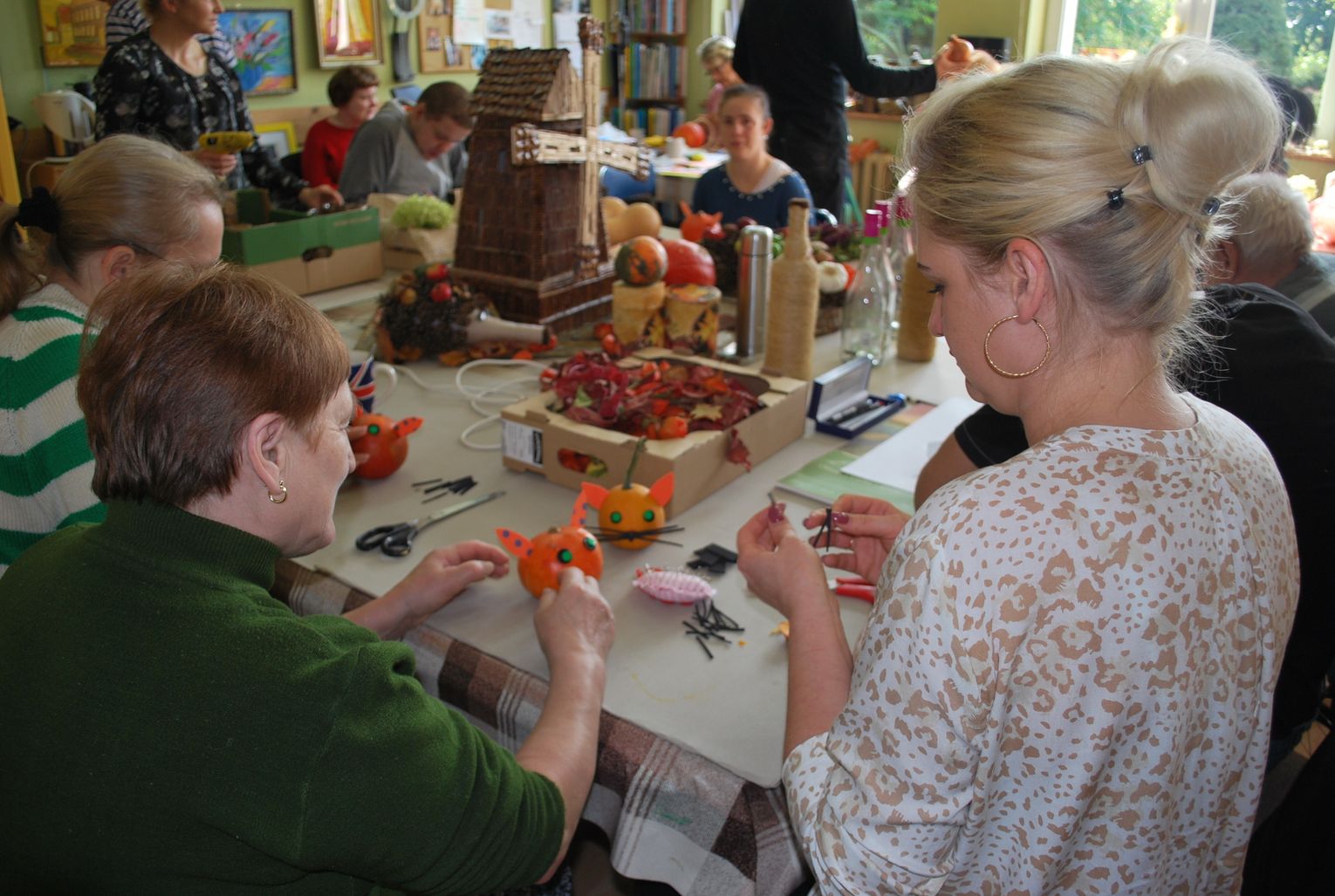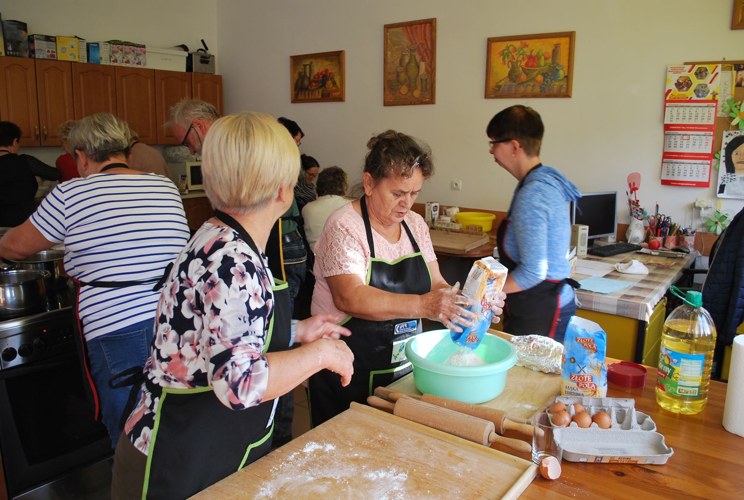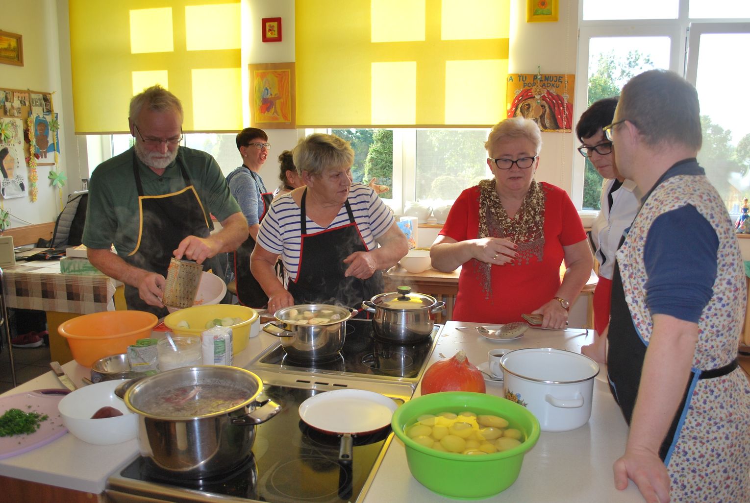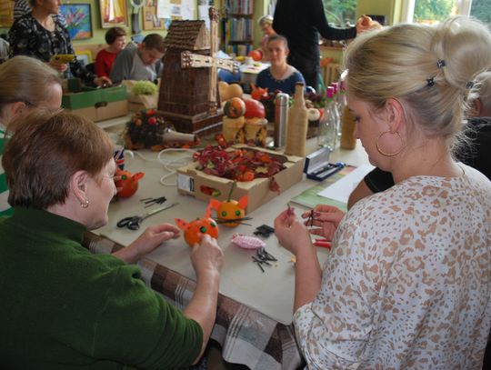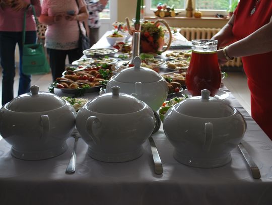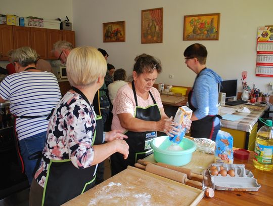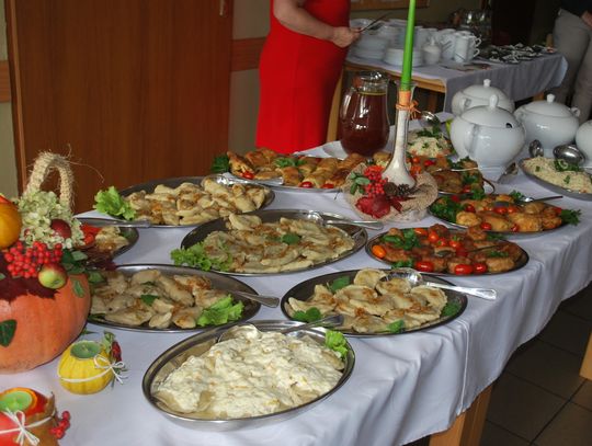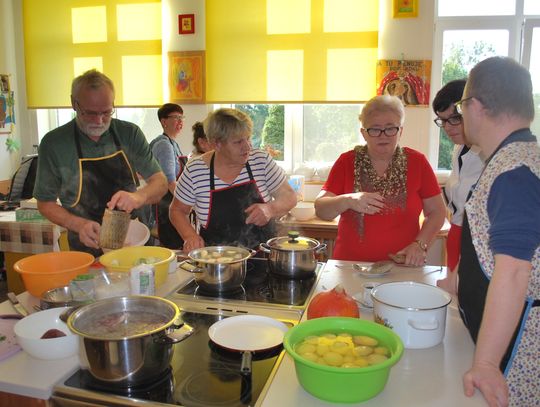 W trakcie gdy jedna grupa uczestników projektu tworzyła przepiękne prace inna grupa z pasją przygotowywała kulinarne smakołyki. Panie z Kół Gospodyń Wiejskich ochoczo przystąpiły do pracy, aby następnie wszyscy uczestnicy mogli skosztować przygotowanych specjałów. I tak powstała przepyszna jesienna zupa krem z dyni, rosół z makaronem własnej roboty, dania mięsne w tym pieczeń w sosie własnym, kotlet devolay, pieczarka faszerowana, różnego rodzaju pierogi, sałatki, surówki oraz ciasta i desery.