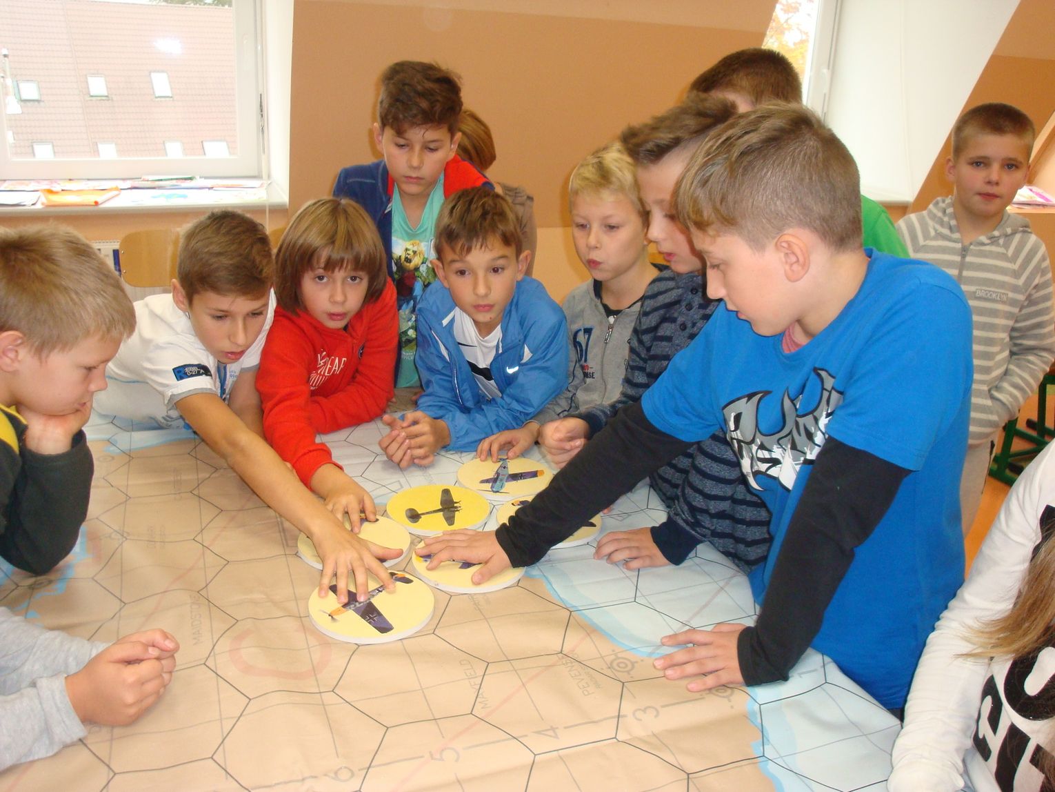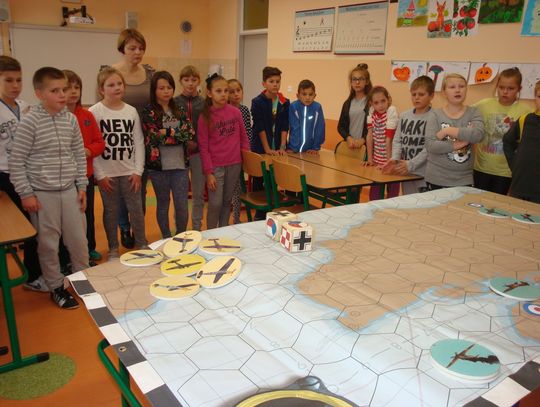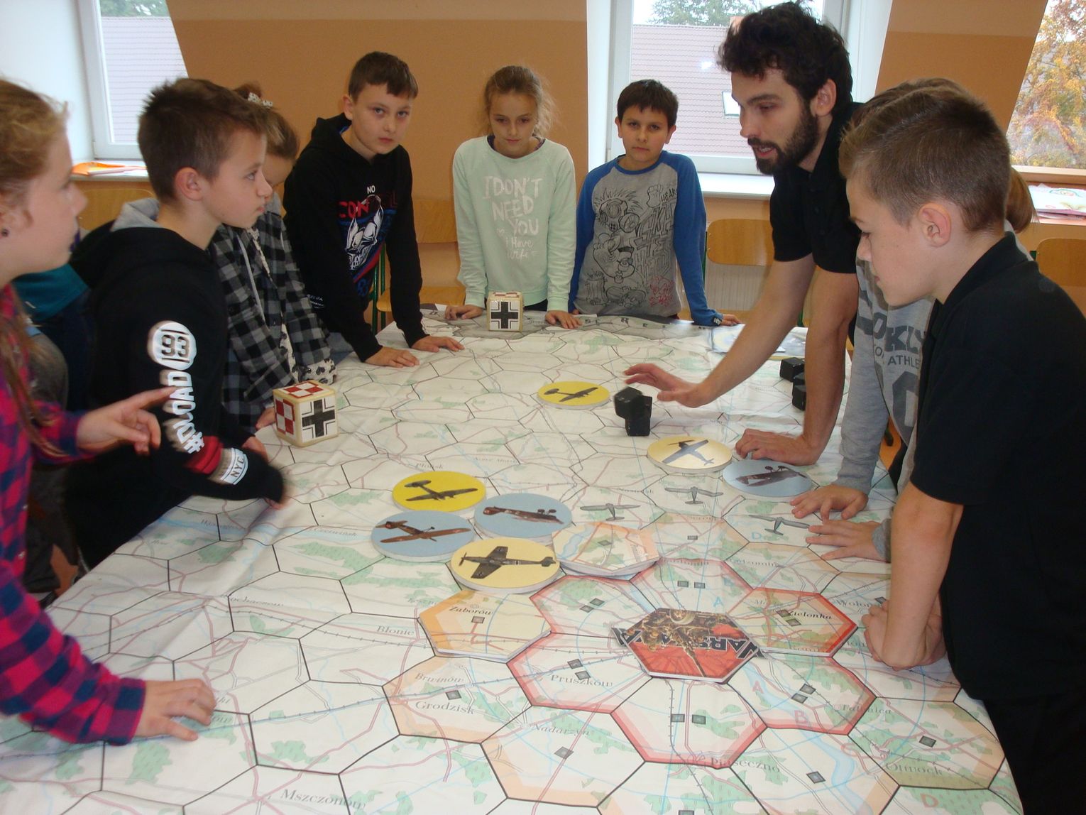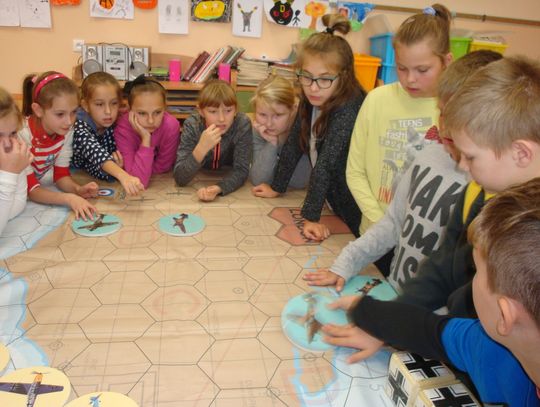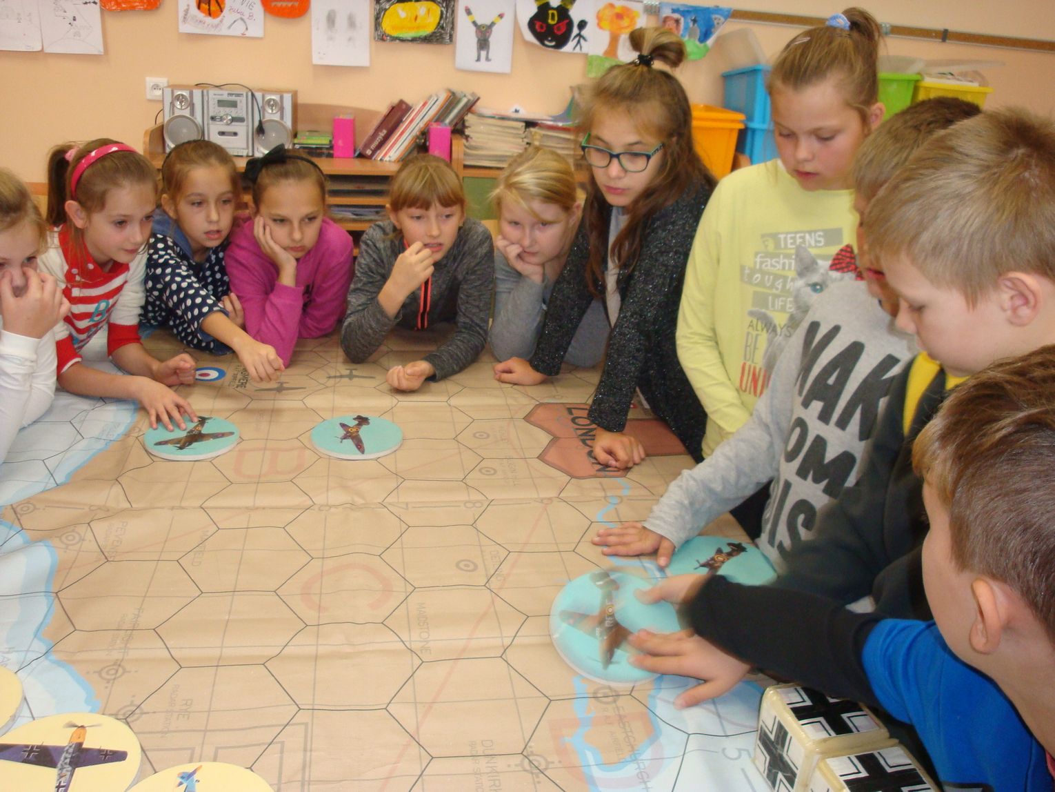 W tajniki historyczne wprowadzał uczestników gry pracownik IPN pan Mateusz Lipko. Podczas emocjonujących rozgrywek uczniowie poznawali mimochodem samoloty biorące udział w walkach, ich zasięg oraz możliwości, a także mapy wojskowe z okresu II wojny światowej oraz fakty historyczne związane z polskim lotnictwem wojskowym. Orientowali się w rozmieszczeniu polskiej obrony przeciwlotniczej. Uczyli się budować koalicje i tworzyć strategie, a także współpracować w grupie. Są to obecnie umiejętności kluczowe, którymi musi się wykazać dobry absolwent i przyszły pracownik. Ponad 80 uczniów klas 4 i 5 władało przestworzami za pomocą modeli samolotów i kostki do gry. Żadna inna forma przyswajania wiedzy nie daje tylu emocji i radości. Organizator warsztatów pani Dorota Dobak-Hadrzyńska dziękuje w imieniu uczniów pani Katarzynie Rembackiej z IPN za pomoc w organizacji warsztatów oraz panu Mateuszowi Lipko za ich przeprowadzenie. Jest to początek bardzo ciekawej współpracy Instytutu ze społecznością placówki, znajdującej się w dawnej szkole pilotów wojskowych.