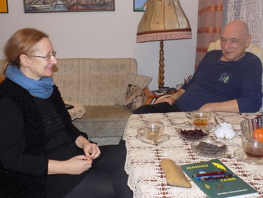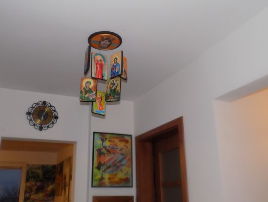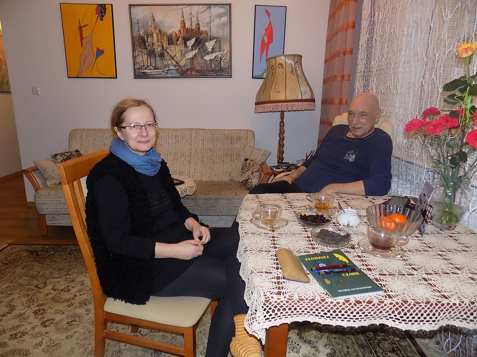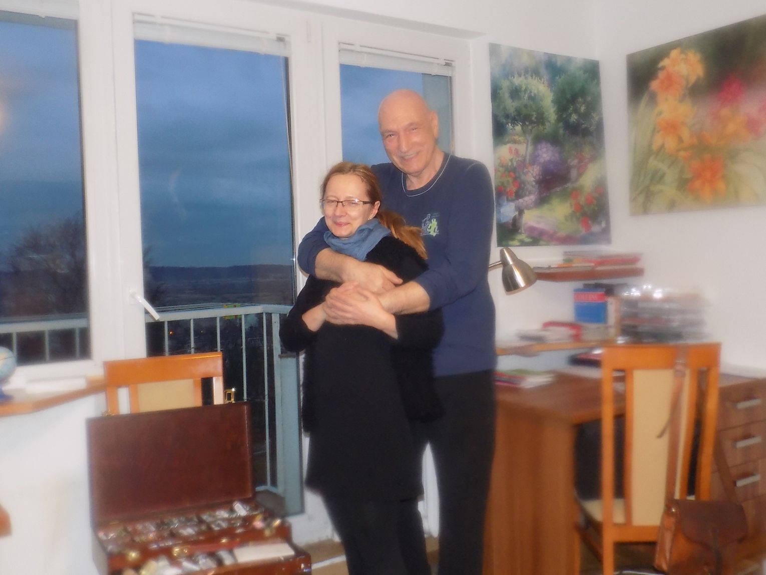Mieszkanie malarki Marii Diakowskiej i jubilera-artysty Henryka Szymanowskiego znajduje się na czwartym piętrze. Jest bliżej nieba. Księżyc tu okrąglejszy i gwiazdy większe. Szerokie okno bez zasłon, bez firan, ale za tą szybą roztacza się widok jak z pocztówki. Krajobraz przed rzeką i daleko za rzeką. W pokoju przestrzeń. Jest kącik z pędzlami, farbami, dłutami. Na ścianach zaklęte w obrazach skrawki z życia. Samotny wilk, przepiękne irysy zdające się rozsiewać zapachy, kobiety w szpilkach. I ta trochę nierzeczywista atmosfera oraz przyjemna cisza i ostrożne stąpanie kocich łapek, istniejących tylko na obrazach pani Marii.