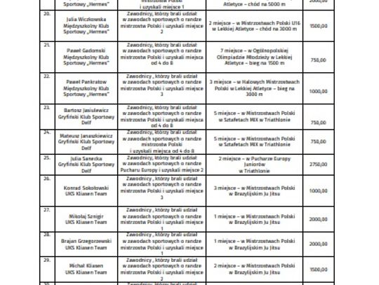 Listę zawodników, którzy osiągnęli wysokie wyniki we współzawodnictwie międzynarodowym lub krajowym w roku 2019 wraz z wysokością nagród publikujemy w fotogalerii i załączniku pdf.