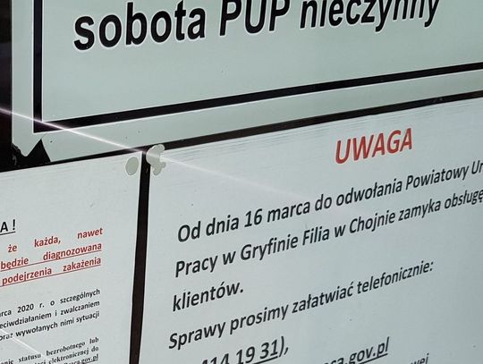 Sprawa dotyczy Powiatowego Urzędu Pracy w Gryfinie filii w w Chojnie. Drzwi faktycznie były zamknięte. Patrzymy przez okno, pracownicy PUP pracują. Na drzwiach informacja, że urząd zamknięty dla petentów i podany jest numer telefonu do kontaktu. Na stronie internetowej w nieco zagmatwanym komunikacie dowiadujemy się, że jest "brak możliwości osobistego zgłaszania się do urzędu".