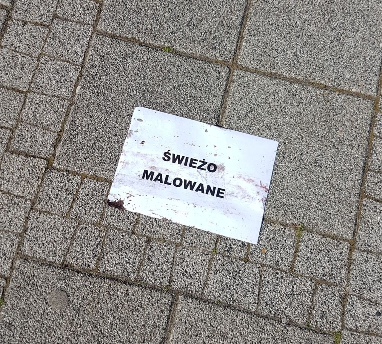 Rzeczywiście, farbą pochlapana jest kostka wokół ławek. A kartki z ostrzeżeniem, że świeżo malowane leżą przez chwilę na ziemi, dopóki nie zostaną zdmuchnięte przez wiatr.