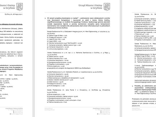 Pismo wiceburmistrza Pawła Nikitińskiego przedstawiające wykaz sprzętu komputerowego w placówkach oświatowych zamieszczamy w fotogalerii oraz na kolejnych stronach niniejszego arykułu.