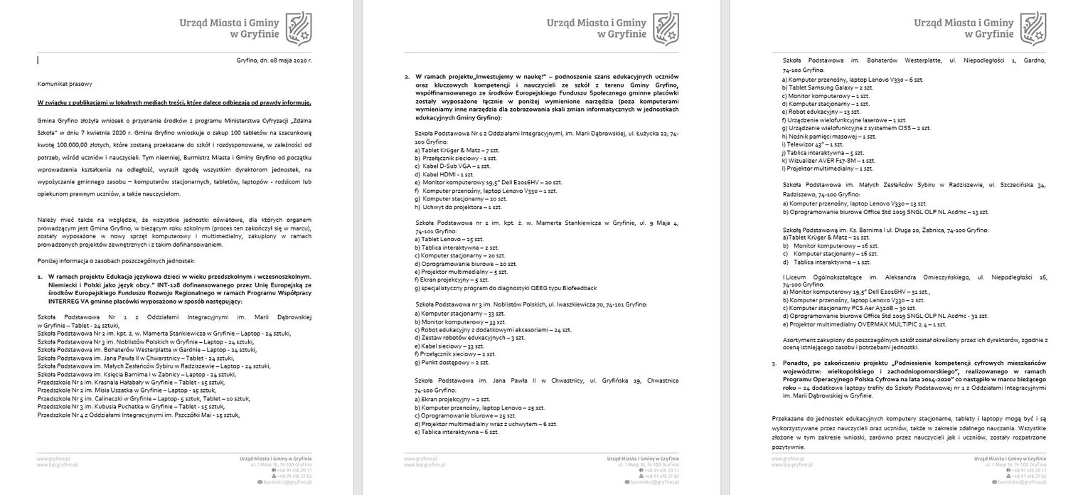 Jednak gminy Gryfino nie ma w wykazie samorządów, które otrzymały laptopy. To jedyna taka gmina w powiecie gryfińskim. Wykaz taki otrzymaliśmy do publikacji 4 maja 2020 r. z Zachodniopomorskiego Kuratoroim Oświaty.