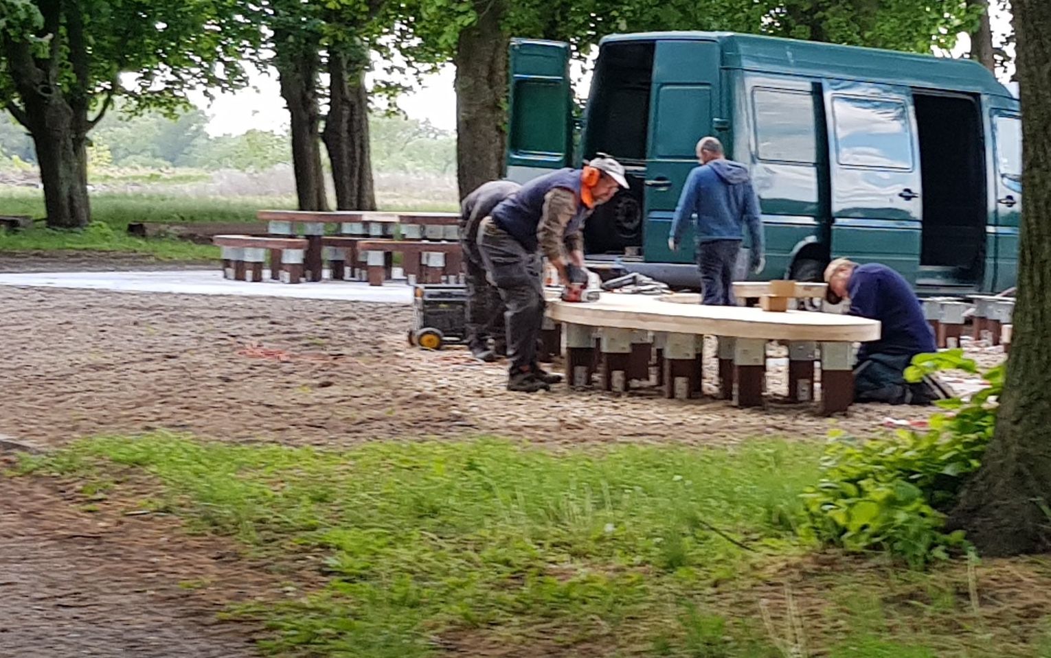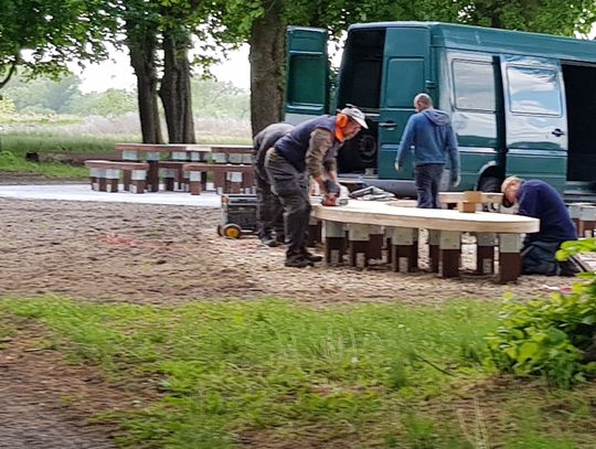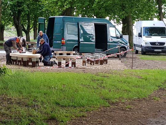 Elementy drewniane zaczęto od postawienia ław, bo gdy przyjdzie zadaszenie już tyle miejsca nie będzie.