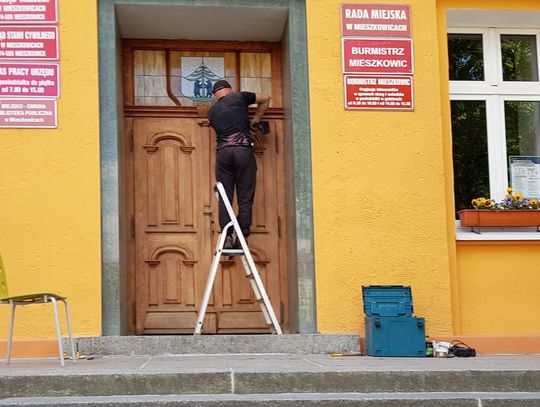 Mowa tu o Urzędzie Miejskim w Mieszkowicach. Są tu oryginalne drzwi. I właśnie elementy drewniane poddano zabiegom. Oddzielna sprawa to oryginalna klamka. Ona też jest małym dziełem sztuki. Mamy nadzieję, że wróci na swoje miejsce…